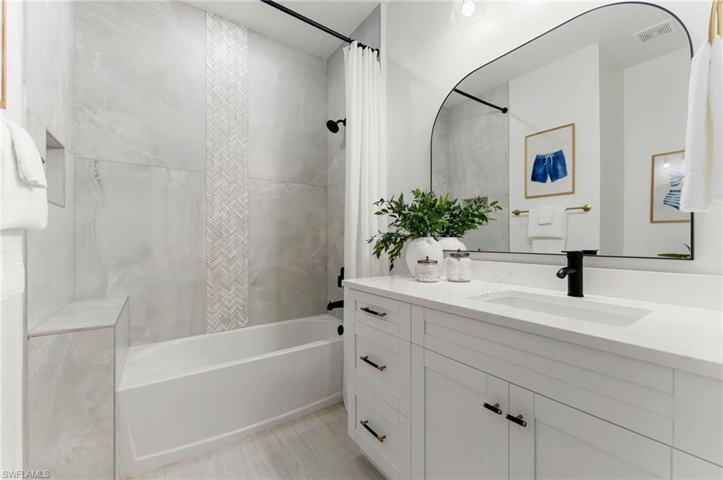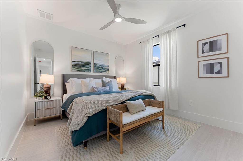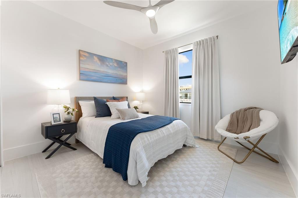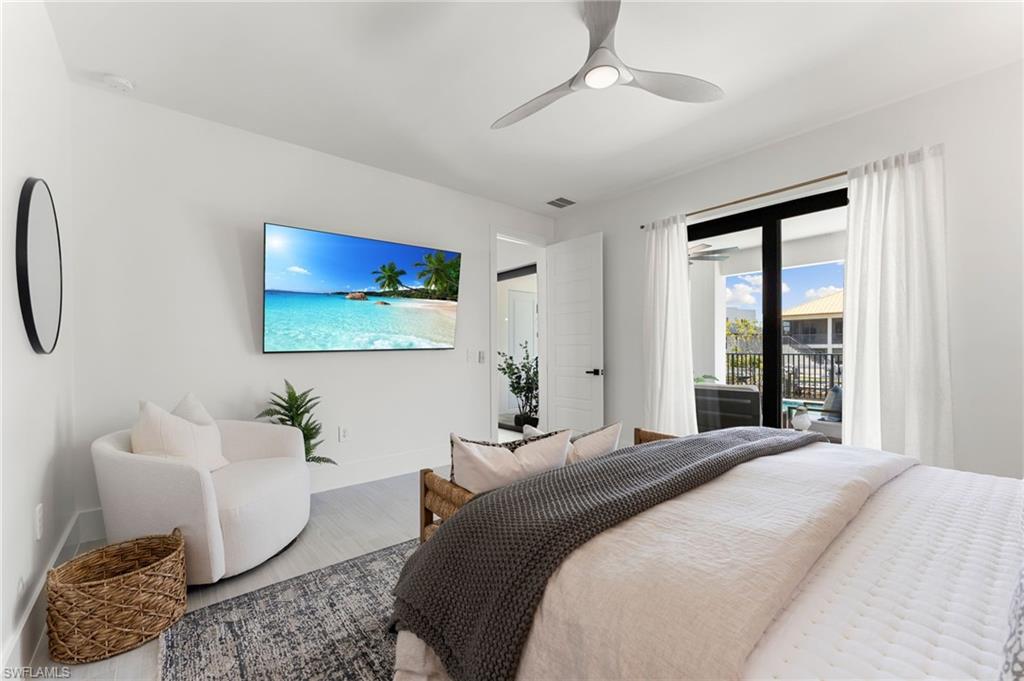 This 2025 new construction 4 bedroom waterfront home offers it all including: perfect Collier County location in Little Hickory Shores on a wide canal, walk or bike to beautiful Barefoot Beach, premier boating out your back door via a new dock and lift with no bridges and quick gulf access, southern exposure, light coastal design inside and out, open floor plan and designer selections throughout, but best of all is PEACE OF MIND with a Tesla roof and battery pack so no generator or propane tanks and lines to worry about and no electric outages, concrete construction to the latest hurricane codes including impact windows and doors and the whole house including the garage and pool were constructed at an elevation above FEMA requirements so flooding is not an issue all while constructed on one level for ease of living. Features include great room, kitchen and dining all open to covered lanai leading to the swimming pool and deck area all overlooking the water and boat dock, volume & vaulted ceilings, large kitchen with island, pantry, quartz countertops custom double stacked Kitchen cabinetry, porcelain wood plank flooring, 8’ doors, smooth drywall finish and designer bath selections. The elevated pool with sundeck includes an oversized covered patio with access to a convenient pool bath. The spacious master suite offers 2 walk in closets with built-ins, oversized frameless shower and floating tub with dual vanities and the 3 guest rooms include an additional en-suite bath. The oversized garage also above flood is finished with epoxy flooring. Little Hickory Shores is centrally located to dining, entertainment, golfing, arenas in Naples and Bonita Springs and is close RSW Airport, the Promenade, Coconut Point, Mercato & Waterside Shops and Old Naples. There is also an option to join the Club at Barefoot Beach which offers casual and fine dining restaurants, pool & beachside food, drinks and chair service, indoor & outdoor bars, tennis courts with pro & a full events calendar. (waitlist with usage during wait period). Note: This property is a perfect full time homestead residence or winter home residence with no worries while away during the summer, a come and go property that earns enough to carry itself when you are not in residence or a full time rental property since no rental restrictions and no HOA fees. Designer turnkey furniture and furnishings package can be purchased for $99,900