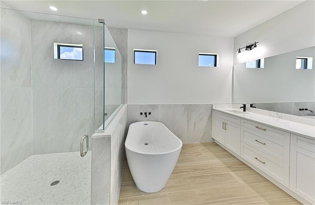 This 2025 new construction 4 bedroom waterfront home offers it all including: perfect Collier County location in Little Hickory Shores on a wide canal, walk or bike to beautiful Barefoot Beach, premier boating out your back door via a new dock and lift with no bridges and quick gulf access, light coastal design inside and out, open floor plan and designer selections throughout, but best of all is PEACE OF MIND with a Tesla roof and battery pack so no generator or propane tanks and lines to worry about and no electric outages, concrete construction to the latest hurricane codes including impact windows and doors and the whole house including the garage and pool were constructed at an elevation above FEMA requirements so flooding is not an issue all while constructed on one level for ease of living. Features include great room, kitchen and dining all open to covered lanai leading to the swimming pool and deck area all overlooking the water and boat dock, volume & vaulted ceilings, large kitchen with island, pantry, quartz countertops custom double stacked Kitchen cabinetry, porcelain wood plank flooring, 8’ doors, smooth drywall finish and designer bath selections. The elevated pool with sundeck includes an oversized covered patio with access to a convenient pool bath. The spacious master suite offers 2 walk in closets with built-ins, oversized frameless shower and floating tub with dual vanities and the 3 guest rooms include an additional en-suite bath. The oversized garage also above flood is finished with epoxy flooring. Little Hickory Shores is centrally located to dining, entertainment, golfing, arenas in Naples and Bonita Springs and is close RSW Airport, the Promenade, Coconut Point, Mercato & Waterside Shops and Old Naples. There is also an option to join the Club at Barefoot Beach which offers casual and fine dining restaurants, pool & beachside food, drinks and chair service, indoor & outdoor bars, tennis courts with pro & a full events calendar. (waitlist with usage during wait period). Seller will install a turnkey furnishings package for $99,900 if desired. Note: This property is a perfect full time homestead residence or winter home residence with no worries while away during the summer, a come and go property that earns enough to carry itself when you are not in residence or a full time rental property since no rental restrictions and no HOA fees.