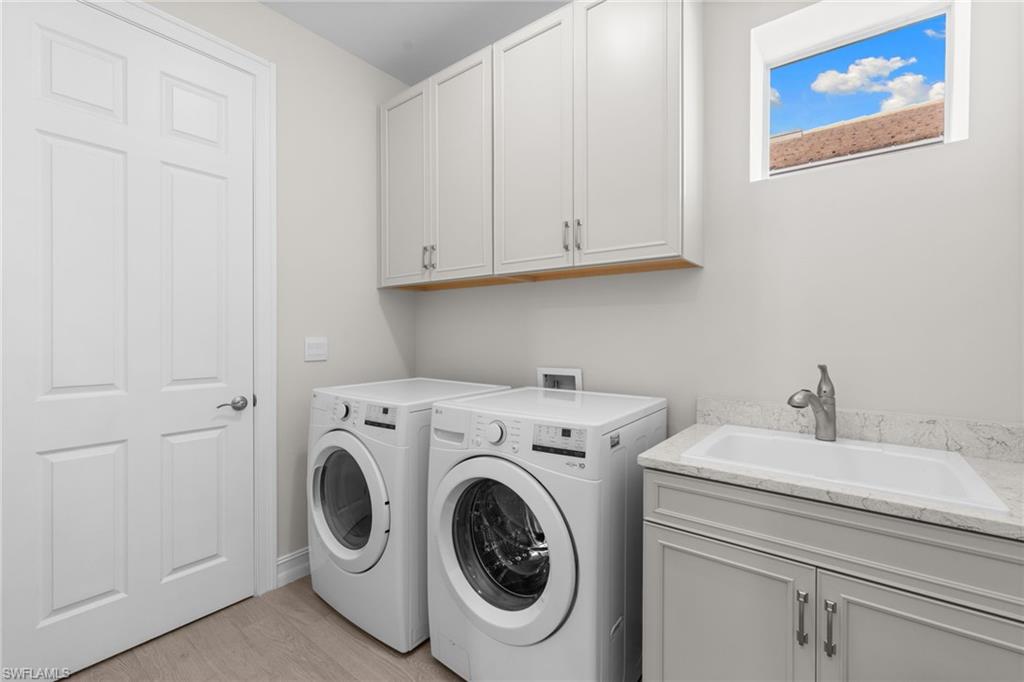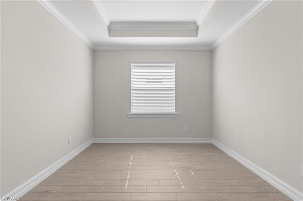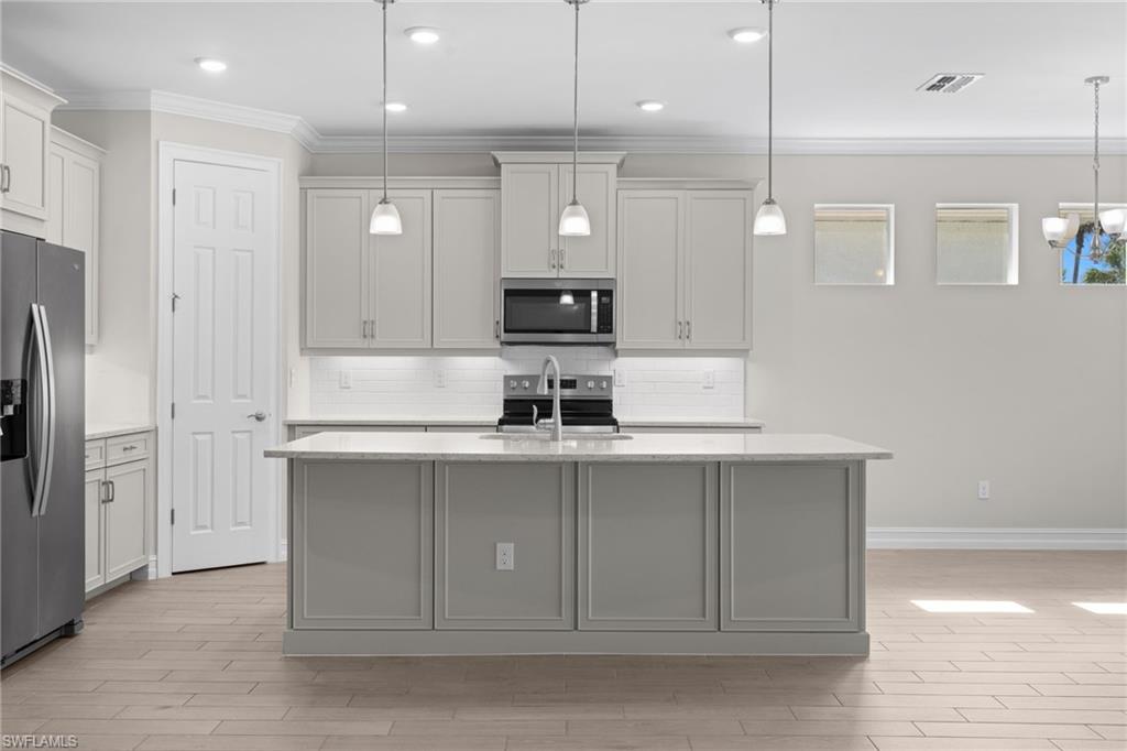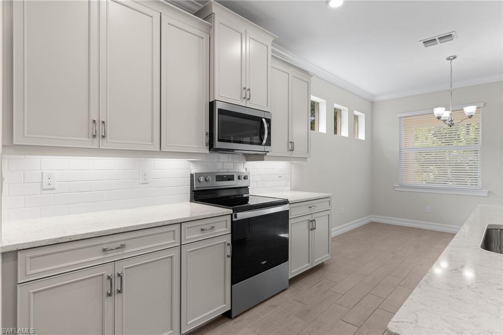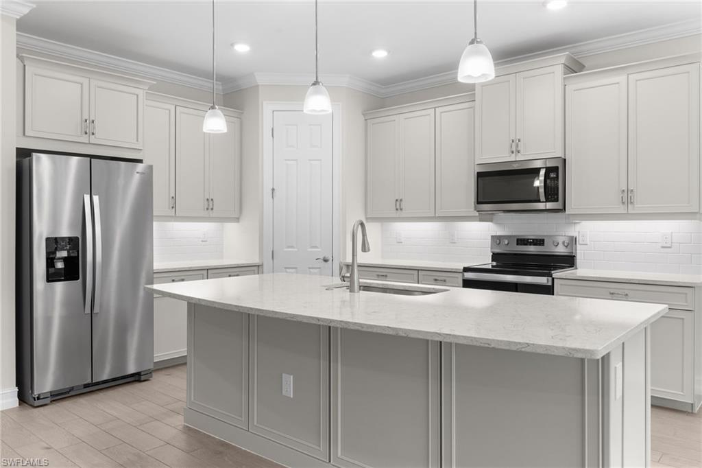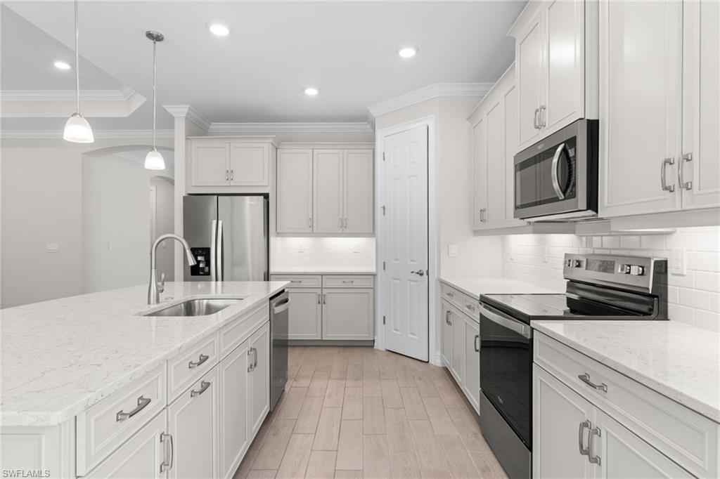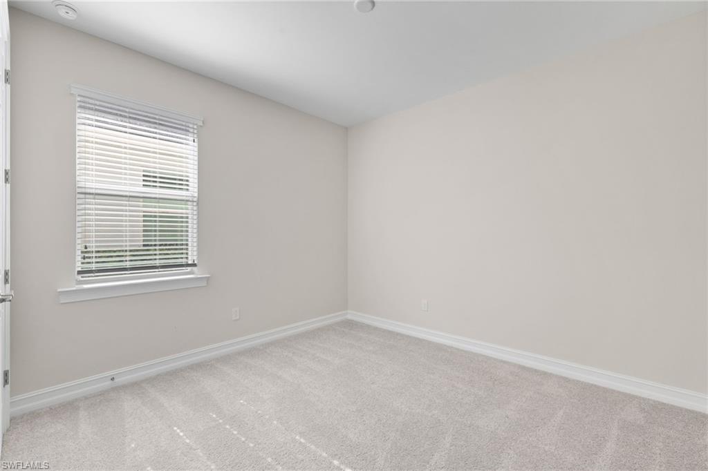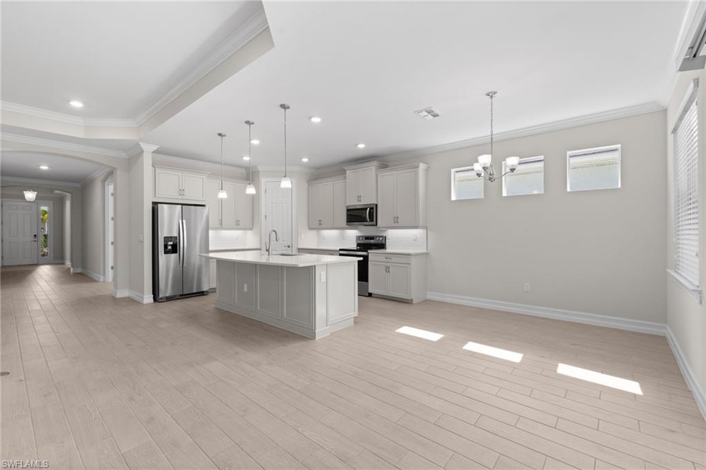 Newer construction 2023! This beautifully designed Shelby model features 3 bedrooms, a private den, and 2.2 baths(Outdoor Pool Bath), plus a spacious foyer and wide hallway for a bright, open feel. The well-planned layout offers the primary suite split from the secondary bedrooms, ideal for privacy. Set on a south-facing private lot in a premier South Naples location and Flood Zone X, this home is a standout choice for those who love the peace of mind, efficiency, and fresh finishes that new construction delivers. The open-concept design highlights high ceilings, crown molding, tray ceilings in both the living area and primary bedroom, and durable gray wood-look tile flooring throughout. The chef’s kitchen features a large quartz island with seating, Whirlpool stainless steel appliances, soft-close cabinetry with crown molding, a walk-in pantry, and designer pendant lighting—creating the perfect space for entertaining or relaxing at home. The expansive primary suite offers dual vanities with quartz countertops, a soaking tub, large walk-in shower with a bench, and a private water closet. The laundry room includes front-loading washer and dryer, upper cabinetry, and a utility sink. Additional highlights include impact windows, recessed lighting, a smart home system with Qolsys IQ panel, and an oversized 32.6’ deep garage—perfect for a golf cart, toys, or extra storage. Located in a smaller, well-maintained community of just 251 homes, this neighborhood offers a rare combination: resort-style amenities with low quarterly HOA fees. Enjoy a clubhouse, resort pool, pickleball, bocce, and game room—all included in a fee of just $903/quarter, which also covers irrigation and lawn care. Additionally, flexible leasing allows for up to three rentals per year, each with a 30-day minimum. This home is conveniently located approximately 9 miles from 5th Avenue, 13 miles from Marco Island, and 5 miles from I-75, providing fast access to Naples' best beaches, dining, shopping, and medical services. Move-in ready, thoughtfully designed, and located in one of South Naples’ most accessible communities—don’t miss this exceptional opportunity.