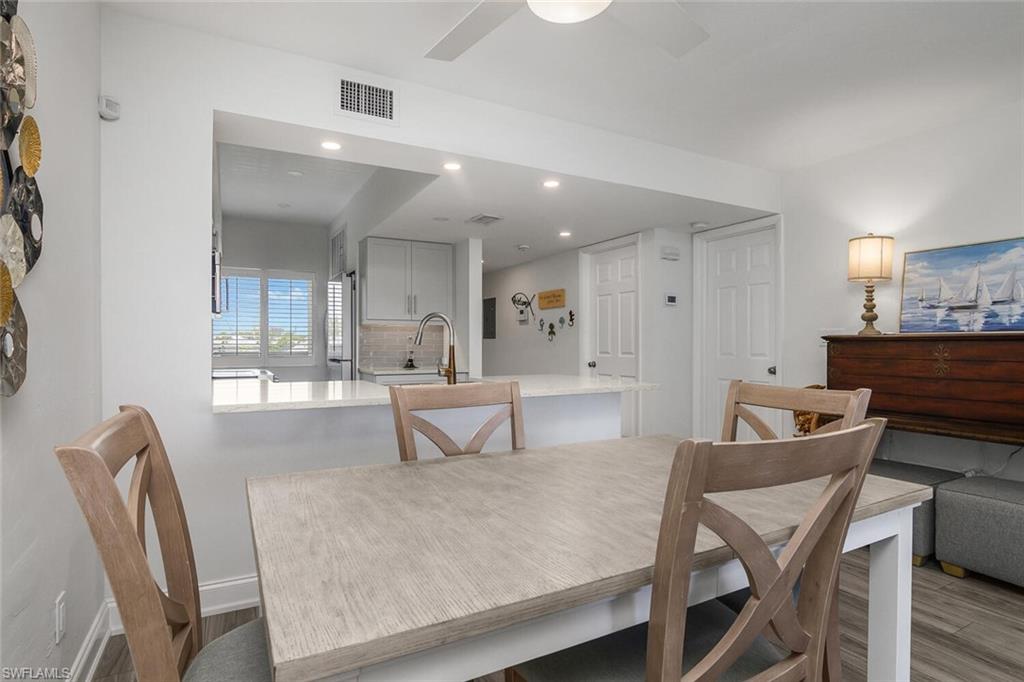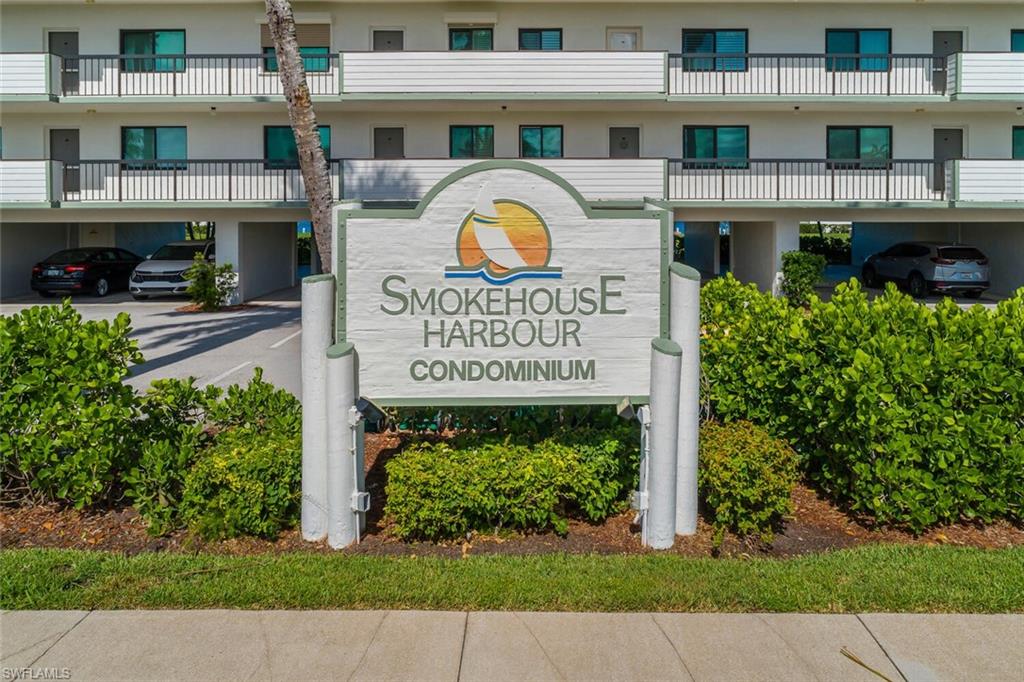 Welcome to Smokehouse Harbour, a stunning condominium conveniently located in the heart of the Island where all your needs are at arms length. This beautifully refurbished 2-bedroom, 2-bath unit perfectly blends comfort, security, and style and is offered turn key. The neutral and smooth decor enhances the breathtaking views of the lush landscape, pool, and bay. Completely renovated in 2022, this unit features impact glass, auto shade, and a security system for your peace of mind. The kitchen is a highlight, showcasing slow-close cabinetry, a farmhouse sink, and a spacious quartz island, making it both beautiful and functional. The wood-look tile flooring extends seamlessly throughout the unit, including the lanai, while Bahama shutter window treatments add a touch of elegance. The stocked galley kitchen is a chef's dream, offering fantastic counter space, a stylish subway tile backsplash, and a glass refrigerator. The Bosch stacked laundry unit is conveniently tucked away, complemented by an abundance of natural light that fills the space. The spacious primary suite is a true retreat, featuring a custom built walk in closet, double quartz vanity and an impressive stone walk-in shower with a stunning barn glass door and high-quality stainless steel hardware. The new sleep number bedding can accommodate either a king or two singles, providing flexibility for your comfort. Don't miss the opportunity to make this exquisite condominium your new home. Experience the perfect combination of luxury and tranquility at Smokehouse Harbour!