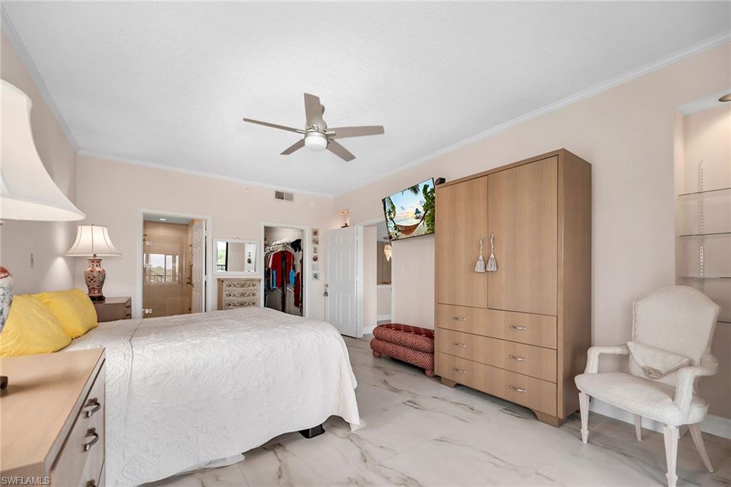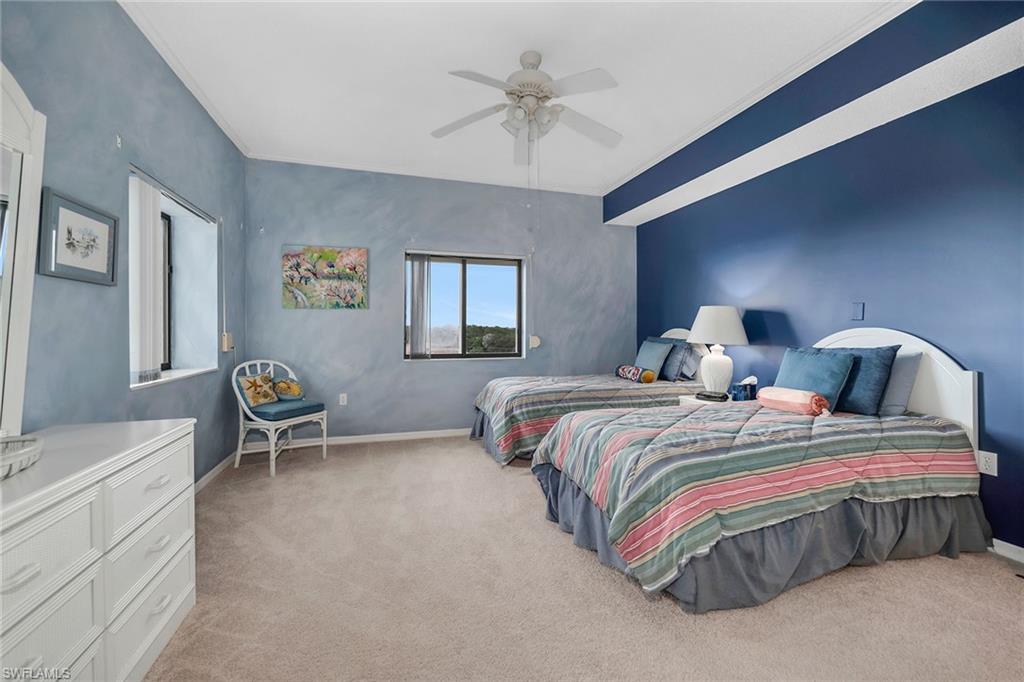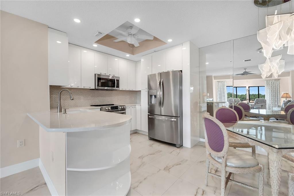 Experience elevated coastal living and breathtaking Gulf views with stunning sunsets from this exceptional top-floor, three-bedroom, 2.5-bath corner residence in Arbor Trace, offering expansive panoramas and total privacy. Meticulously renovated with refined finishes, the home features a one-car garage and a serene screened lanai overlooking lush landscaped grounds. Inside, discover a modern open-concept kitchen adorned with soft-close high-gloss white cabinetry, Silestone countertops, a shimmering mother-of-pearl backsplash, and premium stainless steel appliances. The adjacent dining area is enhanced with a custom mirrored wall, while the spacious living room flows seamlessly to the enclosed Florida room-style lanai, ideal for year-round enjoyment with its glass sliders and screen enclosure. The primary suite offers direct lanai access, a large walk-in closet with built-ins, and a luxurious ensuite bath with dual vanities, a makeup station, and a walk-in shower with floor-to-ceiling tile, bench, and frameless glass enclosure. A private guest suite includes a full bath with a shower/tub combo, and a third bedroom adds flexibility for guests or a home office. Rich 30-by-30-inch porcelain tile floors, custom trim, and crown molding create an atmosphere of elegance throughout. Additional highlights include a new air-conditioning system, in-unit washer and dryer, indoor storage unit, and proximity to the resort-style pool, clubhouse, and dining room. This 55-plus senior living community offers fee-simple, deeded ownership with 100% equity and low property taxes. Monthly fees include fine dining with 120 meals per year, water, electricity, fiber-optic internet and TV, scheduled transportation, emergency monitoring, and access to enriching activities such as Hodges University classes. Optional housekeeping and maintenance services are available, and residents enjoy full access to tennis, bocce, fitness facilities, a putting green, walking paths, and a scenic five-acre lake. Arbor Glen, the on-site assisted living facility, ensures peace of mind with priority placement should future care needs arise. Positioned near Vanderbilt Beach and the best of North Naples, this residence offers the rare opportunity to enjoy independent homeownership with the security and lifestyle of a full-service, resort-inspired community.
