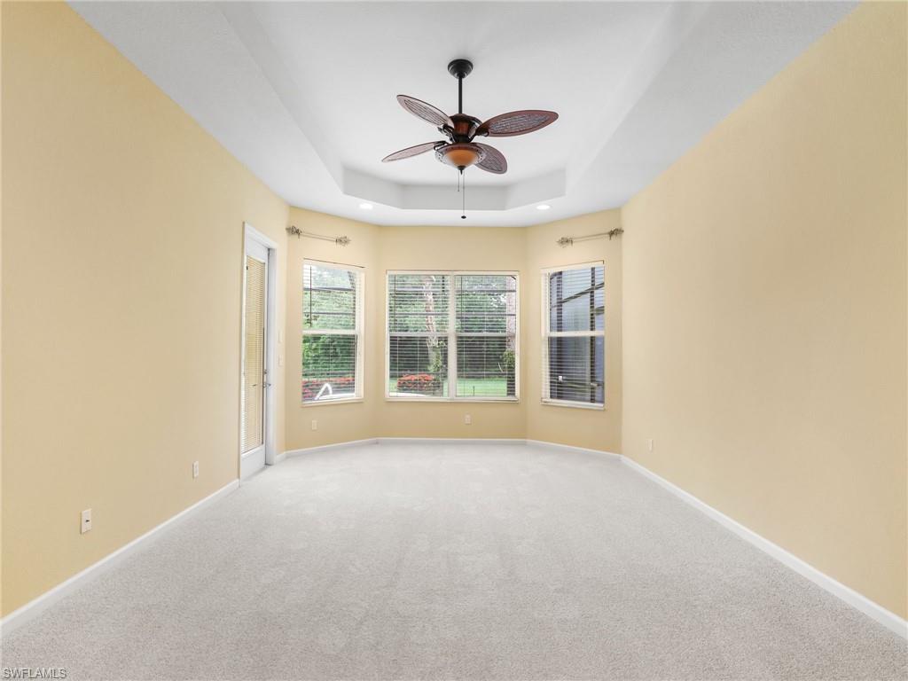 This spacious bright Revere Model at Madison Park shows off its Great Room and Split Floor Plan with over 2,400 square feet of living space. The three bedrooms and large den with three and a half bath home offers many nice touches such as crown molding, Moen faucets, real wood kitchen cabinets/bathroom cabinets and Marble windowsills. The large Primary Bedroom has two walk-in closets and large bathroom with tub and separate shower. Two other bedrooms are newly carpeted and painted. Each bedroom has its own bathroom. The large Den has a hardwood floor and overlooks the beautifully landscaped front yard. This was originally a Centex Model Home and has many builder upgrades including an oversized air-conditioned garage. The large, screened lanai is great for outside entertaining with a heated pool and spa. A child proof pool fence included. The house is on a privacy lot with a large backyard that backs up to a tree line at the rear of the property. The home had many updates over the past few years including: New roof 2018, New 5-ton A.C. 2022, New Kitchen Appliances 2020-2023, New Hot Water Tank 2023, New Garage A.C. 2023, New Pool Pump 2023, Ring Doorbell 2024, Nest Thermostat 2024, New Carpet 2025, New Pool Valves & External Piping 2025. Low HOA Fees include lawn care, high speed fiber internet, tree trimming and outside maintenance. Madison Park is centrally located to Marco Island, Downtown 5th Ave, Restaurants, shopping, beaches and so much more!