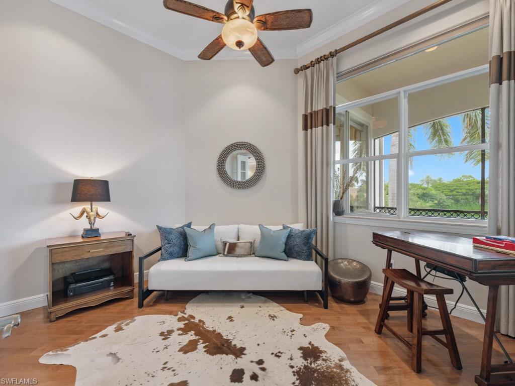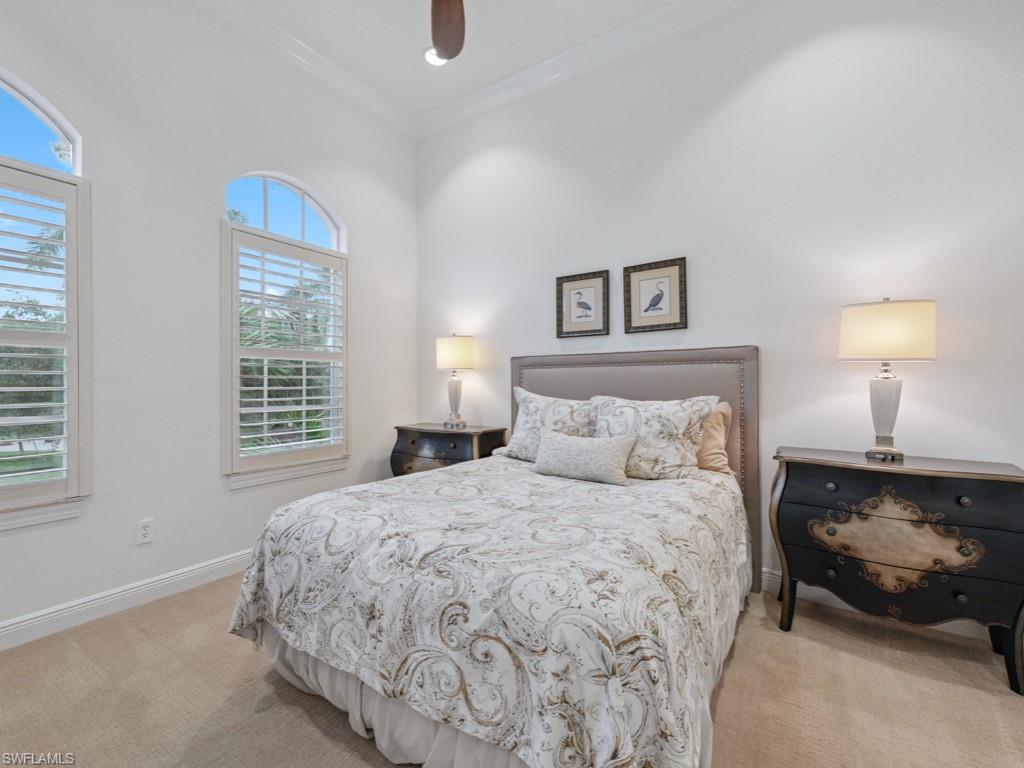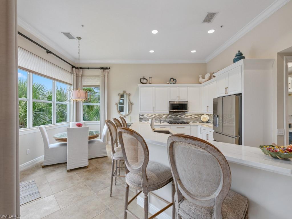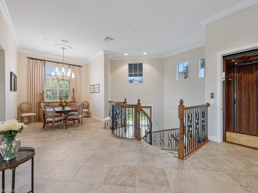 NO WAITING! GOLF MEMBERSHIP SLOT AVAILABLE IMMEDIATELY! Located in the prestigious golf & country club community of Mediterra in Naples, FL. Elegantly updated and move-in ready, this exceptional second-floor coach home in Mediterra offers timeless luxury and effortless comfort. Arrive through your private elevator to a light-filled open layout featuring three spacious bedrooms, a versatile den, and a two-car attached garage. The updated kitchen is stunning, featuring quartz countertops, soft-close cabinetry, stainless steel appliances, and a built-in wine cooler. The expansive living area boasts soaring tray ceilings and opens seamlessly to a large screened lanai with peaceful lake views. The primary suite is a private retreat with hardwood floors, oversized windows, lanai access, and a spa-worthy updated bathroom complete with a freestanding tub, two vanities, and a striking walk-in shower. Additionally, it features a laundry room with built-in cabinetry and a prep sink, a stylish breakfast nook, and upgraded finishes throughout. The home is also just steps from the neighborhood pool and spa in Calabria. Mediterra is a prestigious luxury golf & country club community featuring Two championship Tom-Fazio golf courses for avid golfers, a private beach club with restaurant & bar, multiple tennis courts, pickle-ball & bocce, fitness center, pristine bike & jogging trails, and luxurious dining at the private country club restaurant. The Mediterra Beach Club offers an escape to a 10,000 sq. ft two-story private oceanfront paradise on the Gulf of Mexico. Featuring a restaurant & bar that serves members via indoor & outdoor dining, this private facility boasts a heated swimming pool, a sundeck, and cabana beach service for chairs, umbrellas & refreshments.