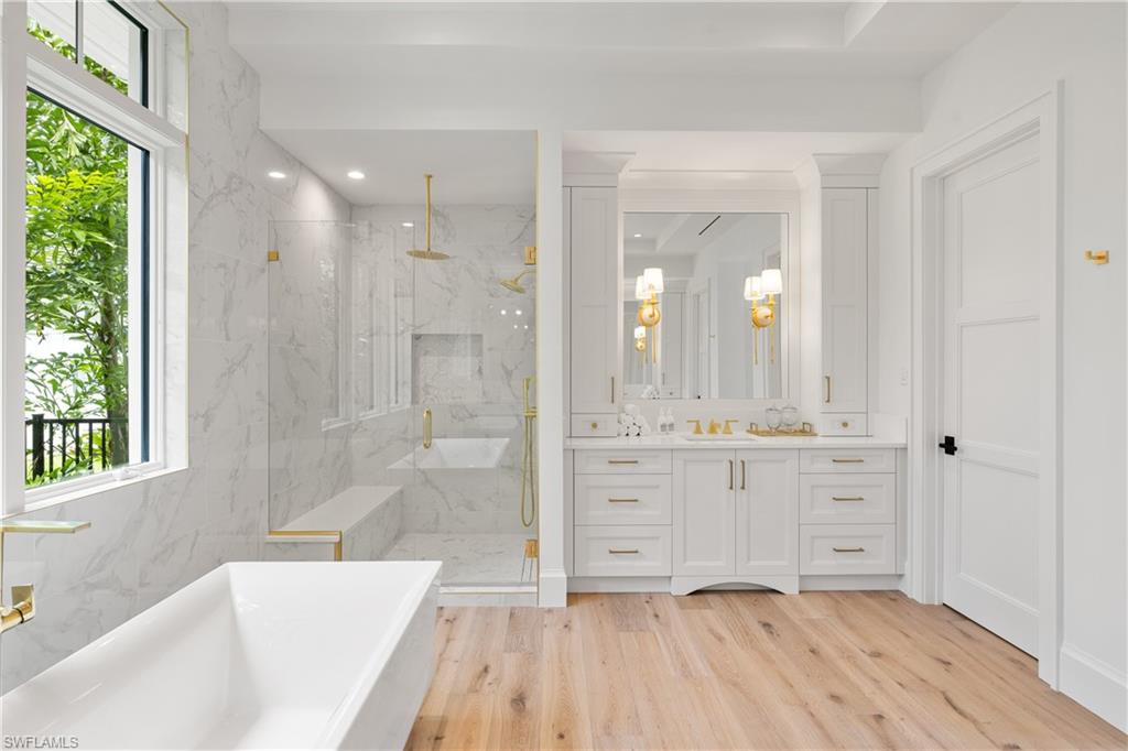 Newly constructed, never lived in and move-in ready, ideally situated on an oversized premium corner lot, this luxurious new-construction residence embodies the spirit of Naples living. Designed by MHK in collaboration with Waterside Builders and Diana Horsley Interiors, the spectacular light-filled six-bedroom + den home flows gracefully from one engaging space to another. Finished to the highest standard, the open floor plan with voluminous ceilings features multiple fireplaces, European oak floors, Ruben Sorhegui tile, quartz counters, elevator, and generator. Chef’s kitchen offers Subzero, Wolf and Miele appliances, large center island and generous butler’s pantry with additional storage and appliances. A full wall of pocketing glass sliding doors leads to spacious outdoor covered living areas, including an outdoor lounge, dining area, summer kitchen, half bath, and heated pool and spa with western exposure. First-floor primary retreat includes substantial dual walk-in closets and a spa-like ensuite bath with separate water closets. Bonus room, wet bar, balcony, laundry and five additional en-suite bedrooms, including a cabana/VIP suite with private entry, provide comfortable accommodations for guests on the second level. In close proximity to 5th Avenue S, Third Street S and sugar sand beaches, this home represents a rare opportunity to enjoy the best Naples has to offer.