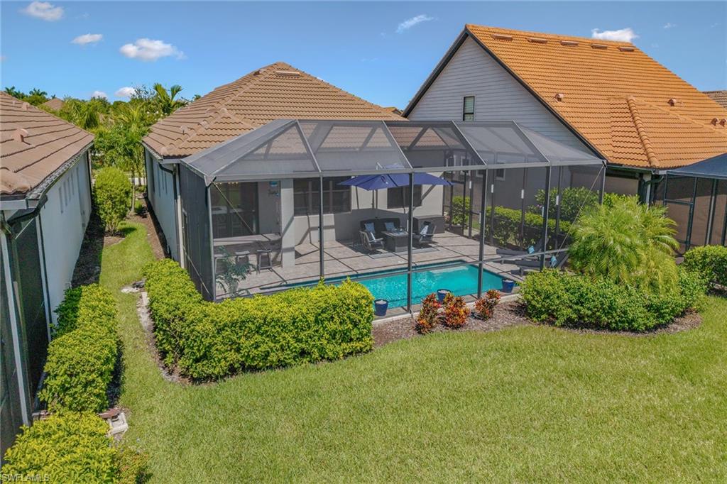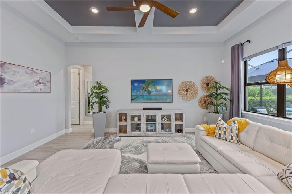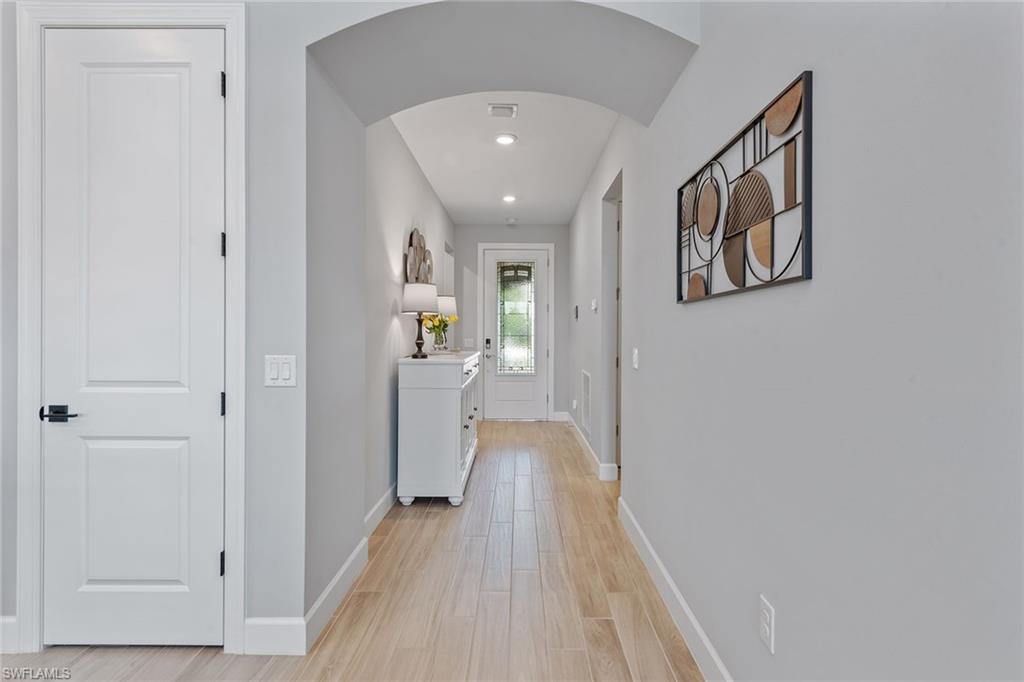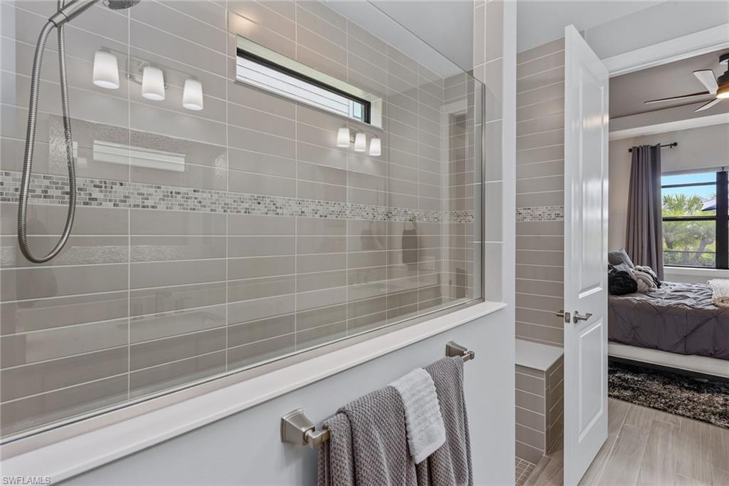 Welcome to paradise, where private lake views and lush tropical landscaping create a serene backdrop for everyday living in the sought-after Amaranda neighborhood of Fiddler’s Creek. Built in 2021, this Abbeyville floor plan offers three bedrooms, two baths, and a two-car garage, blending comfort and elegance in a peaceful eastern exposure setting. The screened lanai features color-changing sconces on the pool enclosure, a paver deck, gas-heated pool and spa, ceiling fan, recessed LED lighting, and serene lake views, an inviting space designed for year-round outdoor living. An outdoor kitchen equipped with a Coyote stainless steel grill and hood, with rotisserie, composite bar top, stainless steel sink, and a striking tile backsplash creates a space for entertaining. Impact-resistant doors and windows throughout the home offer enhanced storm protection and energy efficiency. Additional upgrades include a 24-kilowatt Generac whole-house gas generator installed in 2022 and a Kinetico water softener for added peace of mind. Inside, the open floor plan is adorned with grey wood-look porcelain plank tile and features electric blinds, recessed LED lighting, and a beautifully arched ceiling detail that draws you from the entry hallway into the living space. The open chef’s kitchen is outfitted with white cabinetry, under-cabinet lighting, quartz countertops, a mosaic tile backsplash, large quartz island with pendant lighting, and Whirlpool stainless steel appliances including a five-burner gas range and French door refrigerator with center drawer. A walk-in pantry with wood shelving and a window above the sink complete this stylish and functional space. Adjacent to the kitchen, the dining area features a chandelier and sliding glass doors that open directly to the lanai, while the cozy living room offers coffered ceilings and a ceiling fan. The owner’s suite offers water and pool views, a tray ceiling with a modern fan, and a spa-like bath with dual quartz vanity, framed mirrors, a walk-in shower with frameless glass, full porcelain tile surround, and a built-in bench. A spacious walk-in closet with custom built-ins adds convenience. Two guest bedrooms include ceiling fans, custom drapery, and built-in shelving in the closets. They share a beautifully appointed bath with a quartz vanity, frameless glass tub/shower combo, and floor-to-ceiling tile. The laundry room features a front-load Whirlpool washer and gas dryer on pedestals. The garage is finished with an epoxy fleck floor, suspended storage, water filtration system, and a mini-split HVAC system for year-round comfort. Residents have access to world-class amenities including fine and casual dining, a fitness center with classes and personal trainers, resort-style pools with waterfalls and slides, spa services, active tennis and pickleball, bocce, and a vibrant social calendar. Optional golf and beach/marina memberships available. Convenient to Olde Naples, Marco Island and all area attractions.