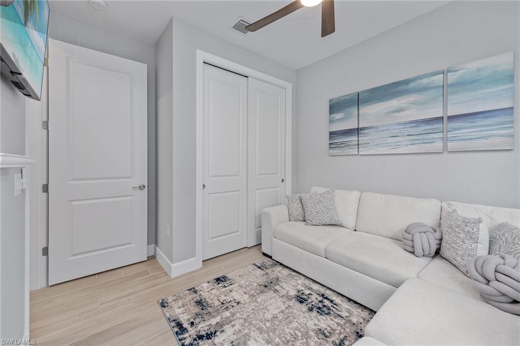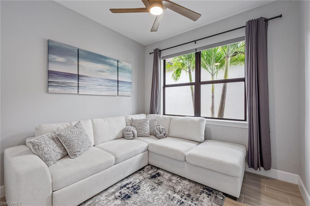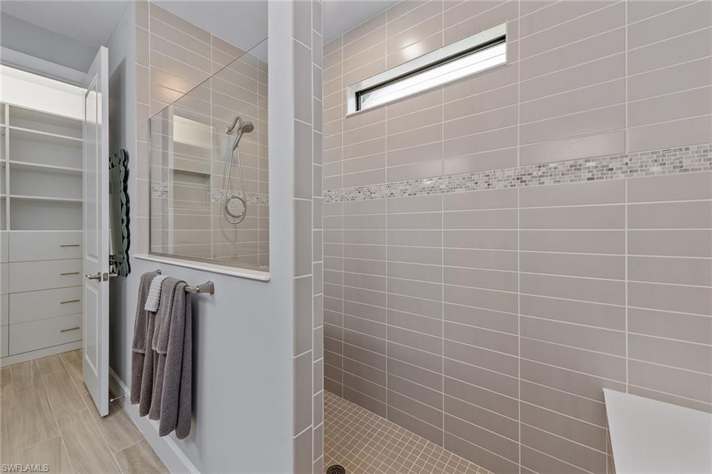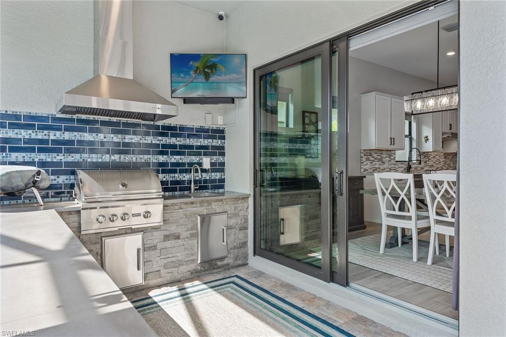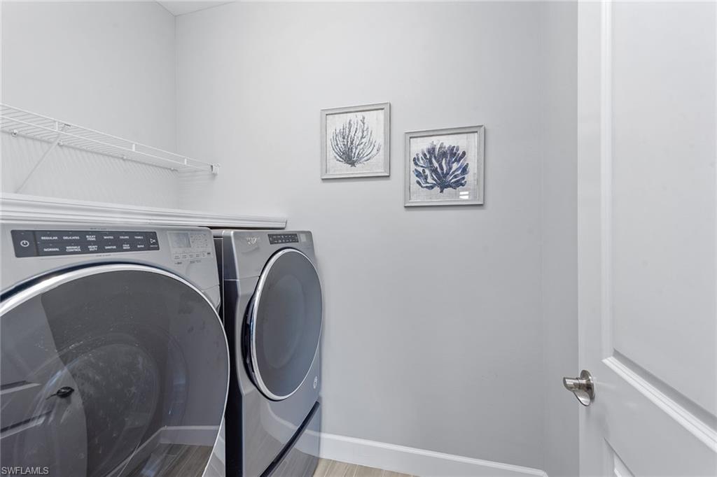 Welcome to paradise, where private lake views and lush tropical landscaping create a serene backdrop for everyday living in the sought-after Amaranda neighborhood of Fiddler’s Creek. Built in 2021, this Abbeyville floor plan offers three bedrooms, two baths, and a two-car garage, blending comfort and elegance in a peaceful eastern exposure setting. The screened lanai features color-changing sconces on the pool enclosure, a paver deck, gas-heated pool and spa, ceiling fan, recessed LED lighting, and serene lake views, an inviting space designed for year-round outdoor living. An outdoor kitchen equipped with a Coyote stainless steel grill and hood, with rotisserie, composite bar top, stainless steel sink, and a striking tile backsplash creates a space for entertaining. Impact-resistant doors and windows throughout the home offer enhanced storm protection and energy efficiency. Additional upgrades include a 24-kilowatt Generac whole-house gas generator installed in 2022 and a Kinetico water softener for added peace of mind. Inside, the open floor plan is adorned with grey wood-look porcelain plank tile and features electric blinds, recessed LED lighting, and a beautifully arched ceiling detail that draws you from the entry hallway into the living space. The open chef’s kitchen is outfitted with white cabinetry, under-cabinet lighting, quartz countertops, a mosaic tile backsplash, large quartz island with pendant lighting, and Whirlpool stainless steel appliances including a five-burner gas range and French door refrigerator with center drawer. A walk-in pantry with wood shelving and a window above the sink complete this stylish and functional space. Adjacent to the kitchen, the dining area features a chandelier and sliding glass doors that open directly to the lanai, while the cozy living room offers coffered ceilings and a ceiling fan. The owner’s suite offers water and pool views, a tray ceiling with a modern fan, and a spa-like bath with dual quartz vanity, framed mirrors, a walk-in shower with frameless glass, full porcelain tile surround, and a built-in bench. A spacious walk-in closet with custom built-ins adds convenience. Two guest bedrooms include ceiling fans, custom drapery, and built-in shelving in the closets. They share a beautifully appointed bath with a quartz vanity, frameless glass tub/shower combo, and floor-to-ceiling tile. The laundry room features a front-load Whirlpool washer and gas dryer on pedestals. The garage is finished with an epoxy fleck floor, suspended storage, water filtration system, and a mini-split HVAC system for year-round comfort. Residents have access to world-class amenities including fine and casual dining, a fitness center with classes and personal trainers, resort-style pools with waterfalls and slides, spa services, active tennis and pickleball, bocce, and a vibrant social calendar. Optional golf and beach/marina memberships available. Convenient to Olde Naples, Marco Island and all area attractions.