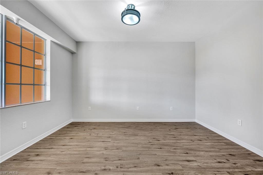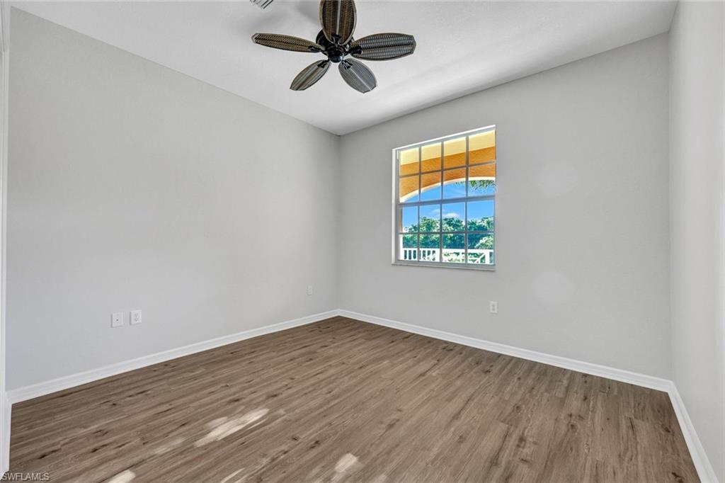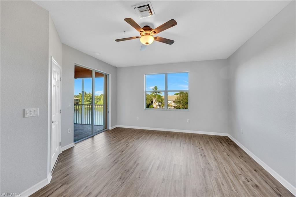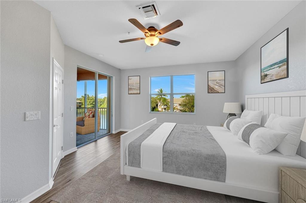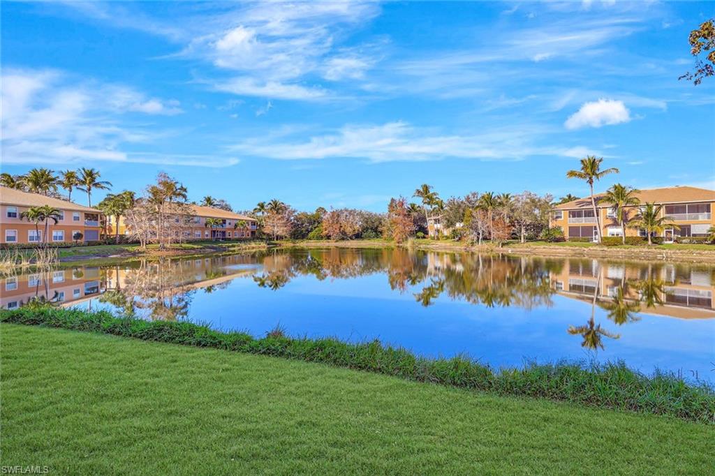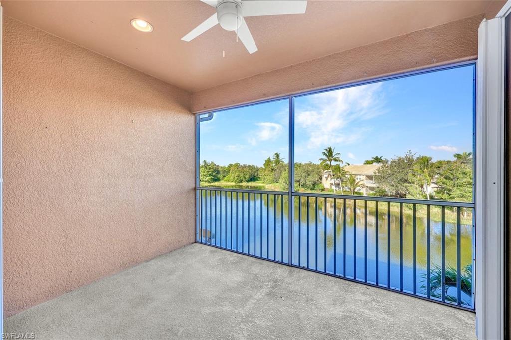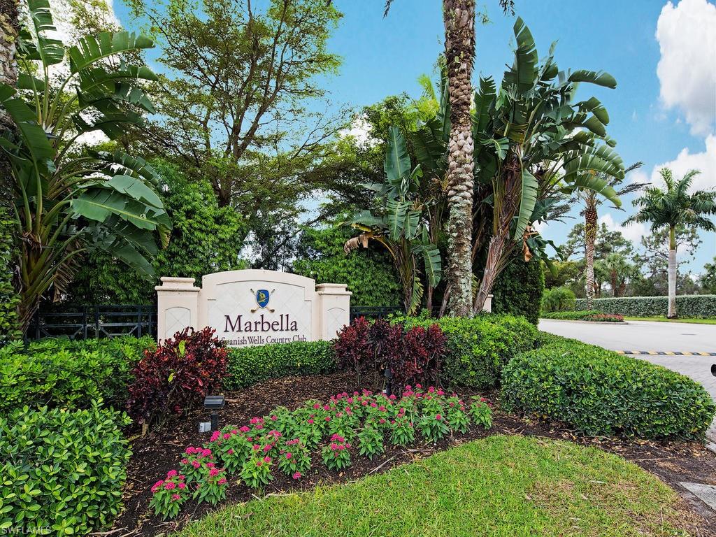 Close proximity to dining, shops and the beach from this Designer Series luxurious condominium home. Newer AC system, island kitchen, no carpeting; new luxury vinyl added to bedrooms and large den. Top floor 3rd story in elevator building in Marbella with high impact glass, rich wood cabinetry kitchen, granite counters and stainless steel appliances and newly painted interior, some new fans. Gated community, Marbella of Spanish Wells is a remarkably quiet setting. Premium gorgeous private lake view and beautiful sunset views. Open floorplan from kitchen looking over great room and covered screened patio. Spacious owner suite with large walk-in closet. Nice kitchen pantry, laundry room, covered parking and your own locked large storage room on 3rd floor near elevator. This is close to a 3 mile drive to beach. The community has additional optional memberships varying from golf and dining. Harbor Key Floorplan with no one living above you. Offered unfurnished. Drive to Barefoot Beach, Bonita Bay Promenade shops and dining, Mercado, Olde 41 Sugar Shack, and just over 20 minutes to the airport. Located off of Bonita Beach Road in quiet section of community. ANY PHOTO SEEN HERE WITH FURNISHINGS IN PHOTO ARE VIRTUALLY STAGED. No furnishings exist.