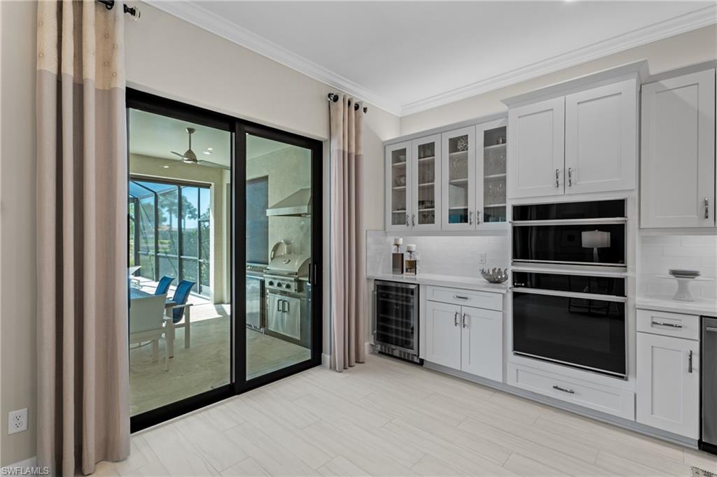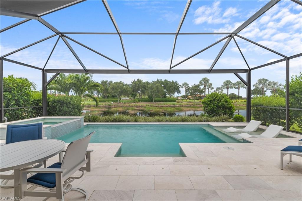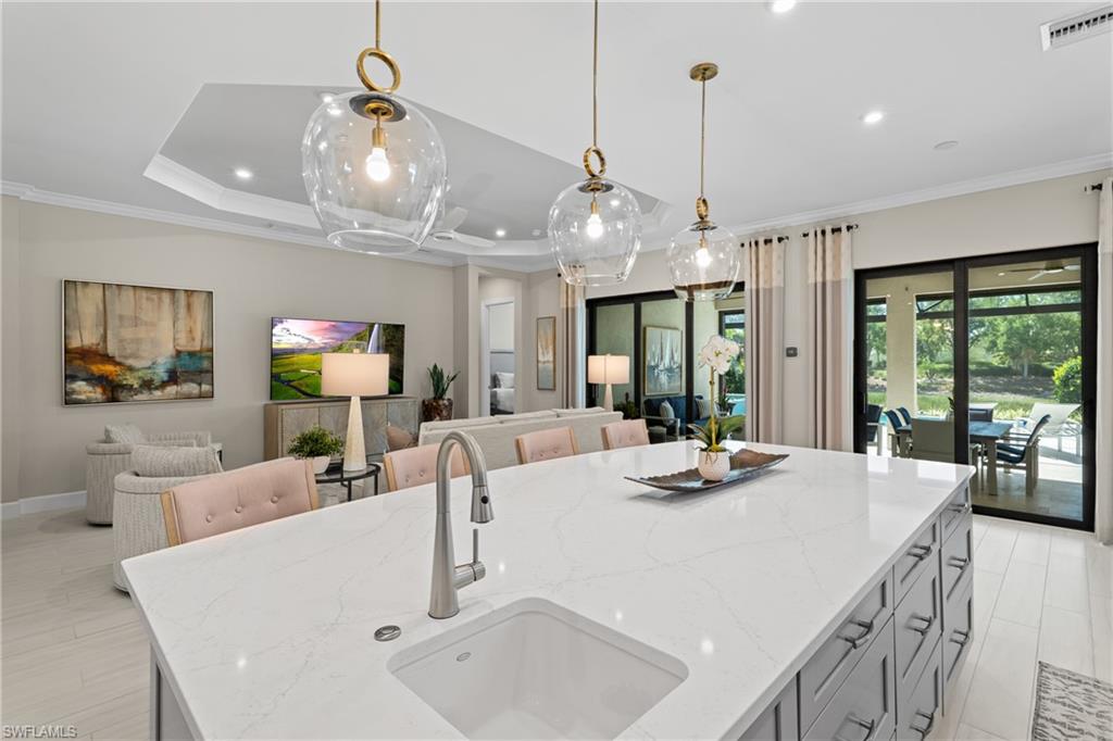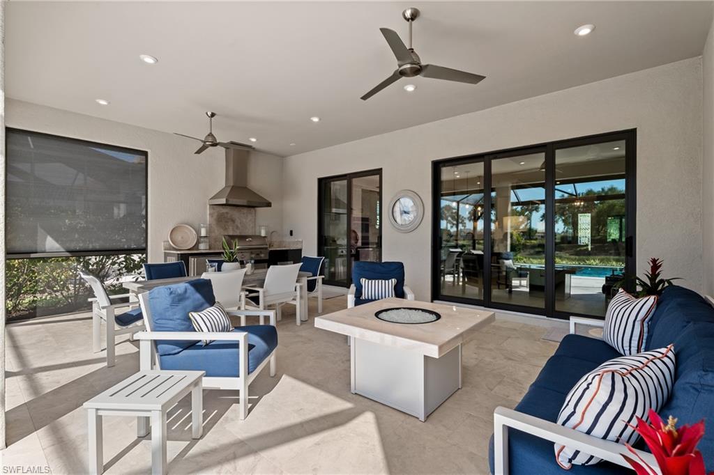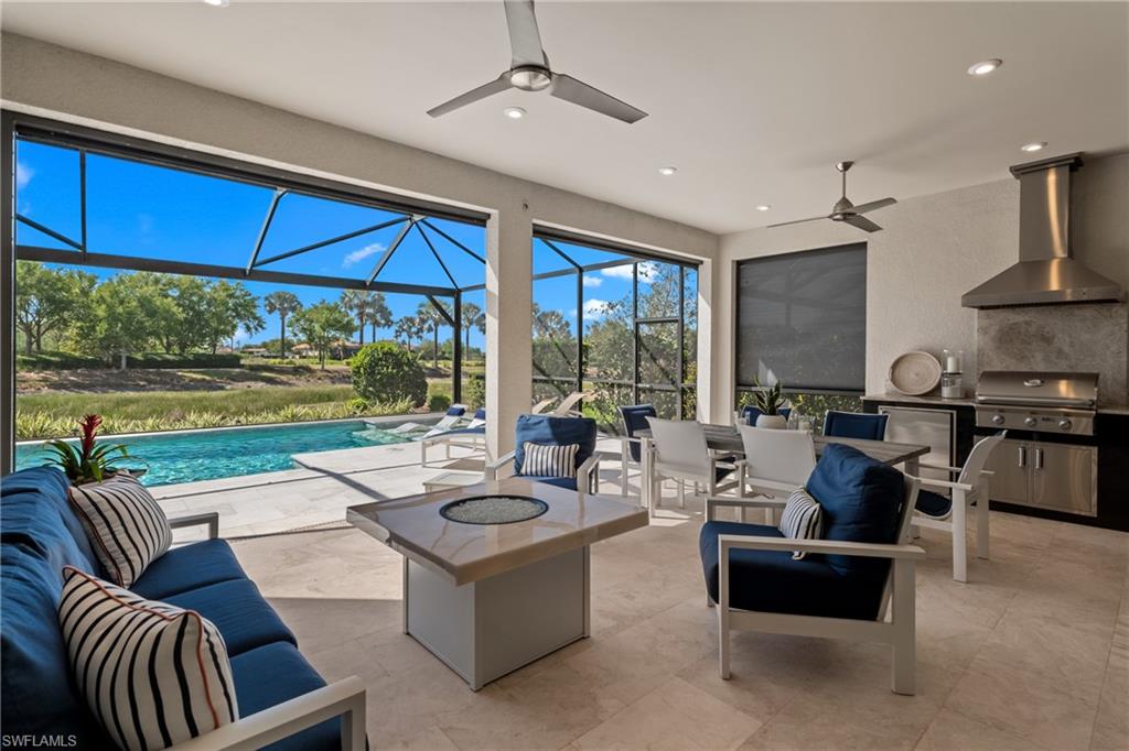 MOVE-IN READY DREAM HOME! This pristine and thoughtfully curated 'extended' Lazio model is being sold TURNKEY, including $175,000 in high-end furniture and décor! As soon as you step into this home, you will notice every detail has been thoughtfully curated to create a luxurious and inviting home. This property features 3 bedrooms plus a den, 3 full baths, and an oversized tandem 2-car garage and is nestled in the prestigious Esplanade Golf & Country Club. Spanning nearly 2,400 square feet under air, the open-concept great room design seamlessly blends indoor and outdoor living, with dual sliding glass doors leading to an extended covered lanai complete with an outdoor kitchen and fire pit—ideal for entertaining. The outdoor oasis offers a serene retreat with a custom gas-heated saltwater pool and spa, enhanced by a sun shelf, upgraded travertine pool tile, a bubbler and a waterfall feature. Whether lounging poolside or enjoying a sunset with a western view, this private sanctuary provides the perfect setting for relaxation year-round. Designed with sophistication and comfort in mind, the home includes high-impact windows/doors throughout, electric roll-down hurricane screens on the lanai, and elegant wood-style flooring in every room. The gourmet kitchen is a chef’s dream, boasting GE Monogram appliances, a gas cooktop and wall oven, upgraded cabinetry, quartz countertops and a dual wine cooler. Additional luxurious touches include plantation shutters, custom window treatments, and built-in custom closets. The extended tandem garage features a separate storage room, ideal for a work area or neatly housing trash containers along with a beautiful upgraded flooring which comes with a lifetime warranty. The enhanced landscaping with strategically placed lighting adds to the home’s curb appeal. This property includes a Club/Sports Membership, providing access to Esplanade’s exceptional resort-style amenities. (Please note that the Sports Membership provides access to the 18-hole private golf course, allowing play only if a tee time becomes available within two days of the booking window opening) Entering Esplanade, you will notice why Esplanade Golf & CC was awarded this year's Outstanding Landscaping Award for the front entrance by the National Association of Landscape Professionals. As for the community, Esplanade offers a resort-style pool with food/drink service, cabanas and the popular poolside Bahama Bar, as well as tennis, pickleball, and bocce courts. The Koquina Day Spa and a state-of-the-art fitness center cater to wellness and relaxation, while 14 miles of scenic trails and a dedicated dog park offer outdoor enjoyment. Dining options abound, including a full-service restaurant, bar, wine tasting room, private wine lockers, and a Starbucks-style café. Just bring your clothes/toothbrush and start enjoying the best of Esplanade Golf & CC living!!