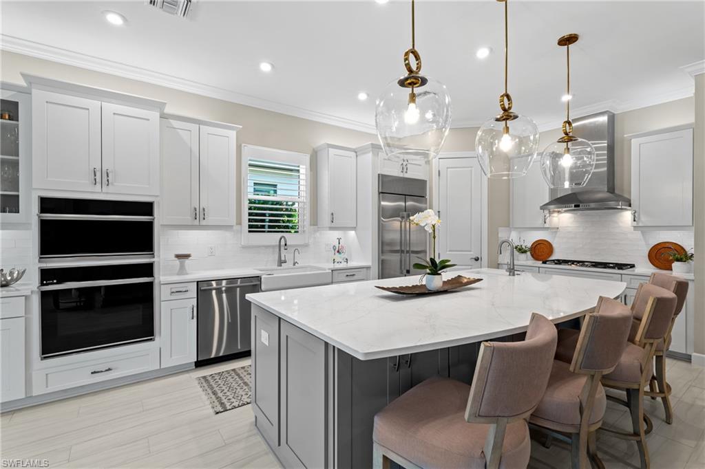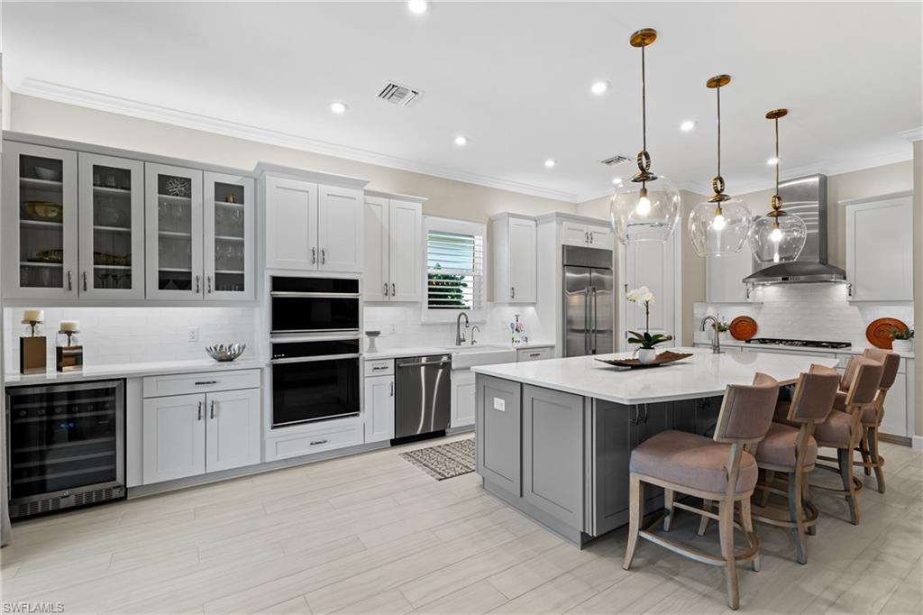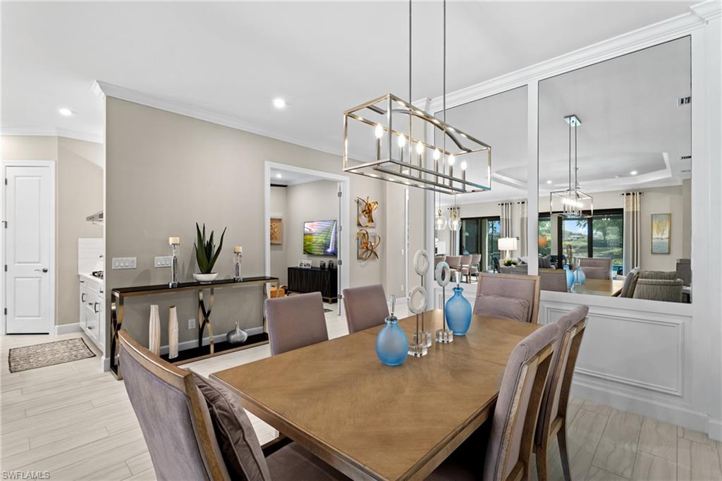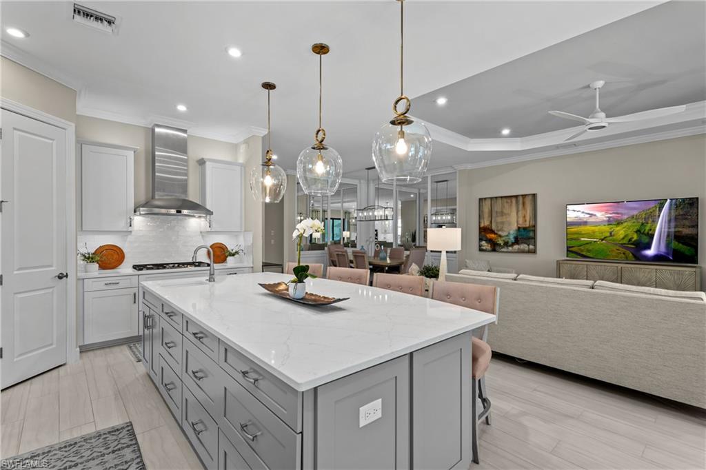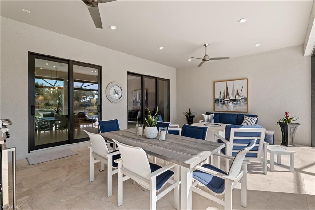 MOVE-IN READY DREAM HOME! This pristine and thoughtfully curated 'extended' Lazio model is being sold TURNKEY, including $175,000 in high-end furniture and décor! As soon as you step into this home, you will notice every detail has been thoughtfully curated to create a luxurious and inviting home. This property features 3 bedrooms plus a den, 3 full baths, and an oversized tandem 2-car garage and is nestled in the prestigious Esplanade Golf & Country Club. Spanning nearly 2,400 square feet under air, the open-concept great room design seamlessly blends indoor and outdoor living, with dual sliding glass doors leading to an extended covered lanai complete with an outdoor kitchen and fire pit—ideal for entertaining. The outdoor oasis offers a serene retreat with a custom gas-heated saltwater pool and spa, enhanced by a sun shelf, upgraded travertine pool tile, a bubbler and a waterfall feature. Whether lounging poolside or enjoying a sunset with a western view, this private sanctuary provides the perfect setting for relaxation year-round. Designed with sophistication and comfort in mind, the home includes high-impact windows/doors throughout, electric roll-down hurricane screens on the lanai, and elegant wood-style flooring in every room. The gourmet kitchen is a chef’s dream, boasting GE Monogram appliances, a gas cooktop and wall oven, upgraded cabinetry, quartz countertops and a dual wine cooler. Additional luxurious touches include plantation shutters, custom window treatments, and built-in custom closets. The extended tandem garage features a separate storage room, ideal for a work area or neatly housing trash containers along with a beautiful upgraded flooring which comes with a lifetime warranty. The enhanced landscaping with strategically placed lighting adds to the home’s curb appeal. This property includes a Club/Sports Membership, providing access to Esplanade’s exceptional resort-style amenities. (Please note that the Sports Membership provides access to the 18-hole private golf course, allowing play only if a tee time becomes available within two days of the booking window opening) Entering Esplanade, you will notice why Esplanade Golf & CC was awarded this year's Outstanding Landscaping Award for the front entrance by the National Association of Landscape Professionals. As for the community, Esplanade offers a resort-style pool with food/drink service, cabanas and the popular poolside Bahama Bar, as well as tennis, pickleball, and bocce courts. The Koquina Day Spa and a state-of-the-art fitness center cater to wellness and relaxation, while 14 miles of scenic trails and a dedicated dog park offer outdoor enjoyment. Dining options abound, including a full-service restaurant, bar, wine tasting room, private wine lockers, and a Starbucks-style café. Just bring your clothes/toothbrush and start enjoying the best of Esplanade Golf & CC living!!