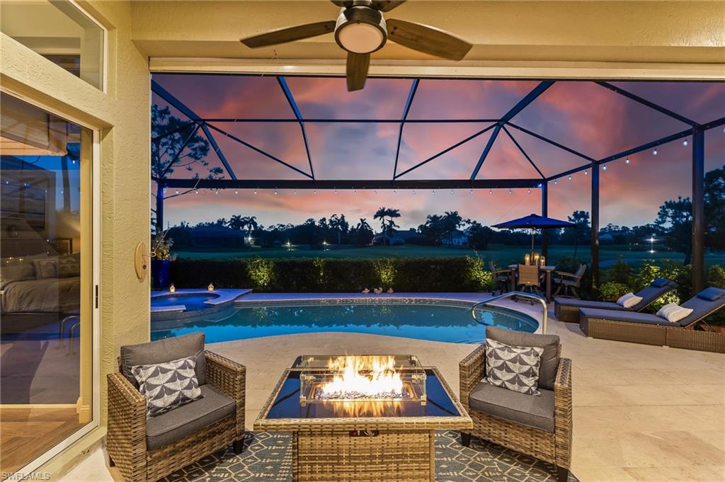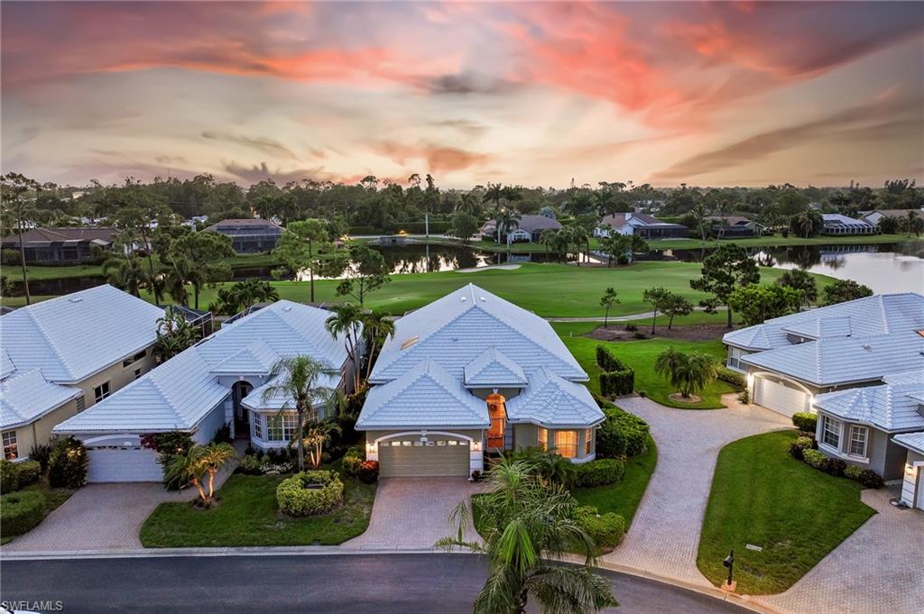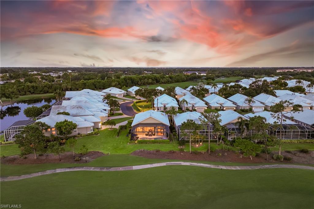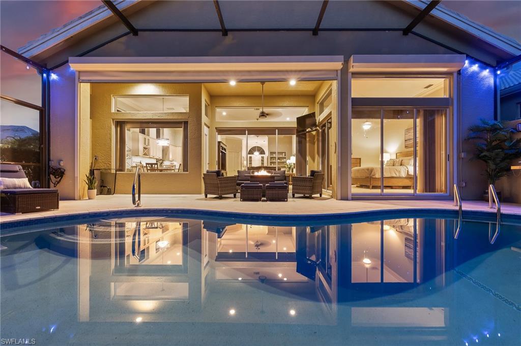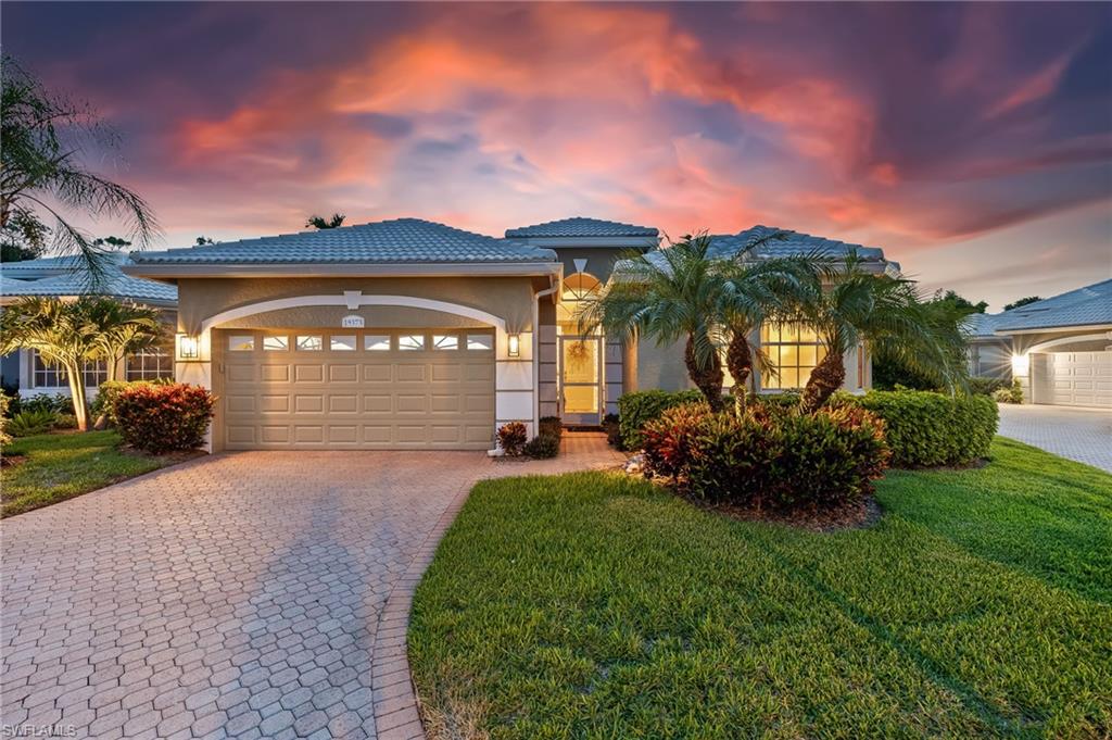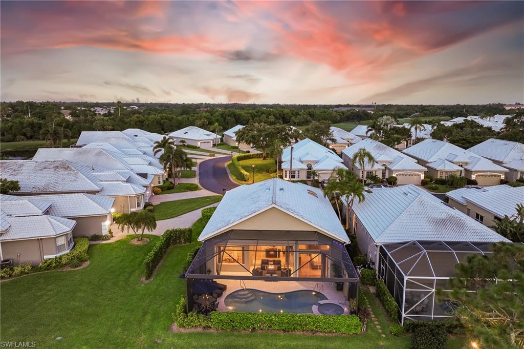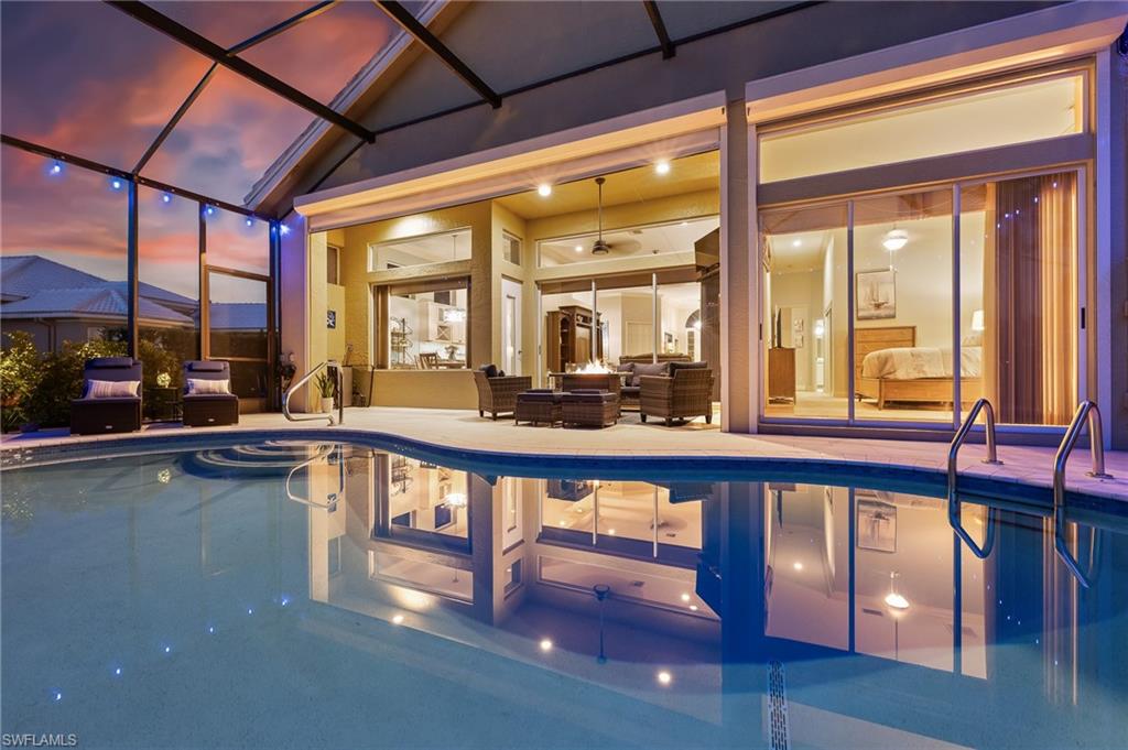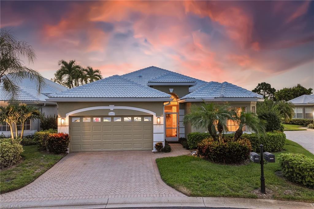 RARE OPPORTUNITY......FULL GOLF + SPORT MEMBERSHIPS AVAILABLE NOW WITH NO WAIT LIST......This single-family home with volume ceilings and open floor plan is perfectly positioned within the highly desirable Estero Country Club in The Vines Community. Featured updates include NEW ROOF + GUTTERS (2021); WHOLE HOUSE WATER FILTRATION SYSTEM (2022); NEW A/C + WATER HEATER (2023); POOL/SPA UPDATED (2023); and wood-look plank tile flooring. The efficiently designed galley kitchen has stainless steel appliances, white cabinets, granite countertops and attached breakfast room for casual dining. Sliding glass doors from the great room lead out to the cozy, covered lanai with conveying fire pit table + new outdoor furniture and electric hurricane screen and shutters. The BONUS PANORAMIC PICTURE SCREEN ENCLOSURE with salt water pool & spa has some of the most AMAZING SUNSETS captured by its coveted western facing LAKE + GOLF COURSE VIEWS. Perfect for anyone seeking a second home or as a permanent residence. Estero Country Club social activities include a championship 18-hole golf course (golf membership optional); tennis; pickle ball; bocce; fitness center; plus casual and fine dining. Membership in ECC is required at the Social Level. Great location close to RSW Airport; shops and restaurants.....this home invites an elite lifestyle and true resort-style living in an amenity rich, active community.