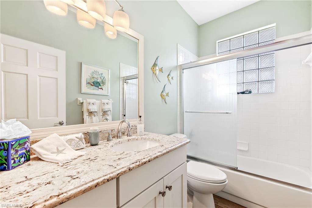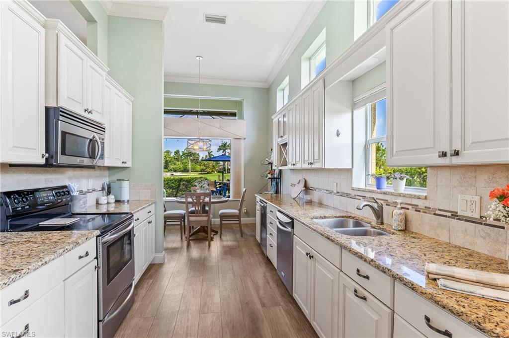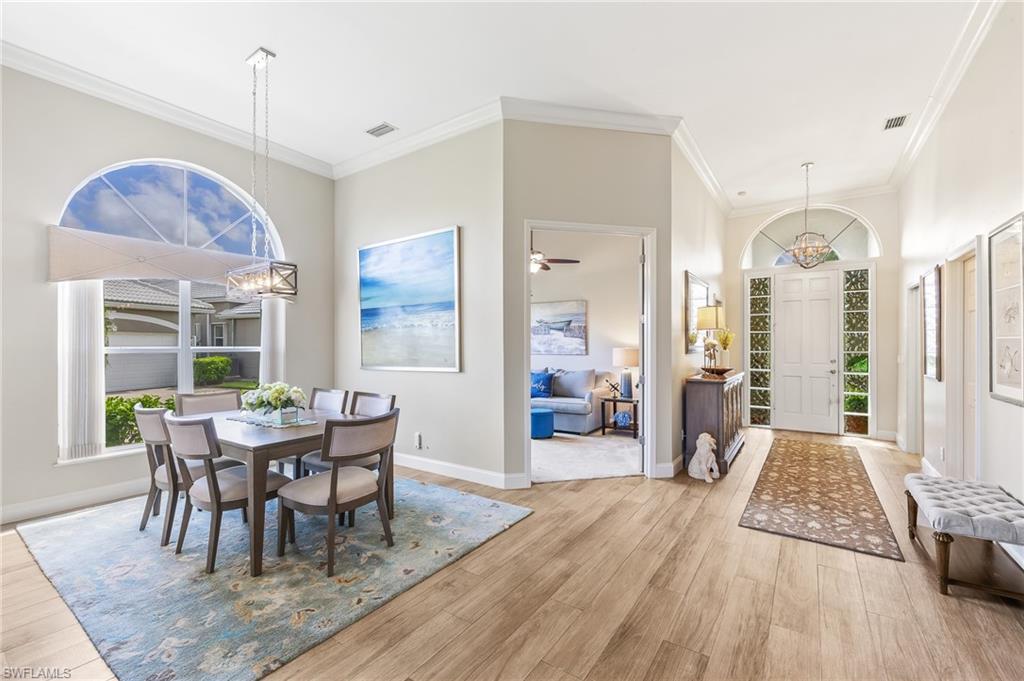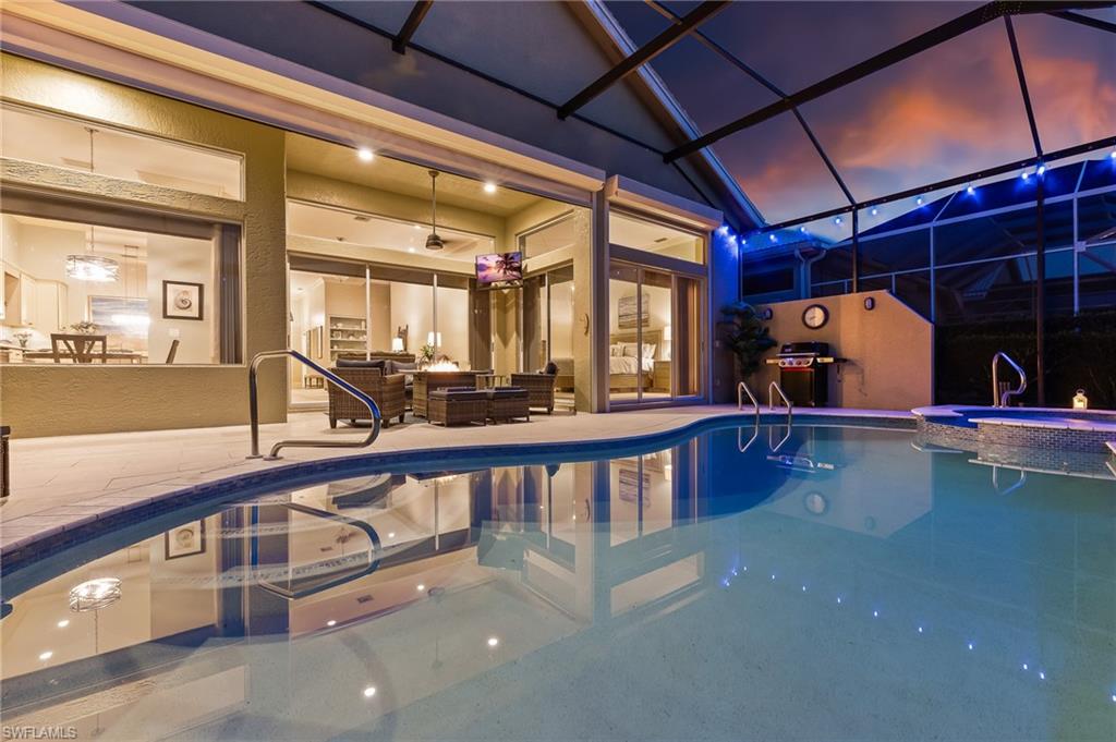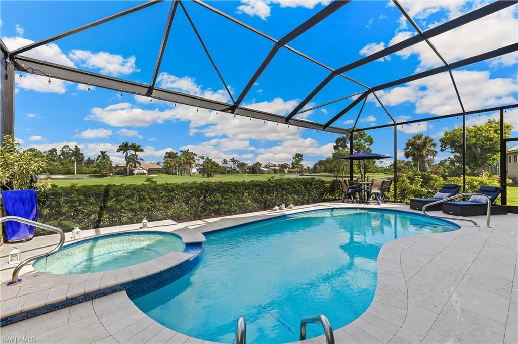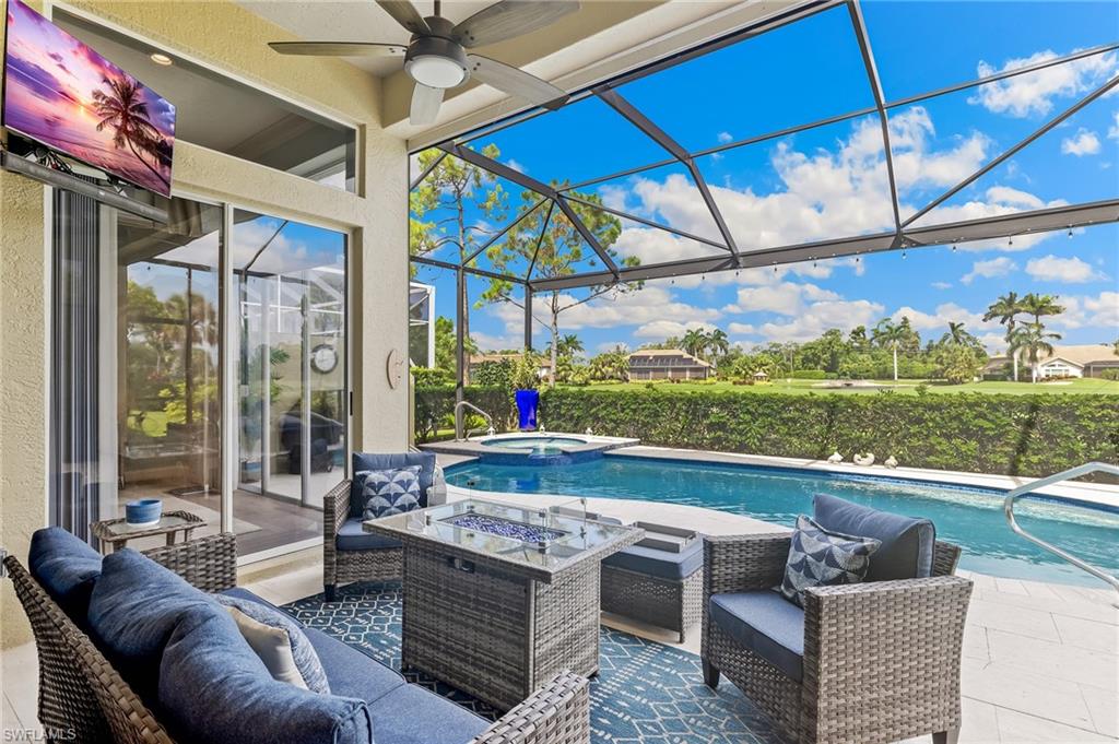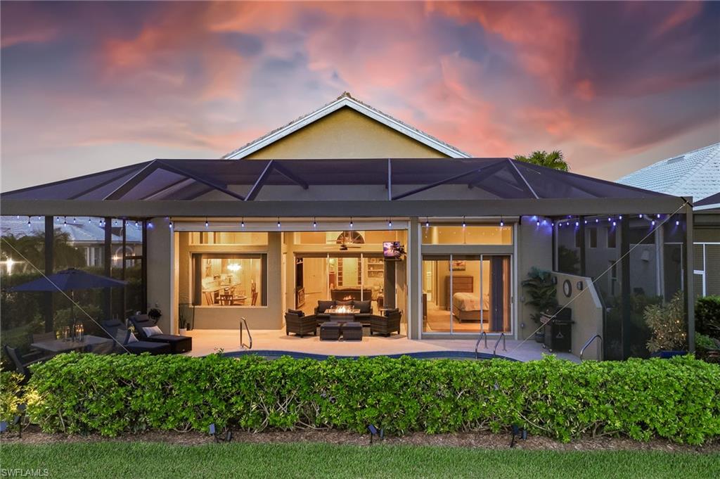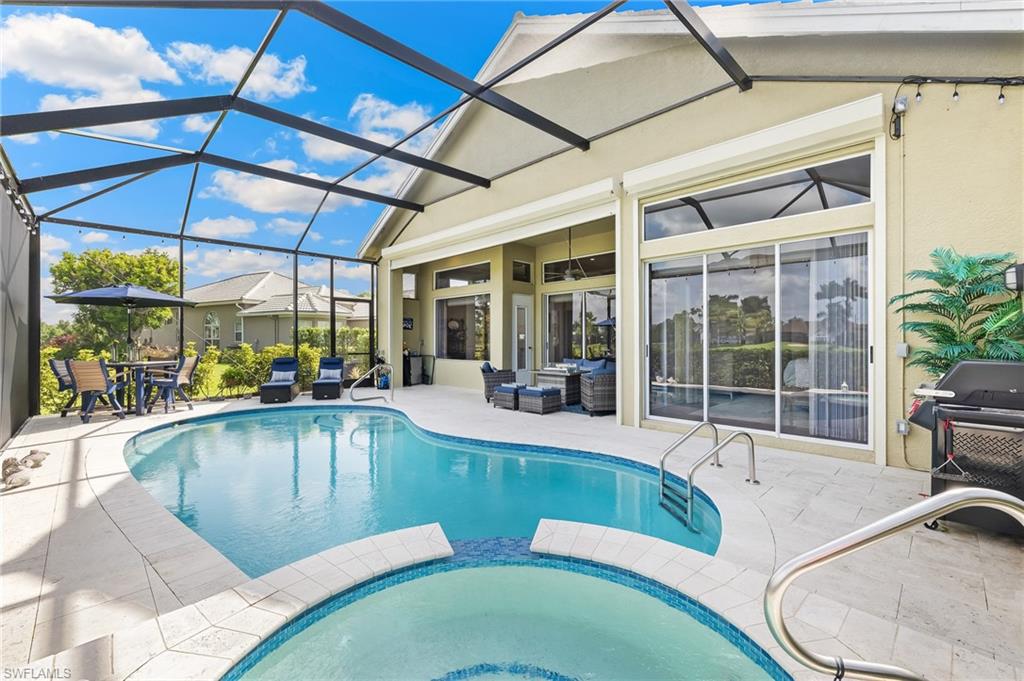 RARE OPPORTUNITY......FULL GOLF + SPORT MEMBERSHIPS AVAILABLE NOW WITH NO WAIT LIST......This single-family home with volume ceilings and open floor plan is perfectly positioned within the highly desirable Estero Country Club in The Vines Community. Featured updates include NEW ROOF + GUTTERS (2021); WHOLE HOUSE WATER FILTRATION SYSTEM (2022); NEW A/C + WATER HEATER (2023); POOL/SPA UPDATED (2023); and wood-look plank tile flooring. The efficiently designed galley kitchen has stainless steel appliances, white cabinets, granite countertops and attached breakfast room for casual dining. Sliding glass doors from the great room lead out to the cozy, covered lanai with conveying fire pit table + new outdoor furniture and electric hurricane screen and shutters. The BONUS PANORAMIC PICTURE SCREEN ENCLOSURE with salt water pool & spa has some of the most AMAZING SUNSETS captured by its coveted western facing LAKE + GOLF COURSE VIEWS. Perfect for anyone seeking a second home or as a permanent residence. Estero Country Club social activities include a championship 18-hole golf course (golf membership optional); tennis; pickle ball; bocce; fitness center; plus casual and fine dining. Membership in ECC is required at the Social Level. Great location close to RSW Airport; shops and restaurants.....this home invites an elite lifestyle and true resort-style living in an amenity rich, active community.