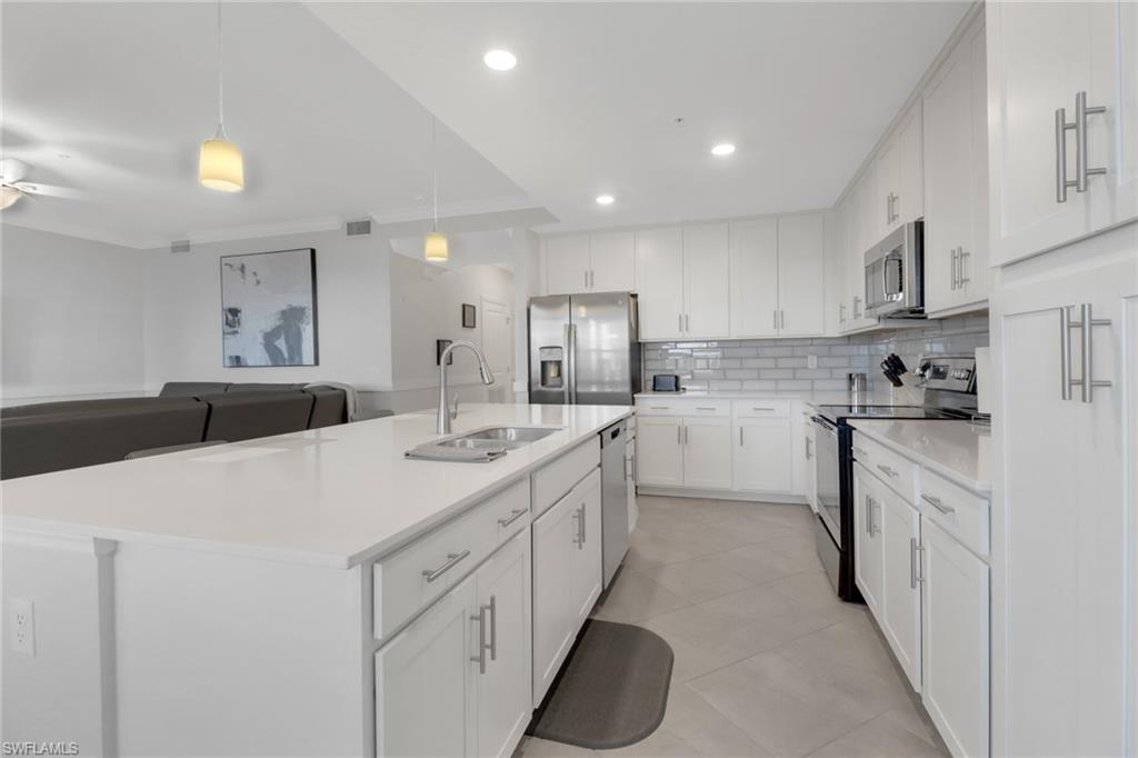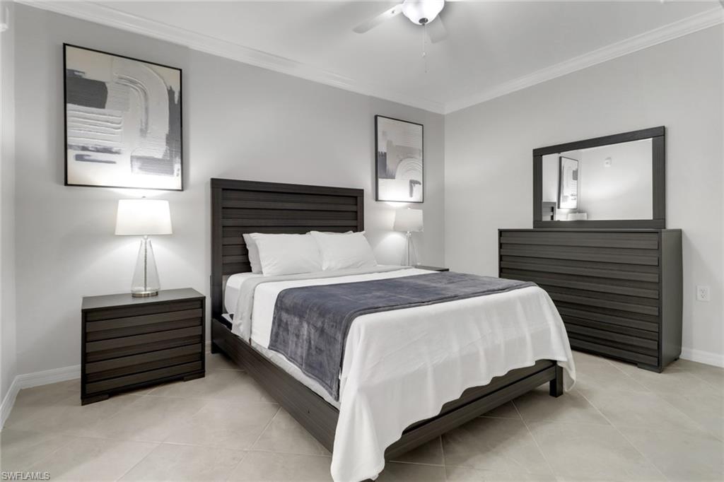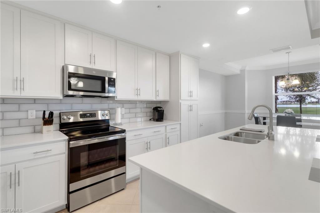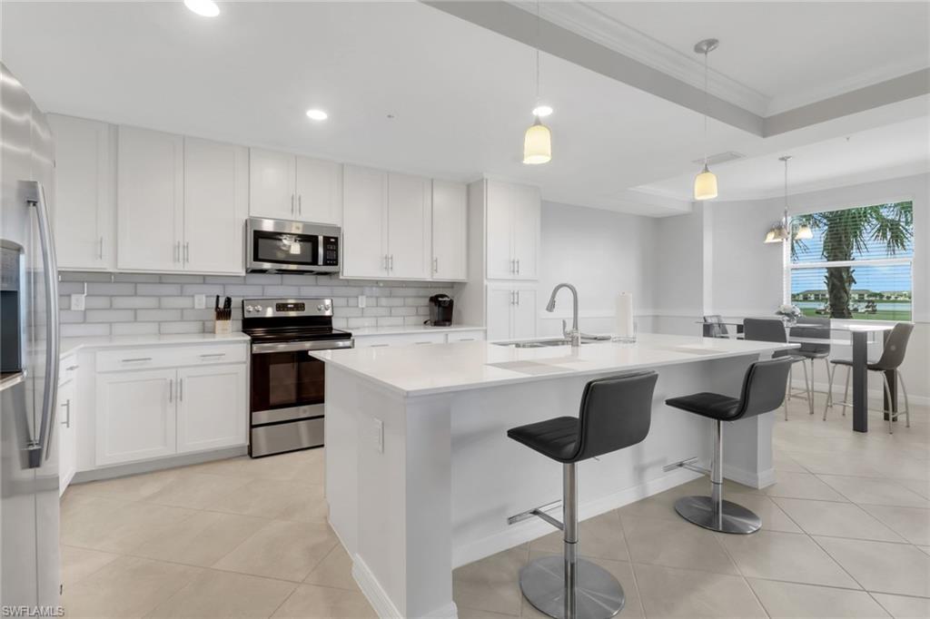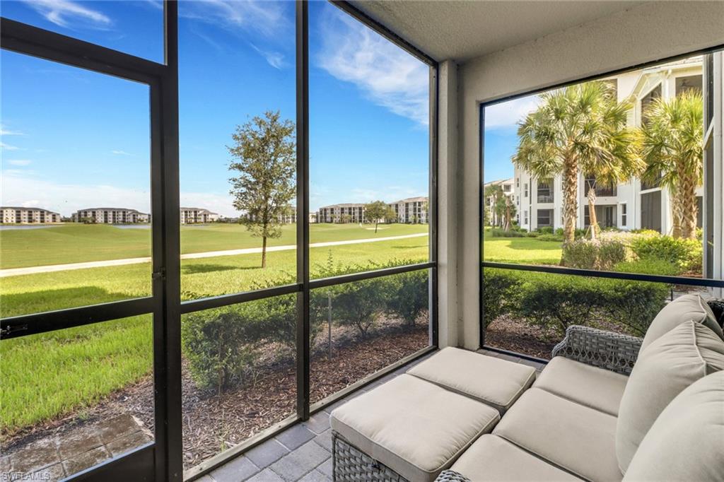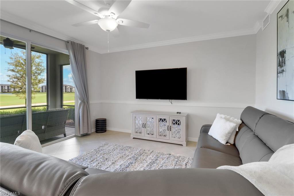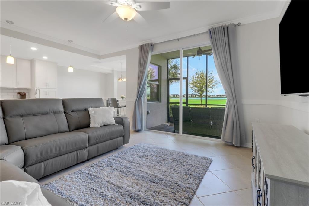 Step into this beautifully upgraded 2-bedroom, 2-bathroom first-floor condo, offered turnkey furnished with sleek, modern furnishings and a true designer touch. This like-new residence features tile flooring throughout, crown molding, chair rail detailing, and an upgraded backsplash, a perfect blend of style and comfort. Enjoy an open-concept layout with a spacious kitchen boasting a large island, ideal for entertaining or casual dining. Take in breathtaking golf course and lake views from your private lanai, offering a peaceful backdrop for morning coffee or sunset cocktails. Included with the home is a bundled golf membership, granting you immediate access to championship golf without substantial membership fees. The property also includes a deeded, covered parking space for added convenience. Located in a premier resort-style community featuring top-tier amenities such as on-site dining, a state-of-the-art fitness center, resort-style pools, and an impressive golf course, you’ll feel like you’re on vacation every day. This is luxury, convenience, and lifestyle all wrapped into one incredible opportunity.
