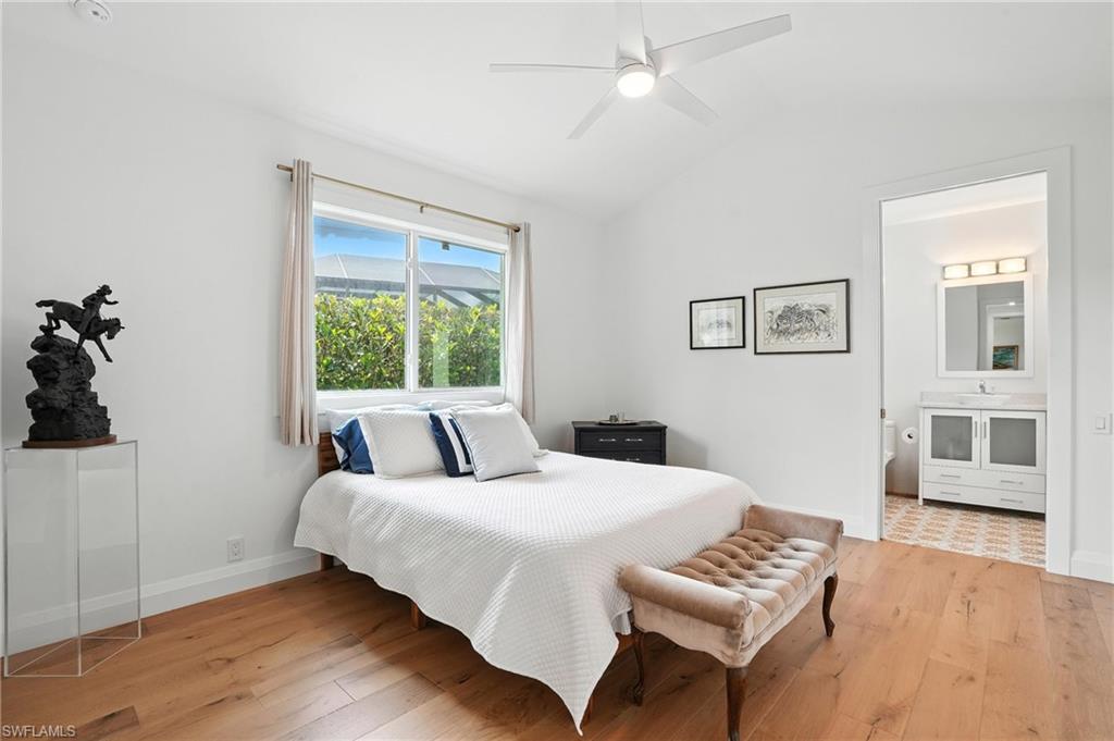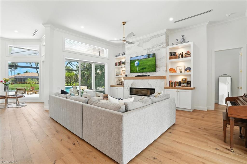 Welcome to a truly exceptional lakefront residence, masterfully reimagined by Keystone Custom Homes in 2022 and nestled within the Wedgewood enclave of the gated Vineyards community. With over 3,700 square feet of thoughtfully designed living space, this southern exposure 3 bedroom + den, 4 bath pool-home offers the perfect blend of refined elegance and modern sophistication. Beyond the striking 10-foot custom front door, guests are greeted by a sun-drenched great room with soaring 12-foot ceilings and expansive impact-resistant windows and sliders that frame sweeping views of the tranquil lake and fountain. The chef’s kitchen is a statement in style and functionality, featuring shaker-style wood cabinetry, quartz countertops, a marble backsplash, and a grand center island—all oriented to capture the home’s stunning waterfront setting. Designed for effortless entertaining and everyday indulgence, the expansive caged lanai offers a seamless transition from interior to exterior living. Complete with a heated pool (with new pump & filter), built-in propane grill, and outdoor refrigerator—this idyllic space invites alfresco dining and sunset lounging with serene, long lake views as your backdrop. Every detail has been carefully curated, from the custom feature wall and built-in fireplace to the French white oak wood flooring and marble accented bathrooms. Additional highlights include eight-foot interior doors, a new roof installed in 2022, top-of-the-line Fisher Paykel appliances, Samsung washer/dryer, and an attached two-car garage. Perfectly situated on a quiet cul-de-sac street, this residence offers not only privacy, but also exceptional accessibility—just 20 minutes to the beach and the world-class shopping and dining of downtown Naples. Residents of Wedgewood enjoy the option to join the renowned Vineyards Country Club, offering a state-of-the-art wellness center and spa, resort-style pool, two championship golf courses, tennis, pickleball, fine dining, a vibrant calendar of social events, and so much more!