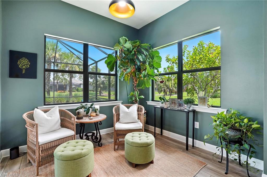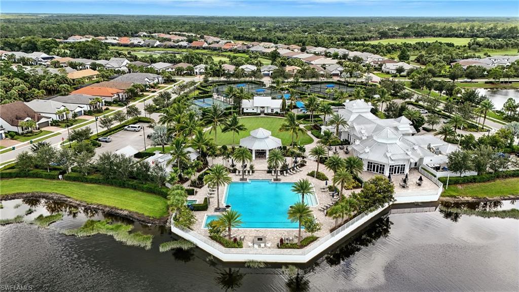 Discover unparalleled elegance at 8881 Horned Lark Dr, an exquisite “Abbeyville” Pulte home built in 2021, nestled within the prestigious gated community of Greyhawk at Golf Club of the Everglades in Naples, Florida. This stunning residence offers a seamless blend of modern sophistication and serene lakefront living, perfect for those seeking a luxurious and active lifestyle. Spanning a spacious layout, this home features 2 generous sized bedrooms plus a versatile den/office, 2 full bathrooms, and a spacious 2-car garage. The thoughtfully designed interior boasts high tray ceilings, elegant crown molding, impact-resistant windows, custom light fixtures, and luxury vinyl flooring throughout, creating an ambiance of refined comfort. The bright, open-concept kitchen is a chef’s dream, equipped with a natural gas stove, stainless steel appliances, a breakfast bar, and ample cabinetry, ideal for both casual dining and entertaining. The spacious master suite serves as a private oasis, complete with a large walk-in shower and a custom-designed walk-in closet for effortless organization. Adjacent to the kitchen, an inviting sunroom offers peaceful Northwest-facing views over the tranquil lake, perfect for morning coffee or evening relaxation. Step outside to the screened lanai, where a heated gas chlorine pool and spa beckon you to unwind while soaking in the serene lakefront vistas. Additional highlights include a convenient mudroom for added functionality. Greyhawk residents benefit from affordable HOA and golf fees, with the flexibility to choose a social membership or a full golf membership at the private 18-hole championship course. Free of CDD fees, the community resort style amenities includes: tennis, pickleball, a resort-style pool, a state-of-the-art fitness center, restaurant & bar, bocce courts, fire pit area and more! This isn’t just a home—it’s a vibrant, upscale lifestyle. Seize the opportunity to live in one of Naples’ most dynamic and luxurious communities. Claim your slice in paradise today!