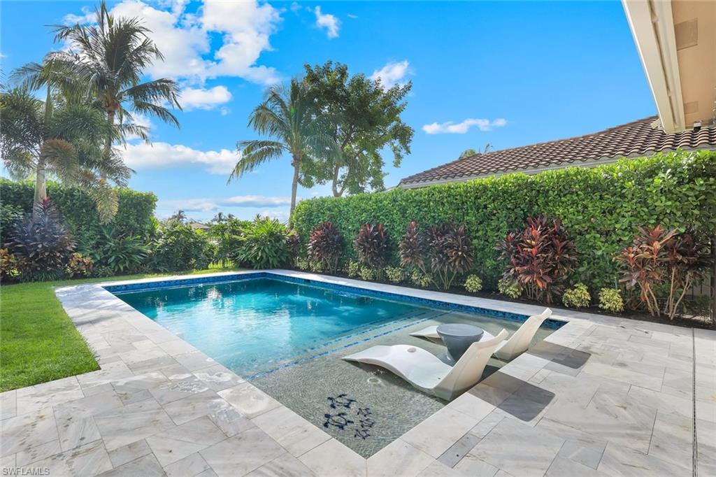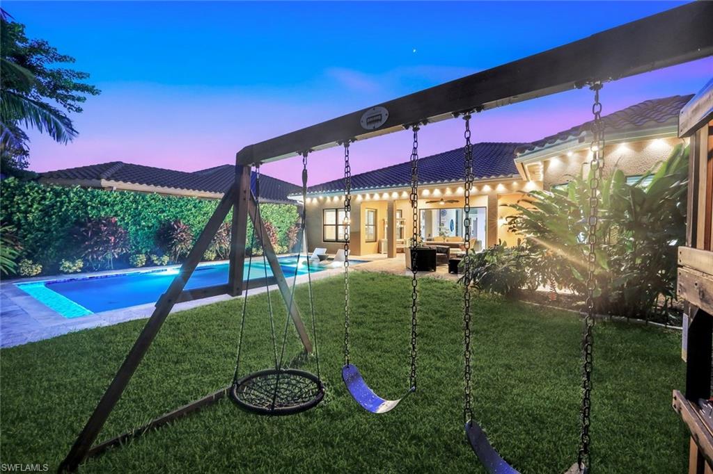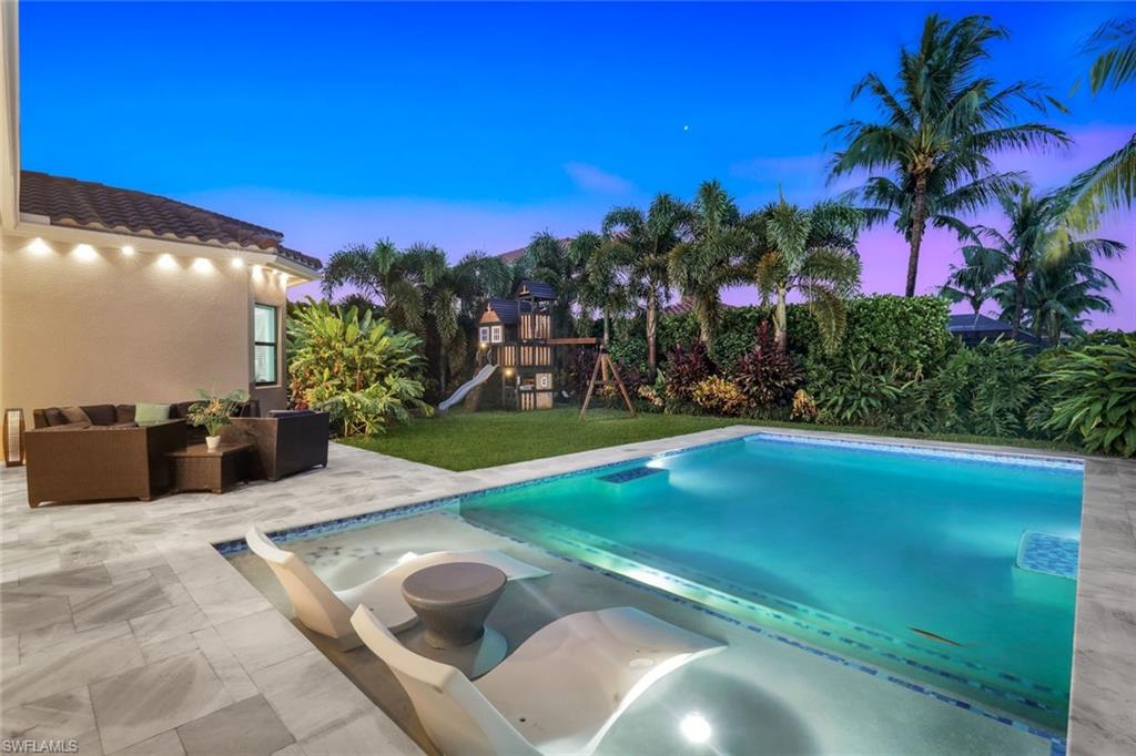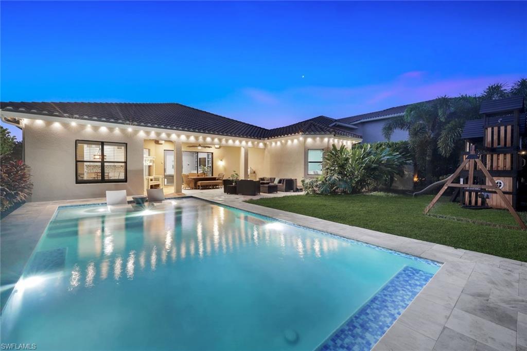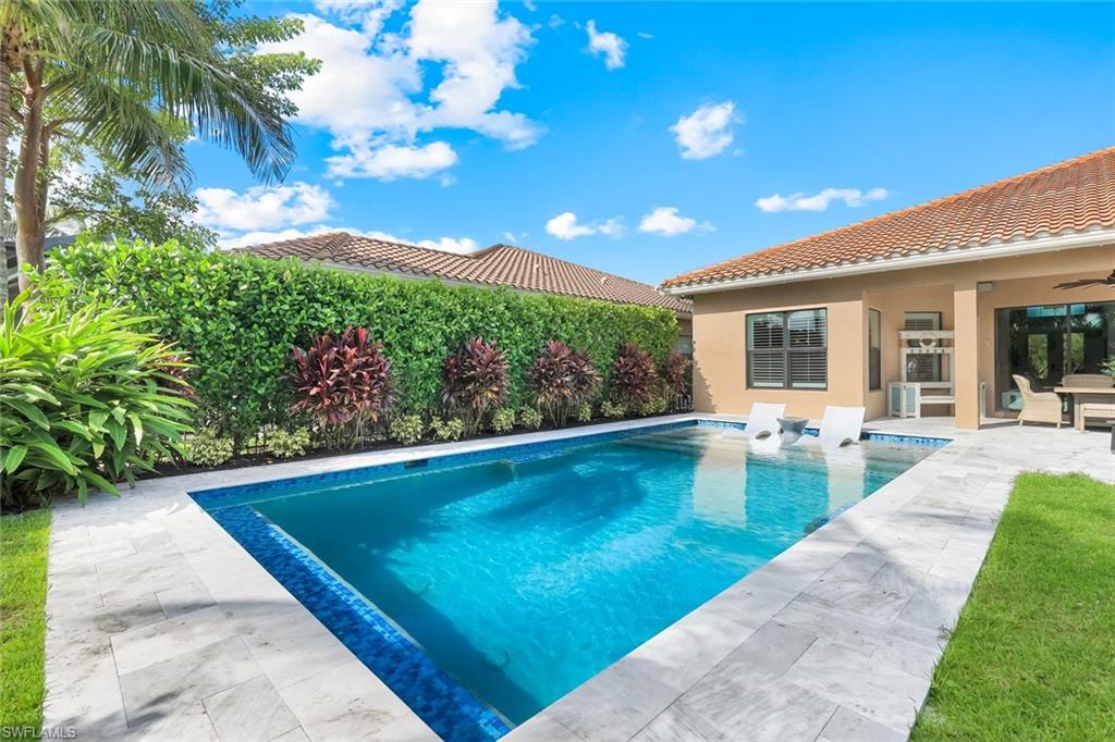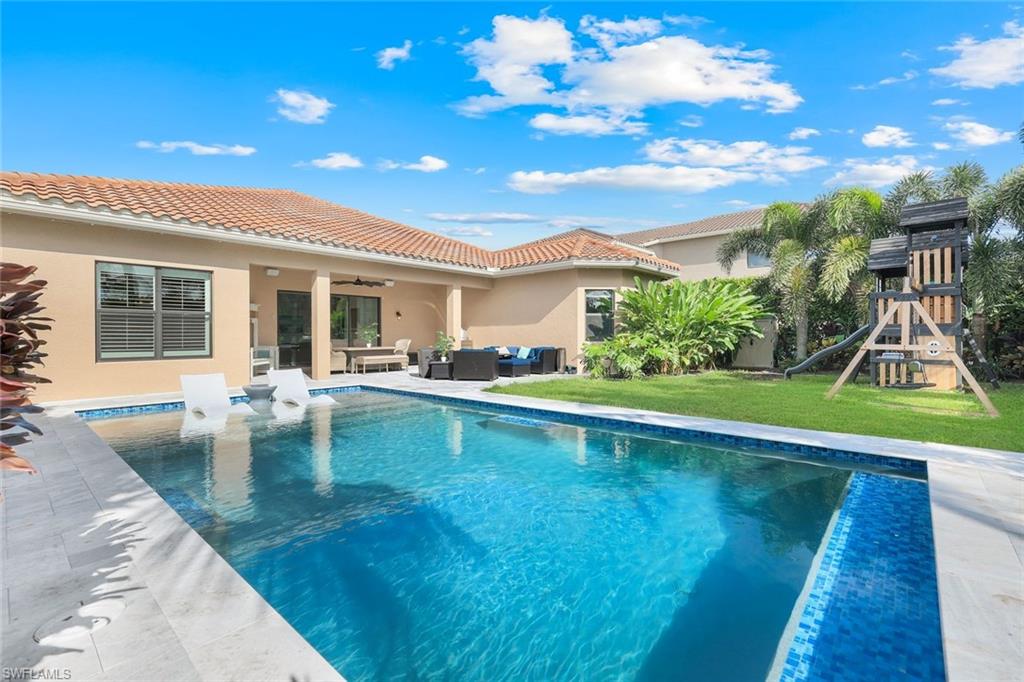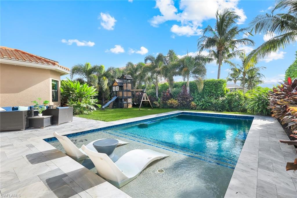 Escape the ordinary and discover your own private oasis. This updated Riverstone home offers 2,609 sq. ft. of beautifully refreshed living space and a backyard designed for both relaxation and play—perfect for enjoying the vibrant Naples lifestyle. Step inside and be greeted by a soaring 14-foot foyer that opens to a bright and inviting great room, complete with a custom built-in, shiplap accents and a dramatic double trey ceiling with color-changing uplighting. Entertain with ease in the remodeled gourmet kitchen featuring granite counters, floor-to-ceiling shaker cabinetry with glass accents and lighting, pull-outs, pot drawers, a vented hood, tile backsplash, and a central island. A Samsung Bespoke refrigerator, newer appliances, and a casual dining nook complete the chef’s dream space. The spacious primary suite is a true retreat, offering room for a sitting area, two custom walk-in closets, and a stunning updated bath with frameless glass shower, rain head and jets, a liner drain, and re-tiled tub surround. There’s room for everyone with three additional bedrooms, with versatility to use one as a den, office, or hobby room, plus two guest baths. Fine finishes include built-in closets throughout, LVP flooring, plantation shutters, tall baseboards and crown molding. A finished laundry room with 2024 LG washer/dryer, cabinets, and sink add both function and style. Peace of mind comes with a new A/C system (2024) with UV light and Iflow cleaning system. Out back, discover your own outdoor oasis. A custom, extra-large heated saltwater pool (2022) with sandblasted marble paver lanai anchors a private, fully fenced, landscaped setting. Relax or dine under the covered lanai, enjoy music through outdoor speakers, and let evenings glow with permanent LED soffit lighting. A fenced yard with lush landscaping and playset makes it as practical as it is fun. Located in Riverstone, a social, vacation-inspired community zoned for "A" rated schools. Recreation area includes a fitness center, social hall, resort & lap pools, spa, 5 Har-Tru tennis courts, basketball & pickleball court, tot lot & activities coordinator. Why wait for a vacation to feel tranquility when you can experience paradise every day?