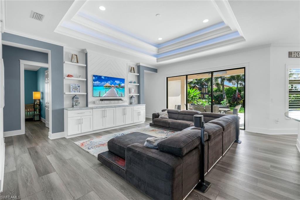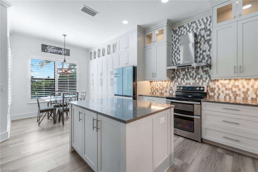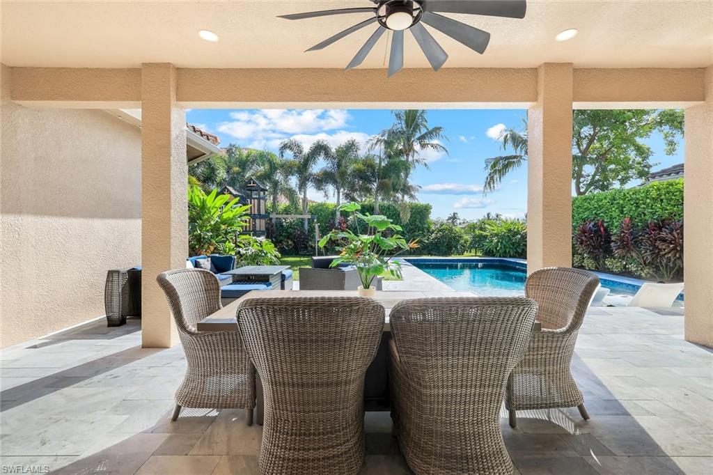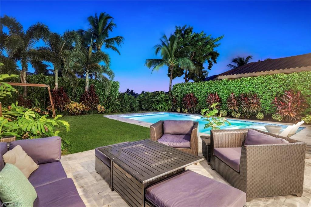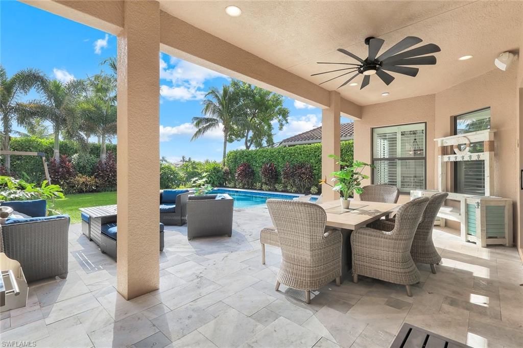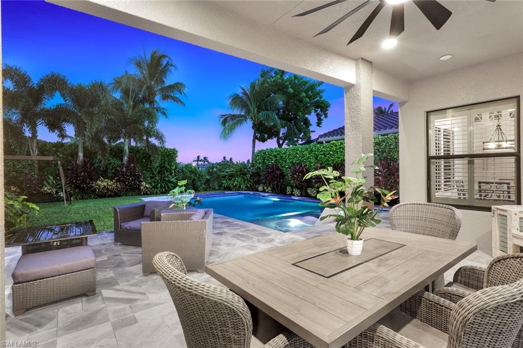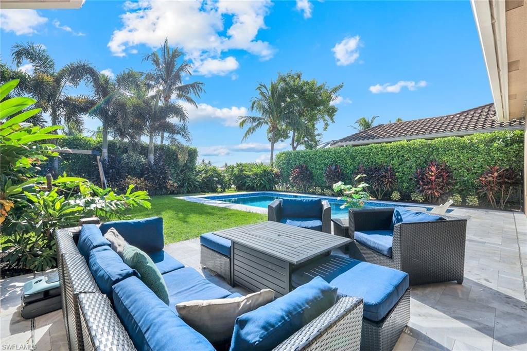 Escape the ordinary and discover your own private oasis. This updated Riverstone home offers 2,609 sq. ft. of beautifully refreshed living space and a backyard designed for both relaxation and play—perfect for enjoying the vibrant Naples lifestyle. Step inside and be greeted by a soaring 14-foot foyer that opens to a bright and inviting great room, complete with a custom built-in, shiplap accents and a dramatic double trey ceiling with color-changing uplighting. Entertain with ease in the remodeled gourmet kitchen featuring granite counters, floor-to-ceiling shaker cabinetry with glass accents and lighting, pull-outs, pot drawers, a vented hood, tile backsplash, and a central island. A Samsung Bespoke refrigerator, newer appliances, and a casual dining nook complete the chef’s dream space. The spacious primary suite is a true retreat, offering room for a sitting area, two custom walk-in closets, and a stunning updated bath with frameless glass shower, rain head and jets, a liner drain, and re-tiled tub surround. There’s room for everyone with three additional bedrooms, with versatility to use one as a den, office, or hobby room, plus two guest baths. Fine finishes include built-in closets throughout, LVP flooring, plantation shutters, tall baseboards and crown molding. A finished laundry room with 2024 LG washer/dryer, cabinets, and sink add both function and style. Peace of mind comes with a new A/C system (2024) with UV light and Iflow cleaning system. Out back, discover your own outdoor oasis. A custom, extra-large heated saltwater pool (2022) with sandblasted marble paver lanai anchors a private, fully fenced, landscaped setting. Relax or dine under the covered lanai, enjoy music through outdoor speakers, and let evenings glow with permanent LED soffit lighting. A fenced yard with lush landscaping and playset makes it as practical as it is fun. Located in Riverstone, a social, vacation-inspired community zoned for "A" rated schools. Recreation area includes a fitness center, social hall, resort & lap pools, spa, 5 Har-Tru tennis courts, basketball & pickleball court, tot lot & activities coordinator. Why wait for a vacation to feel tranquility when you can experience paradise every day?