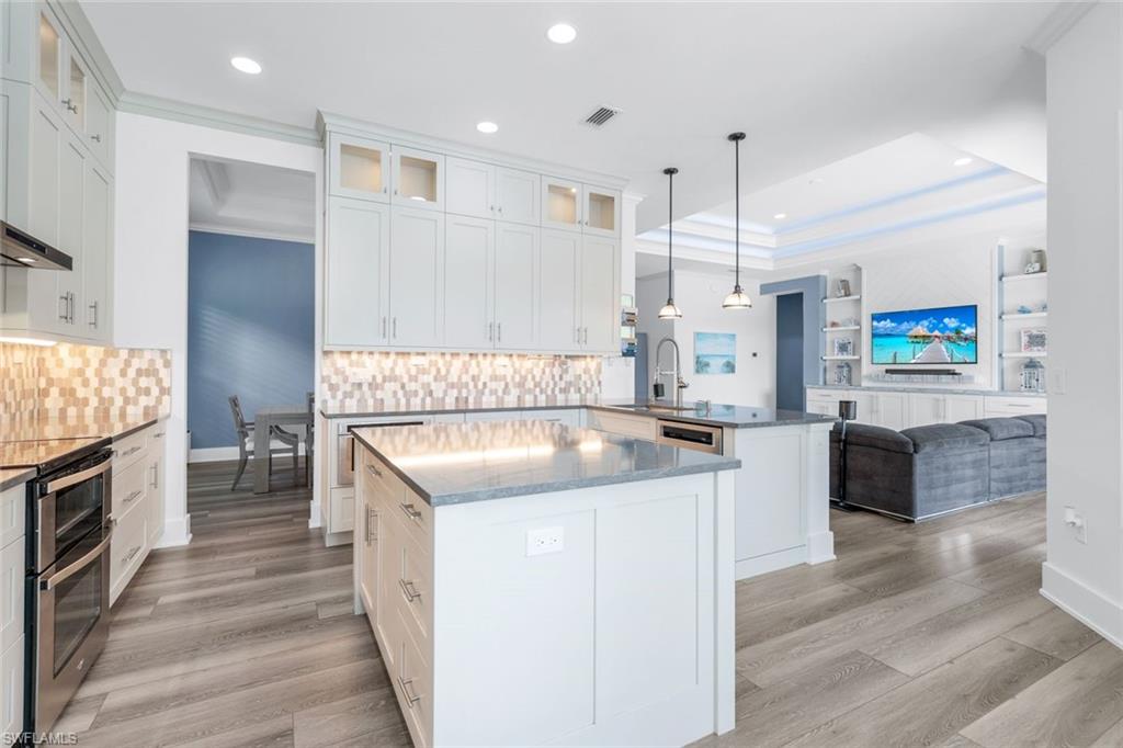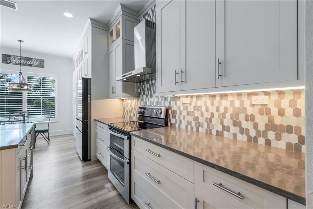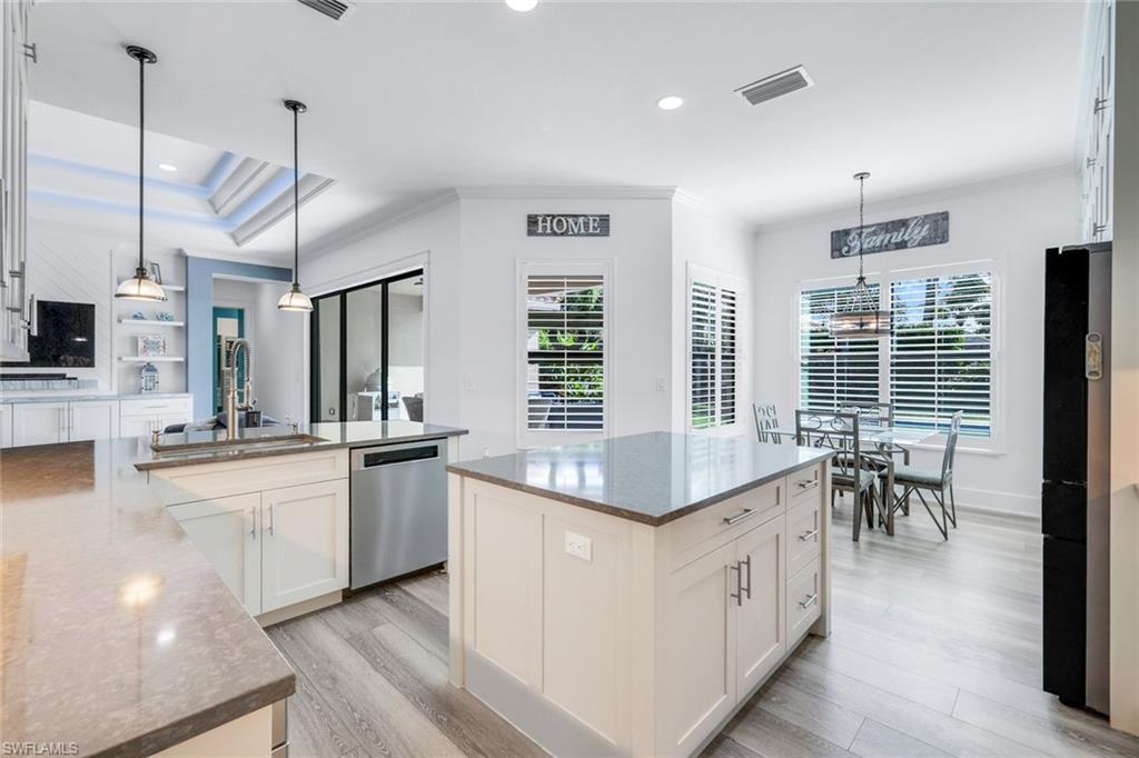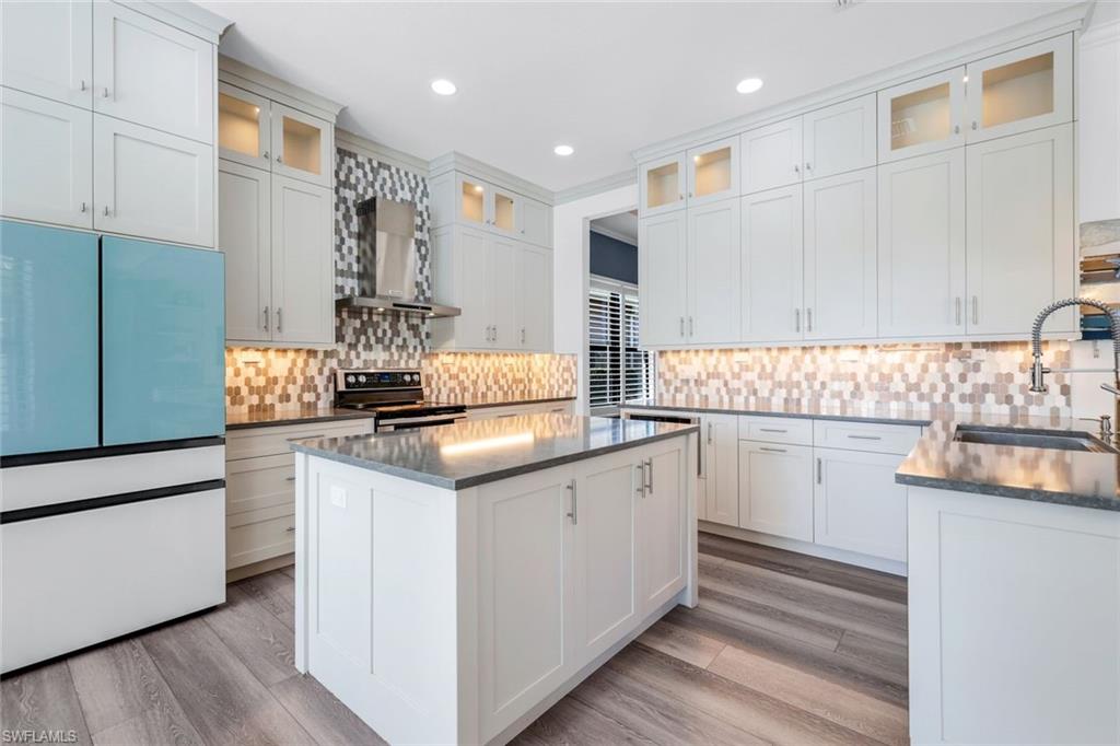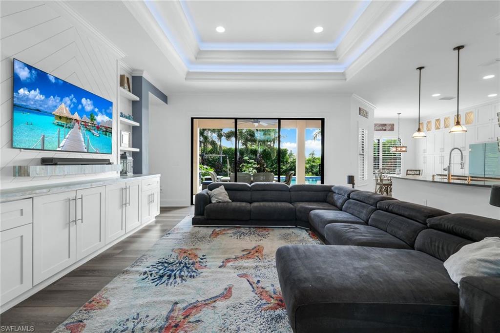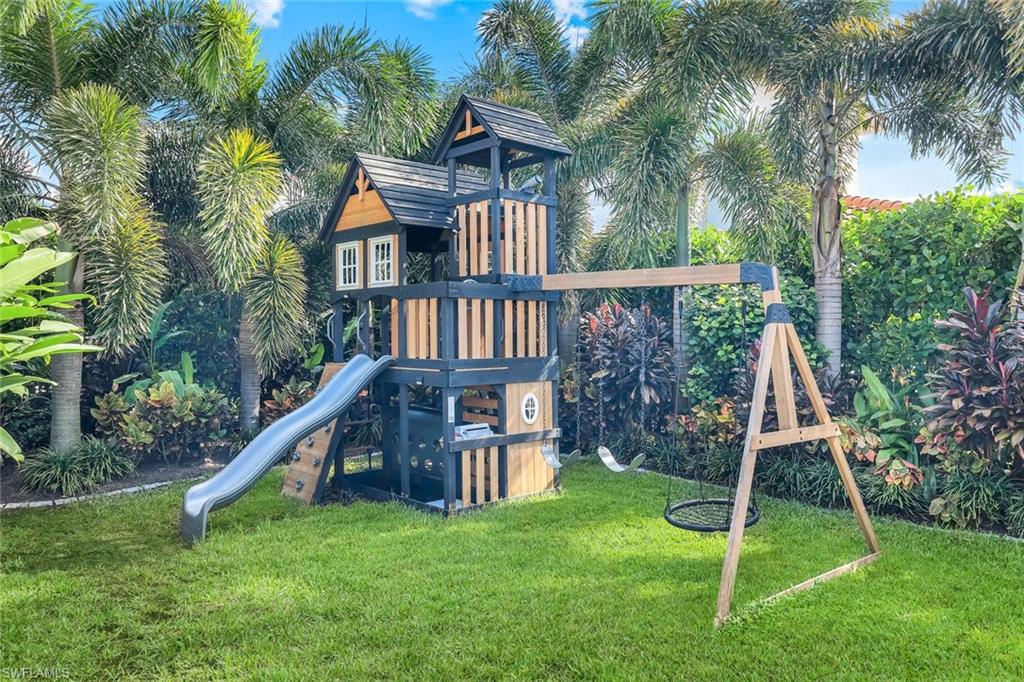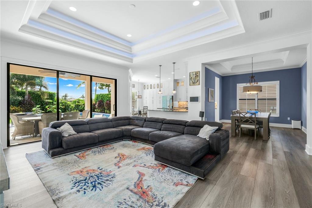 Escape the ordinary and discover your own private oasis. This updated Riverstone home offers 2,609 sq. ft. of beautifully refreshed living space and a backyard designed for both relaxation and play—perfect for enjoying the vibrant Naples lifestyle. Step inside and be greeted by a soaring 14-foot foyer that opens to a bright and inviting great room, complete with a custom built-in, shiplap accents and a dramatic double trey ceiling with color-changing uplighting. Entertain with ease in the remodeled gourmet kitchen featuring granite counters, floor-to-ceiling shaker cabinetry with glass accents and lighting, pull-outs, pot drawers, a vented hood, tile backsplash, and a central island. A Samsung Bespoke refrigerator, newer appliances, and a casual dining nook complete the chef’s dream space. The spacious primary suite is a true retreat, offering room for a sitting area, two custom walk-in closets, and a stunning updated bath with frameless glass shower, rain head and jets, a liner drain, and re-tiled tub surround. There’s room for everyone with three additional bedrooms, with versatility to use one as a den, office, or hobby room, plus two guest baths. Fine finishes include built-in closets throughout, LVP flooring, plantation shutters, tall baseboards and crown molding. A finished laundry room with 2024 LG washer/dryer, cabinets, and sink add both function and style. Peace of mind comes with a new A/C system (2024) with UV light and Iflow cleaning system. Out back, discover your own outdoor oasis. A custom, extra-large heated saltwater pool (2022) with sandblasted marble paver lanai anchors a private, fully fenced, landscaped setting. Relax or dine under the covered lanai, enjoy music through outdoor speakers, and let evenings glow with permanent LED soffit lighting. A fenced yard with lush landscaping and playset makes it as practical as it is fun. Located in Riverstone, a social, vacation-inspired community zoned for "A" rated schools. Recreation area includes a fitness center, social hall, resort & lap pools, spa, 5 Har-Tru tennis courts, basketball & pickleball court, tot lot & activities coordinator. Why wait for a vacation to feel tranquility when you can experience paradise every day?