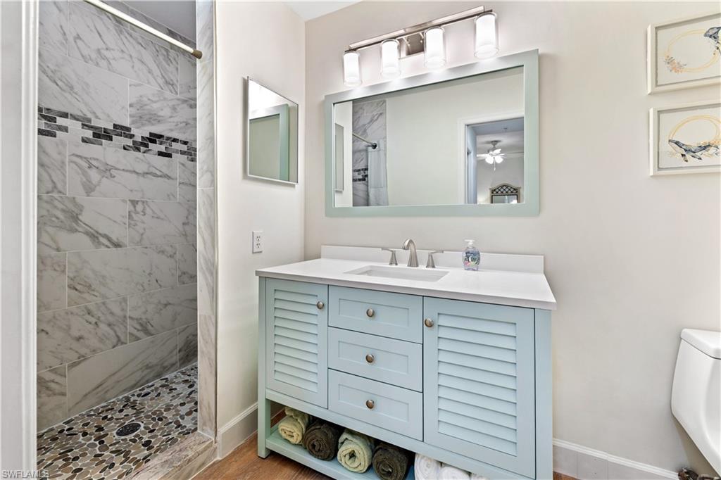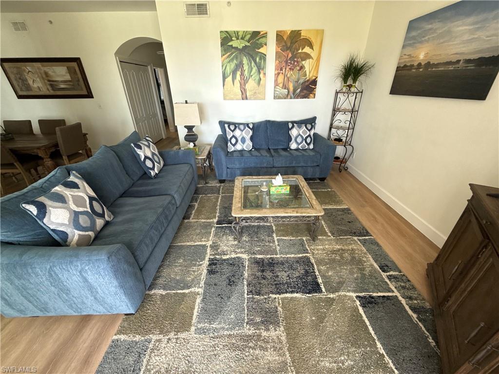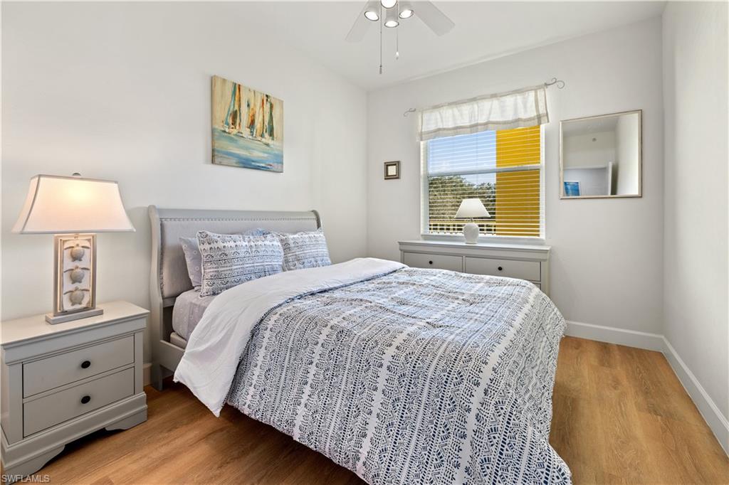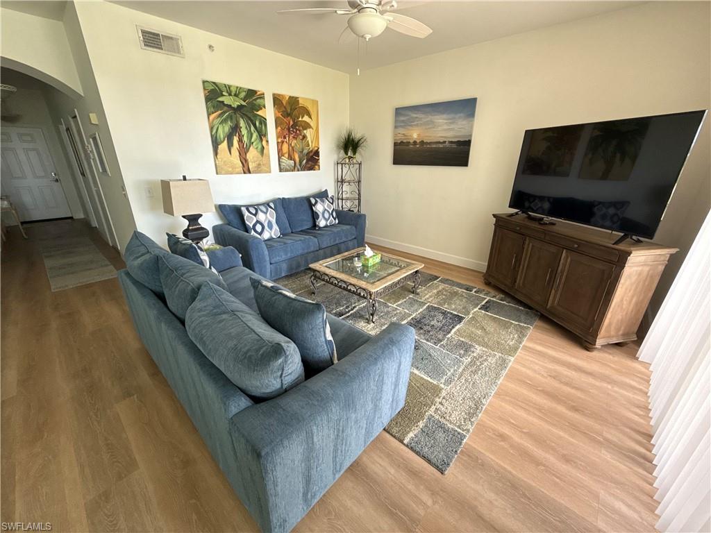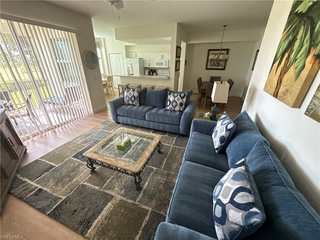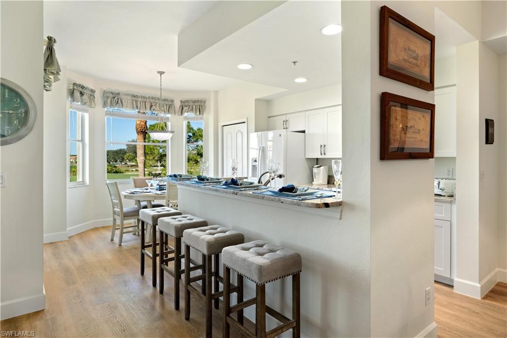 Golf Included! Tastefully remodeled 2-bedroom, 2-bath second-floor condo with western exposure, delivering stunning sunsets and a proven rental history. Offered turnkey furnished. Best of all, the golf membership does not have to be transferred when rented, allowing you to keep full access to golf and amenities for your own enjoyment. Inside, the kitchen showcases granite countertops and shaker-style cabinetry, complemented by luxury vinyl plank wood-look flooring throughout. The main bath features a remodeled shower with updated vanity and toilet, while the guest bath also includes newer finishes. Additional updates include impact windows, a newer AC, and a newer water heater for peace of mind. All of this is within a highly desirable bundled golf community offering a championship 18-hole golf course, brand-new resort pool with cabana bar, new restaurant, hot tub, pro shop, and newly added pickleball and tennis courts. Residents enjoy excellent dining, a friendly staff, and an active, welcoming community. Located just minutes from Bonita Beach and every convenience imaginable, this home blends effortless rental potential with the ultimate Florida golf lifestyle.