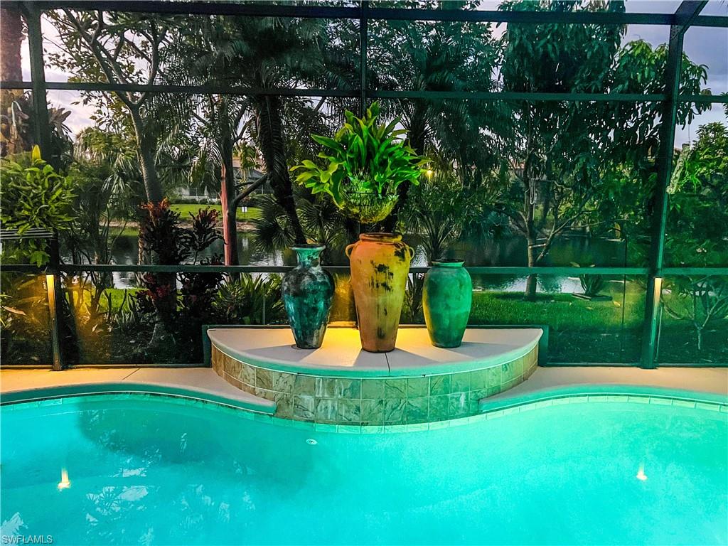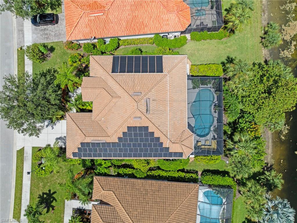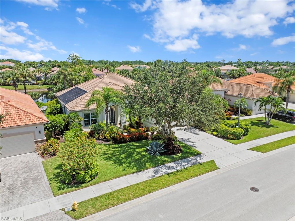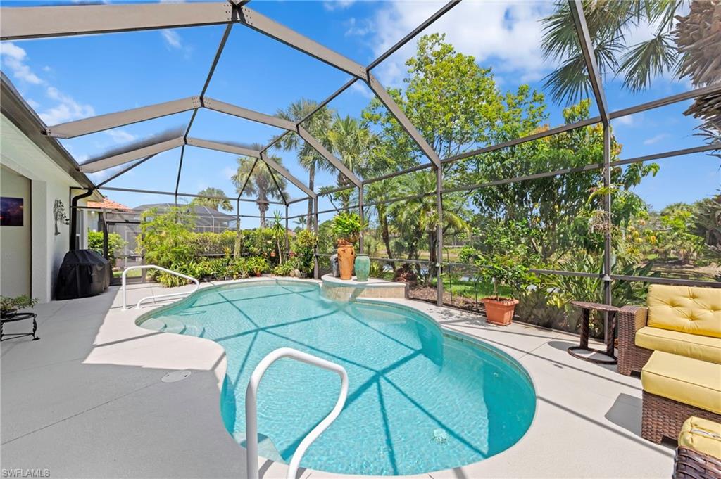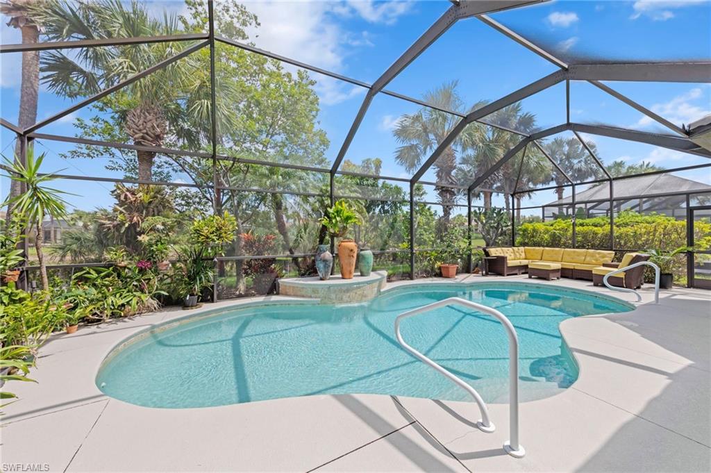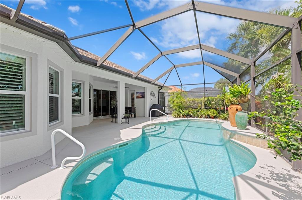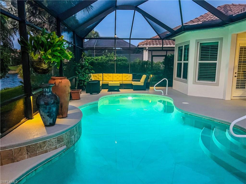 Introducing the remarkable Revere Model nestled in the Madison Park community, this exquisite residence boasts 3 spacious bedrooms, 3.5 baths, and an additional den, perfect for versatile living. The home showcases an expansive and luminous great room floor plan that invites abundant natural light, creating a warm and inviting atmosphere throughout. Among its many notable features, this property is equipped with a full home solar power system, impact-resistant windows, and elegant plantation shutters that add a touch of sophistication. The custom-designed primary closet offers ample storage, while smart home capabilities ensure modern convenience at your fingertips. Recent renovations include a newly updated pool cage and a freshly painted exterior, complemented by landscape lighting that highlights the stunning array of rare and exotic foliage surrounding the home. Inside, diagonal tile flooring flows seamlessly through the main living areas, while the bedrooms and den are adorned with beautiful hardwood floors, adding a touch of luxury. Unique architectural elements, such as arched doorways, decorative plant ledges, and soaring volume ceilings, contribute to the home's distinct character. The eat-in kitchen is a chef's delight, featuring granite countertops paired with white raised wood panel cabinetry, providing both functionality and style. The thoughtfully designed split-bedroom layout includes a convenient pool bath, ensuring privacy and comfort for guests. The expansive primary suite is a true retreat, complete with high-quality cabinetry, dual sinks in the master bath, a Jacuzzi bathtub, and a walk-in shower for a spa-like experience. Step outside to your private screened lanai, where you'll find a captivating pool set against a serene lake view, perfect for relaxation and entertaining. LOW HOA includes lawn care and up to one gig WIFI. Madison Park is ideally located, offering easy access to world-class dining, shopping, medical facilities, and the vibrant downtown Naples area, not to mention the famous white sugar sand beaches that Naples is renowned for. This exquisite property truly embodies the perfect blend of luxury and convenience, making it a must-see for discerning buyers.