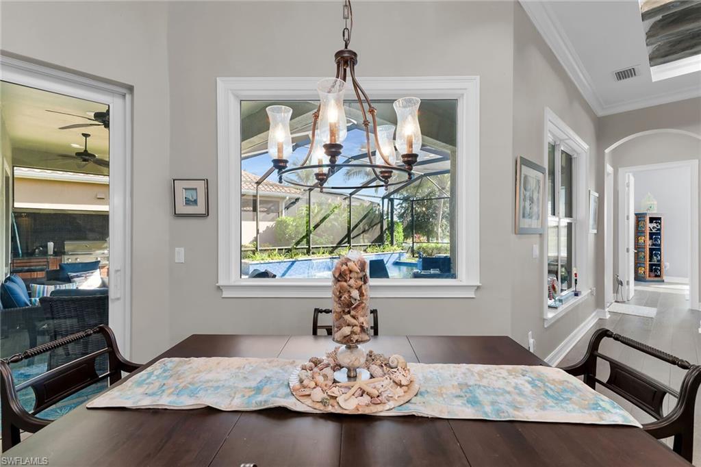 Experience luxurious waterfront living in this impeccably maintained home boasting a stunning long lake view in the sought-after Chiasso neighborhood of Fiddler’s Creek. Elegant details include coffered ceilings, crown molding, and decorative niches, complemented by impact-resistant windows and sliders throughout. At the heart of the home, the open-concept chef’s kitchen features new stainless steel appliances (2024), gas cooking, granite countertops, solid wood cabinetry, a butler’s pantry, a dry bar with custom wine shelving, and a spacious island ideal for entertaining. The split-bedroom layout ensures privacy, with the primary suite offering a jetted tub, a walk-in shower with multiple shower heads and massaging jets, and two guest ensuites—one showcasing four built-in, extra-length bunk beds. A versatile den with an adjacent full bath can easily serve as a fourth bedroom. Recent 2025 upgrades include two high-efficiency Trane A/C units, a Navien tankless water heater, and recessed LED wafer lighting. The three-car garage provides ample storage and is plumbed for a water softener. Enjoy effortless indoor-outdoor living with a custom outdoor kitchen featuring a gas grill, alongside a private gas-heated saltwater pool with waterfalls, spa, sun shelf, irrigated planter, new antenna for the iAquaLink pool control system (2025), and updated pool tiles (2023). A putting green and extended screened lanai complete this tranquil retreat. Located in the award-winning, amenity-rich community of Fiddler’s Creek, residents enjoy optional golf, a resort-style clubhouse, multiple pools, a full-service spa, fitness center, walking and biking trails, tennis, pickleball, beach club access, and on-site casual and fine dining—all just minutes from Marco Island and downtown Naples.