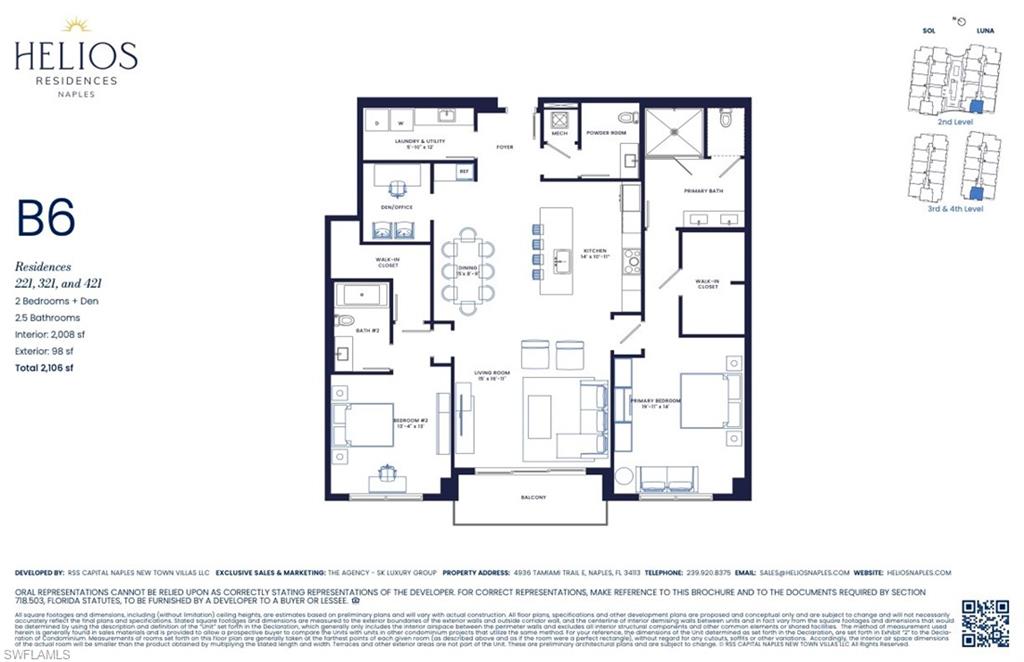Welcome to a luxurious living experience at Helios Residences Naples, FL. This exquisite multi-family condo, spanning 2,000 square feet, offers a blend of elegance and comfort, featuring 2 spacious bedrooms + Den and 2.5 well-appointed bathrooms. Embrace the upscale lifestyle in this mid-rise building that showcases northwestern exposure, bringing warmth and light through oversized windows. Step inside to discover a harmonious blend of interior finishes leading you to a chef's dream kitchen. Equipped with stainless steel appliances, an island, pantry, and open design, it's perfect for culinary creations and entertaining. The formal dining room, stunning foyer, and main floor primary suite enhance the sense of luxury. Each bathroom is thoughtfully designed, including a primary ensuite with double sinks. This development boasts a resort style pool, hot tub, sauna, activities lawn, and steam room for ultimate relaxation. Enjoy gatherings on the private terrace or in the common outdoor spaces featuring a barbecue area, dog run, and outdoor kitchen. Helios Residences redefines luxury in Naples with grand interiors by acclaimed firm Design West and over 20,000 square feet of curated amenities. From wellness and fitness to refined social spaces, every detail is designed for elevated everyday living. Perfectly positioned near downtown Naples fine dining, designer boutiques, and Gulf Coast beaches, Helios offers an effortlessly sophisticated lifestyle. Elevate your living experience in this premier residence where every detail is designed for your ultimate comfort and enjoyment.
