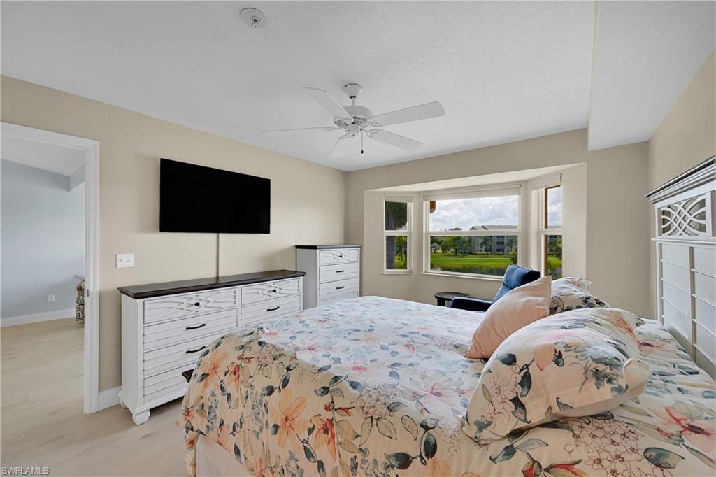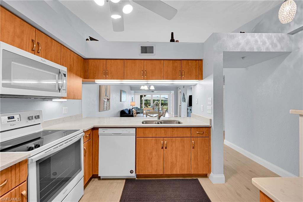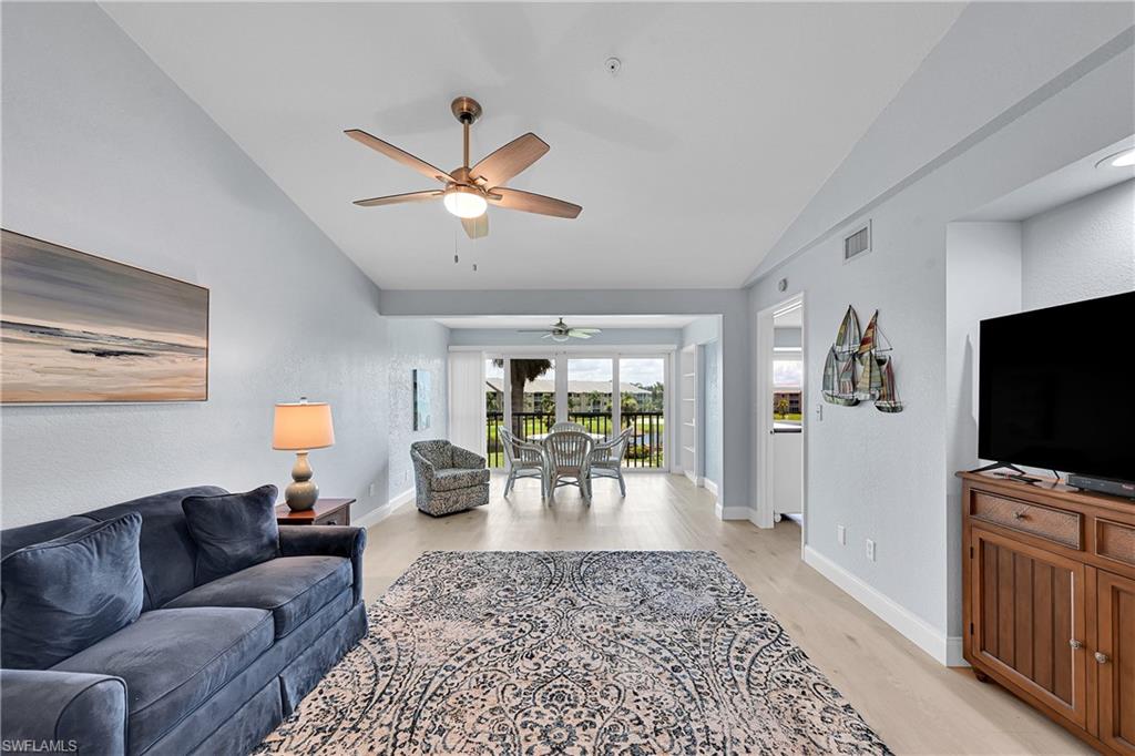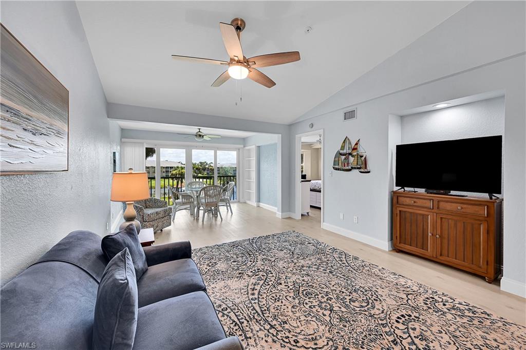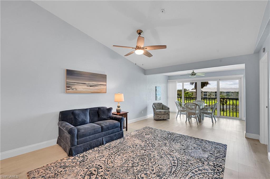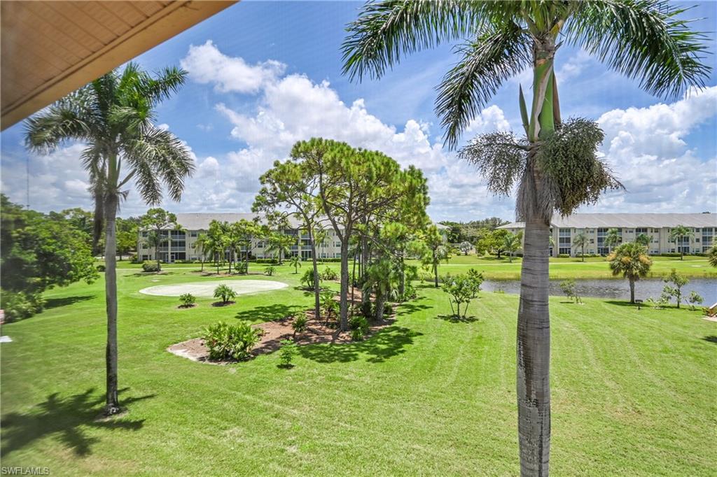 Turnkey top floor Bayview model with a terrific view being sold turnkey. Many upgrades and well maintained. Kitchen updated by Cornerstone Kitchens. Updated bathrooms including vanities with quartz countertops, tile showers and updated commode. Gorgeous views overlooking the golf course and lake. Tasteful laminate flooring throughout. Washer and dryer inside the home. The large lanai has heavy impact glass sliding doors and the original sliders are removed and the lanai floor raised to the level of the living room creating a spacious living area. Included is covered parking with an adjacent outdoor locker. The condo association has a patio area with barbeque grills that is perfect for their numerous community events and personal entertaining. Breckenridge is a friendly and socially active community has bundled golf with no cart fees, 5 pools, 8 Har Tru tennis courts, pickle ball, bocce, shuffle board and many activities in the renovated clubhouse. Estero is in the heart of Southwest Florida, only minutes from the airport, beaches, 3 huge shopping malls, restaurants galore, public library and state park. Short drive to Naples or Fort Myers. 5G WiFi is included. Please view this home using the virtual tour.