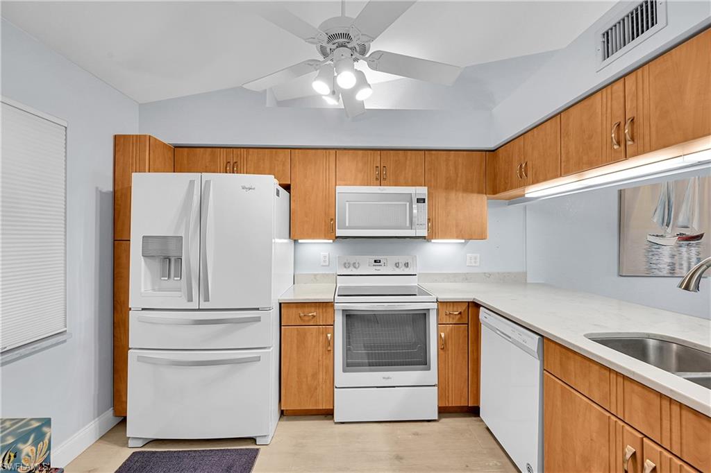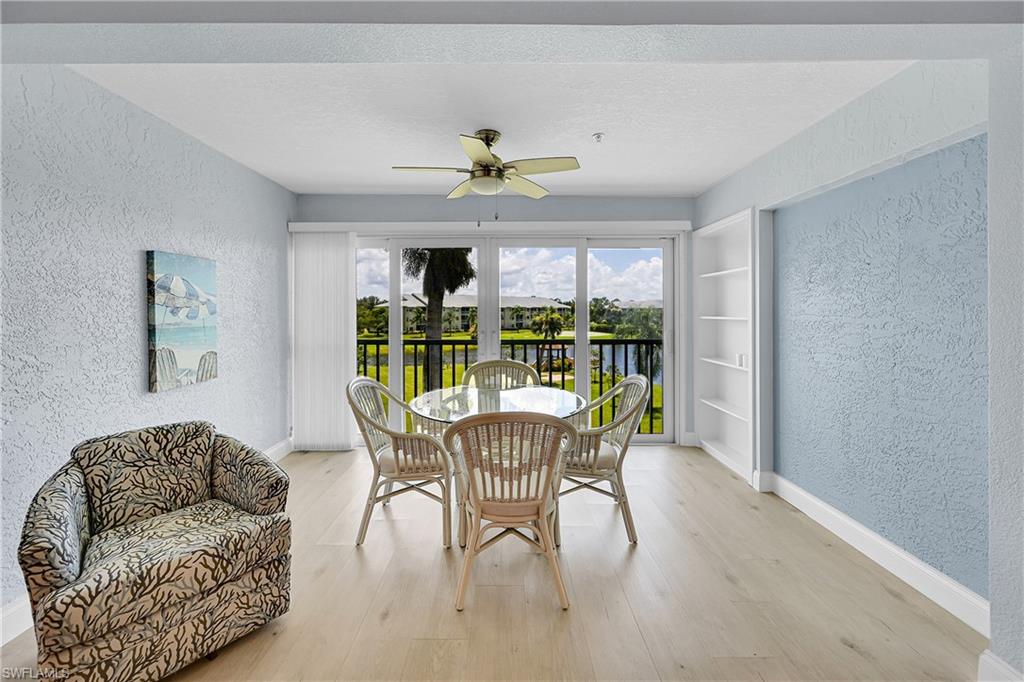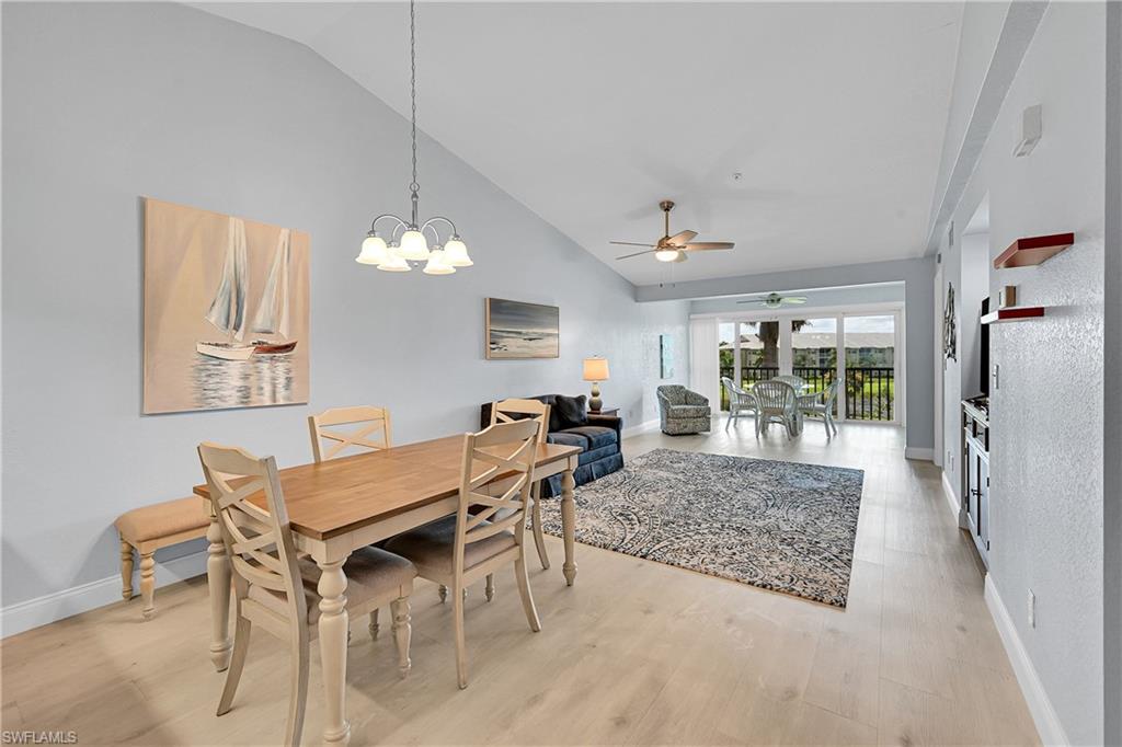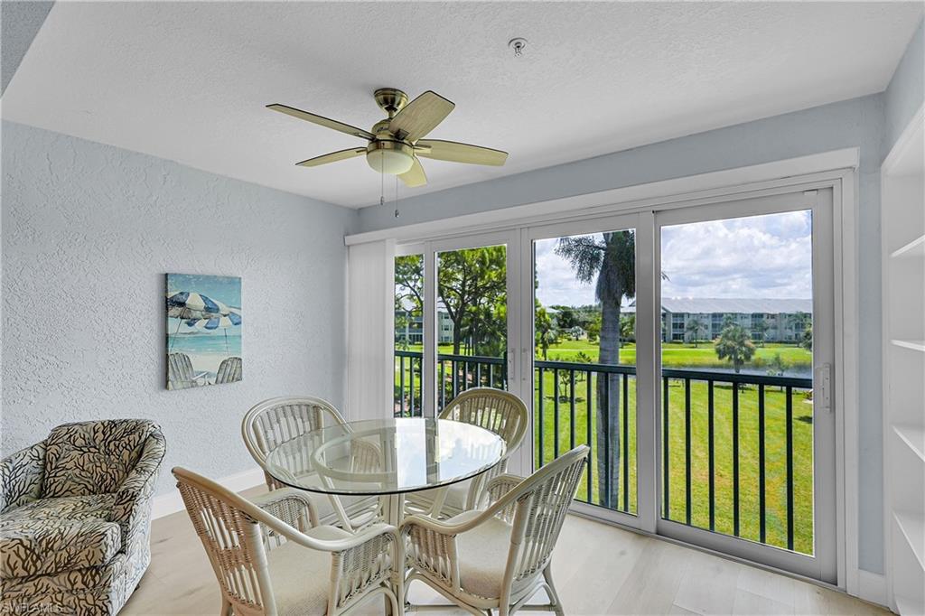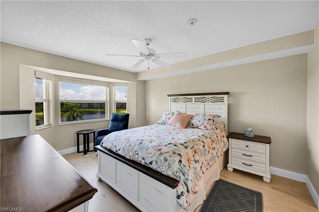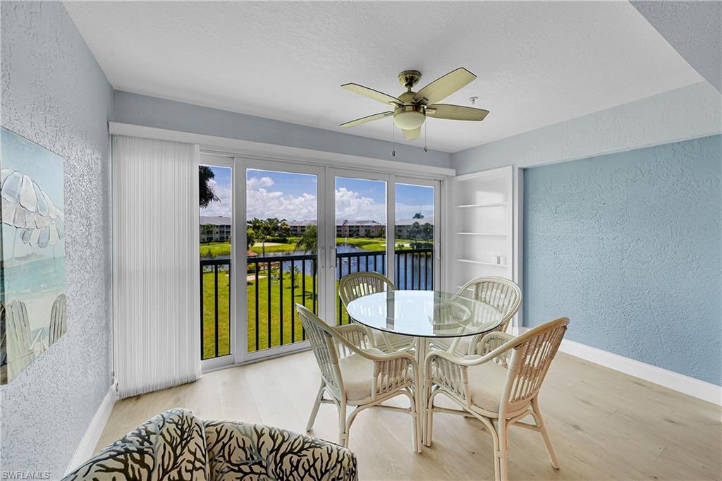Turnkey top floor Bayview model with a terrific view being sold turnkey. Many upgrades and well maintained. Kitchen updated by Cornerstone Kitchens. Updated bathrooms including vanities with quartz countertops, tile showers and updated commode. Gorgeous views overlooking the golf course and lake. Tasteful laminate flooring throughout. Washer and dryer inside the home. The large lanai has heavy impact glass sliding doors and the original sliders are removed and the lanai floor raised to the level of the living room creating a spacious living area. Included is covered parking with an adjacent outdoor locker. The condo association has a patio area with barbeque grills that is perfect for their numerous community events and personal entertaining. Breckenridge is a friendly and socially active community has bundled golf with no cart fees, 5 pools, 8 Har Tru tennis courts, pickle ball, bocce, shuffle board and many activities in the renovated clubhouse. Estero is in the heart of Southwest Florida, only minutes from the airport, beaches, 3 huge shopping malls, restaurants galore, public library and state park. Short drive to Naples or Fort Myers. 5G WiFi is included. Please view this home using the virtual tour.