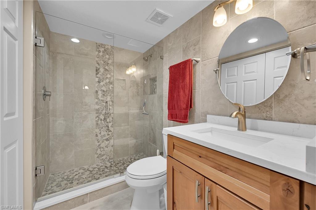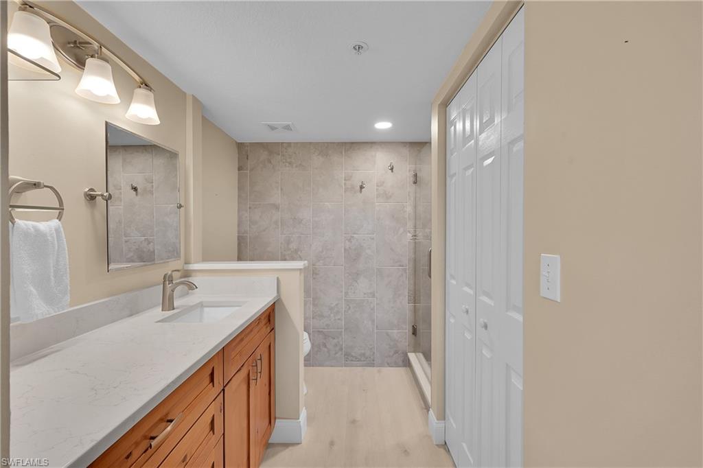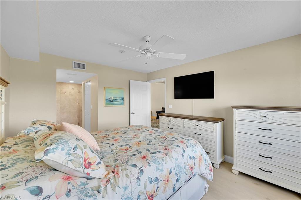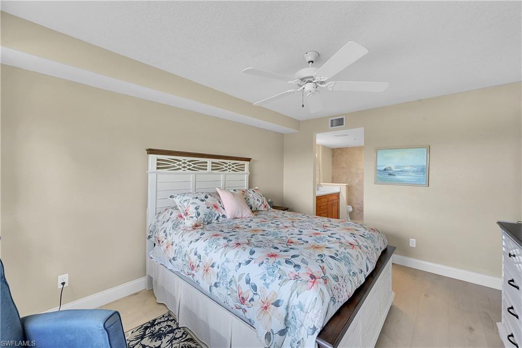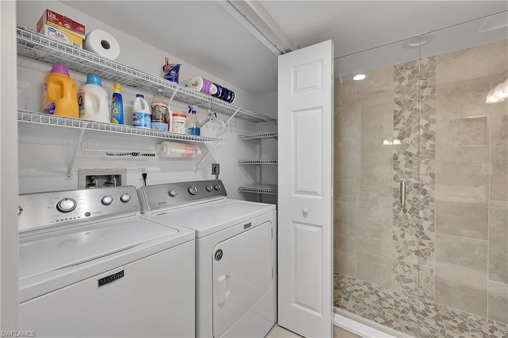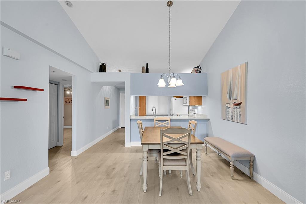 Turnkey top floor Bayview model with a terrific view being sold turnkey. Many upgrades and well maintained. Kitchen updated by Cornerstone Kitchens. Updated bathrooms including vanities with quartz countertops, tile showers and updated commode. Gorgeous views overlooking the golf course and lake. Tasteful laminate flooring throughout. Washer and dryer inside the home. The large lanai has heavy impact glass sliding doors and the original sliders are removed and the lanai floor raised to the level of the living room creating a spacious living area. Included is covered parking with an adjacent outdoor locker. The condo association has a patio area with barbeque grills that is perfect for their numerous community events and personal entertaining. Breckenridge is a friendly and socially active community has bundled golf with no cart fees, 5 pools, 8 Har Tru tennis courts, pickle ball, bocce, shuffle board and many activities in the renovated clubhouse. Estero is in the heart of Southwest Florida, only minutes from the airport, beaches, 3 huge shopping malls, restaurants galore, public library and state park. Short drive to Naples or Fort Myers. 5G WiFi is included. Please view this home using the virtual tour.