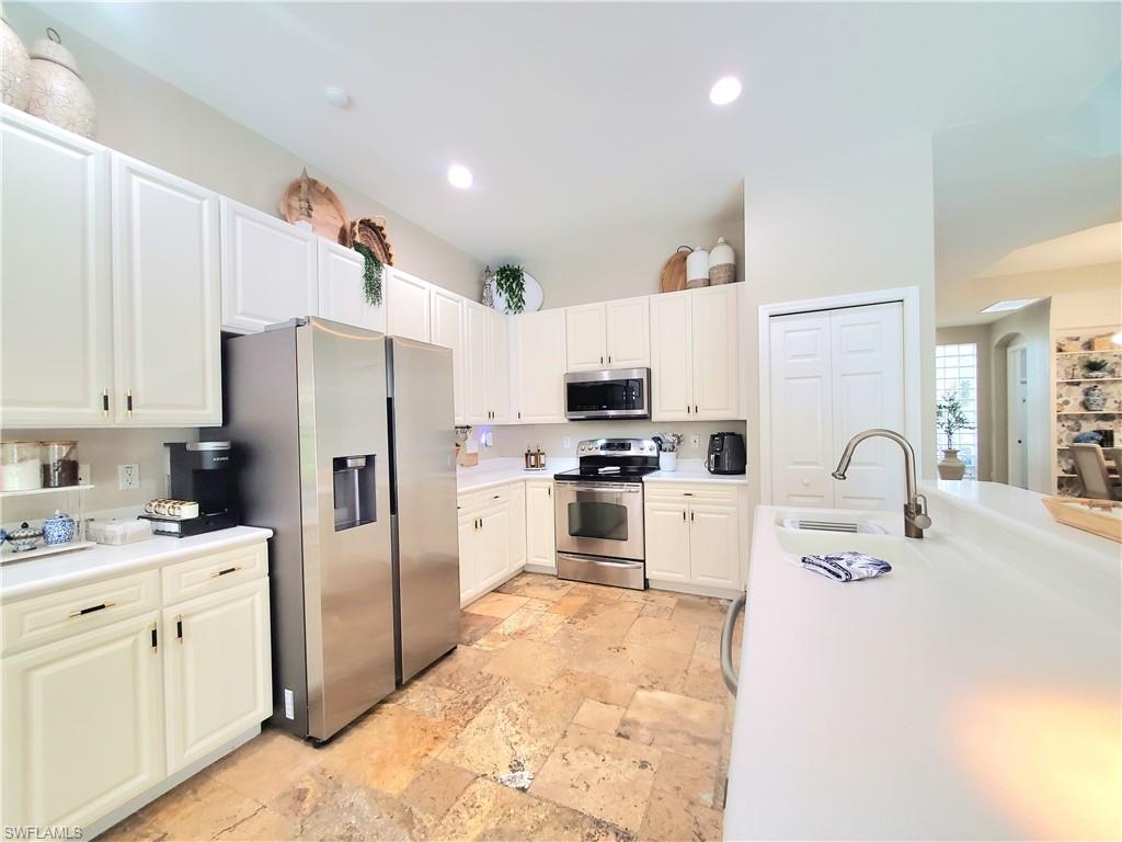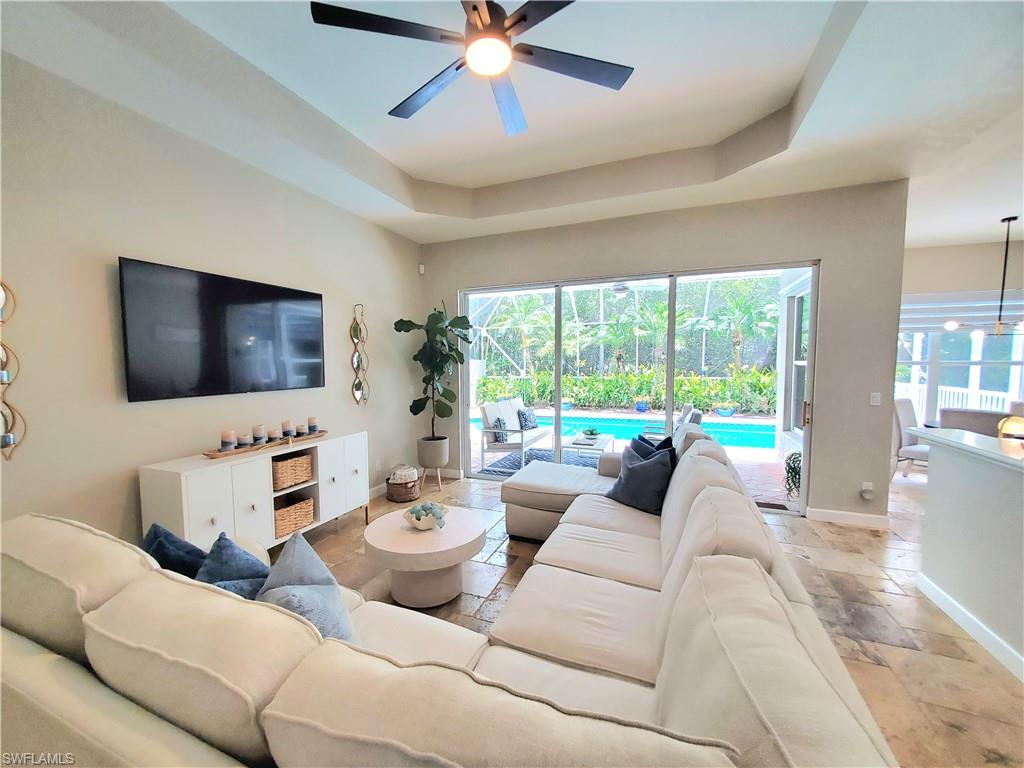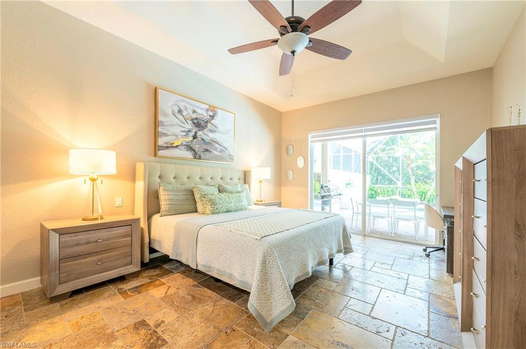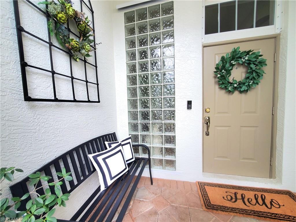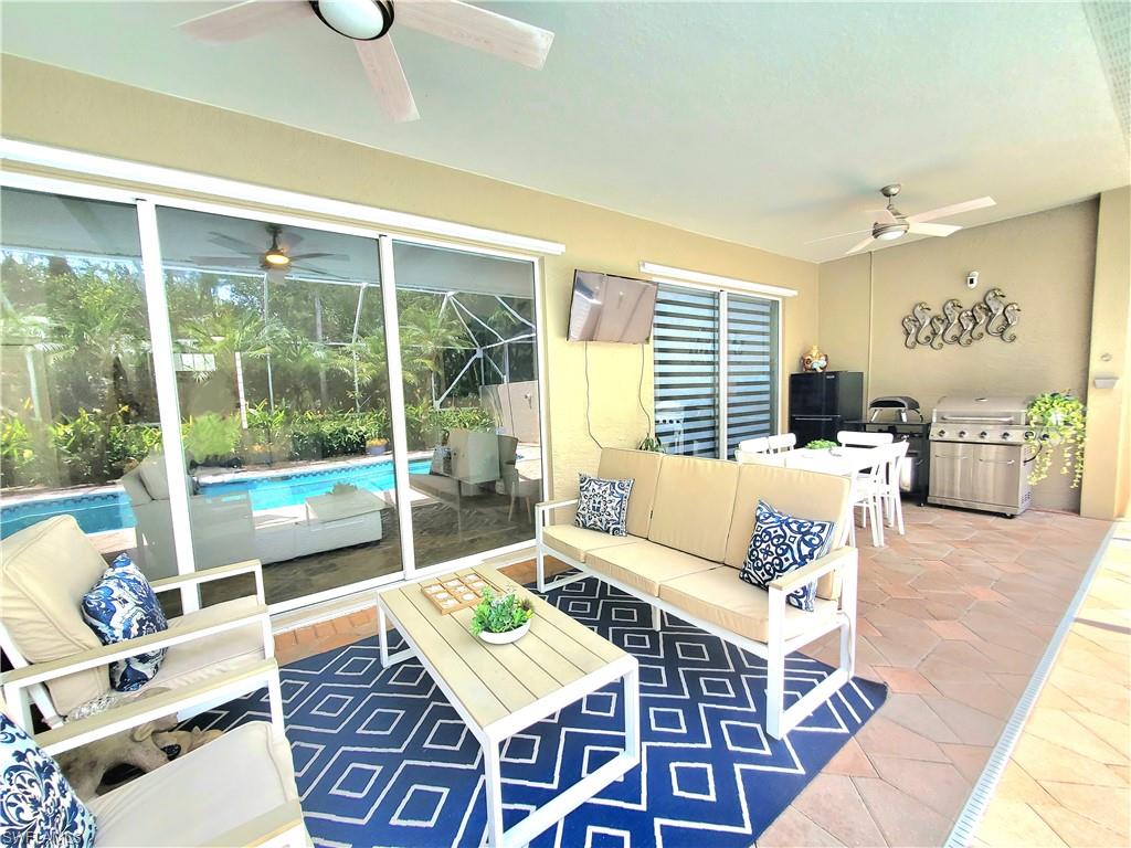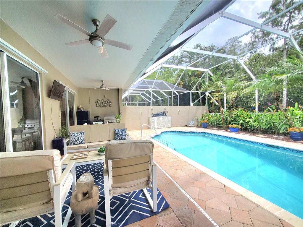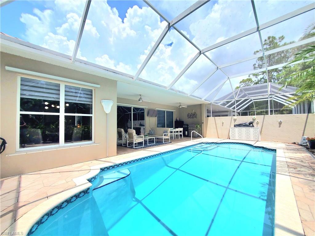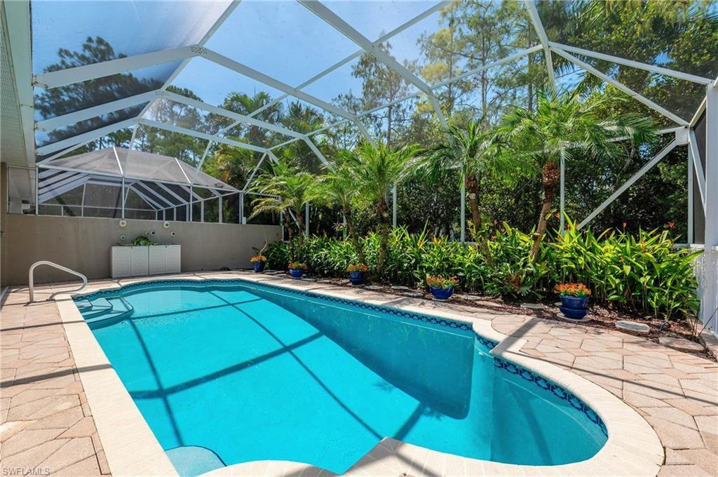 Live life Large in Naples, FL ! One of the most stunning, this updated 3 Bedroom villa Pool home is a largest floor plan at 1857 sqft under AC, set on a cul-de-sac with preferred Southern exposure and no flood insurance required. Here you embrace a lifestyle of Clubhouse amenities designed for relaxation, recreation, and connection. Screened entry leads into a foyer with soaring high ceilings. Imagine spending your days relaxing and sunning at your pool -- notably larger, with rare 12 foot deep end, in an oversized lanai, with lush plantings and private serene setting. New pool pump just installed. Extended under-roof area is ideal for Florida indoor-outdoor living and entertaining. Collapsing sliders lead to the eat-in kitchen with stainless steel appliances, large windows with pool views and island open to the living areas. Extra spacious primary bedroom has sliders pool access. Stunning main bathroom features new two-sink vanity, step-in shower, soaking tub, and separate water closet. Two super large walk-in closets have custom built-in shelving for your clothes and shoes. A split bedroom floor plan features another 2 bedrooms and bathroom up front that uniquely closes off with a door for an en-suite with ultimate privacy for you and your guests. All designer $39k travertine tile floors throughout and custom blinds on large windows for lots of natural light. The long paver driveway has ample parking for you and guests - and yard for fur babies in this pet friendly community. Storm shutters and Electric upgraded for generator Plug -in used for whole-house Standby power. Maintenance free living with lawn, mulch, trimming, painting, pest control all done for you. Enjoy rich amenities that come with your social membership in this gated community with lower costs and cable and internet included. No need to pay the extra golf fees but play iMay to Nov. Head to Clubhouse for dining, bar, golf similator, har-tru lit tennis courts, ping pong, billiards, library, card rooms, fire pit, events and much more. The Divot features a full fitness center, bocci, breakfast, lunch, bar, music and events. All conveniences are minutes out the front or back gates. Located just 4 miles from downtown Naples, beaches, shopping, and dining. Strong rental potential. Schedule showing or request Matterport virtual tour