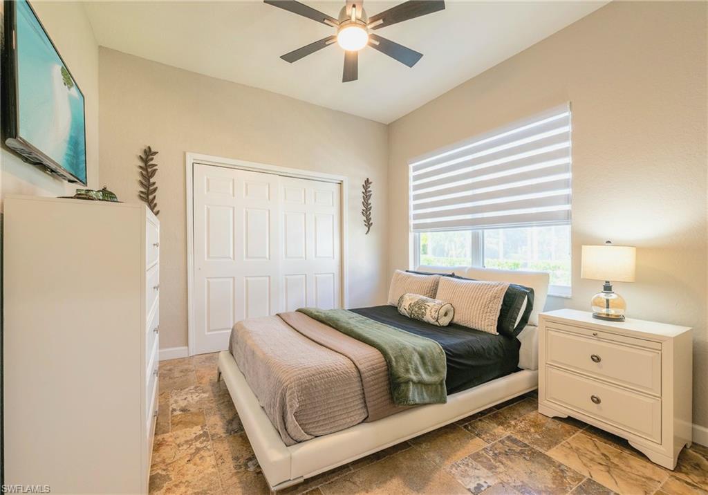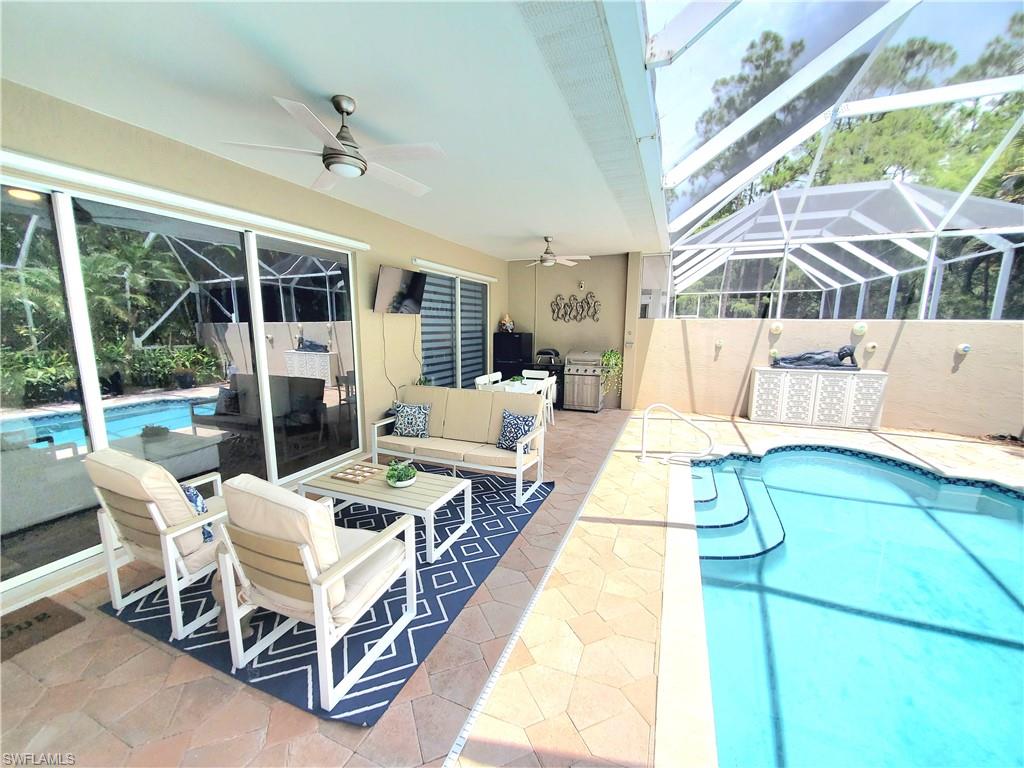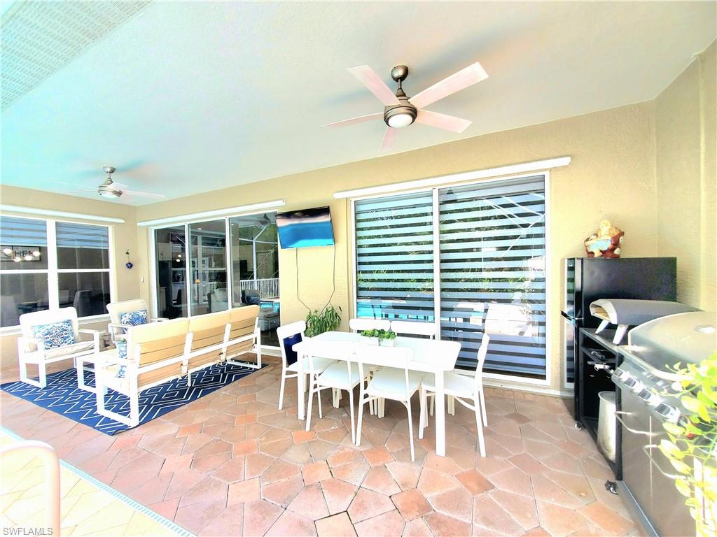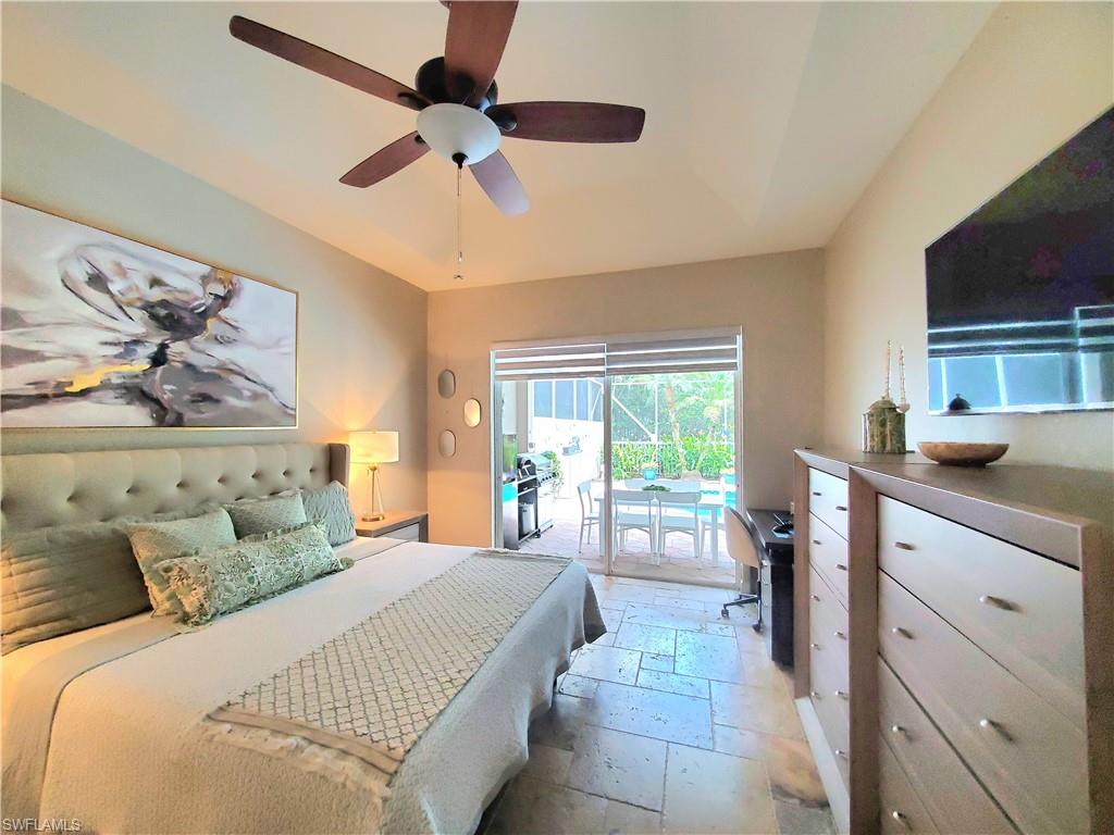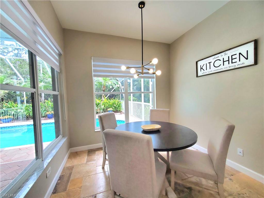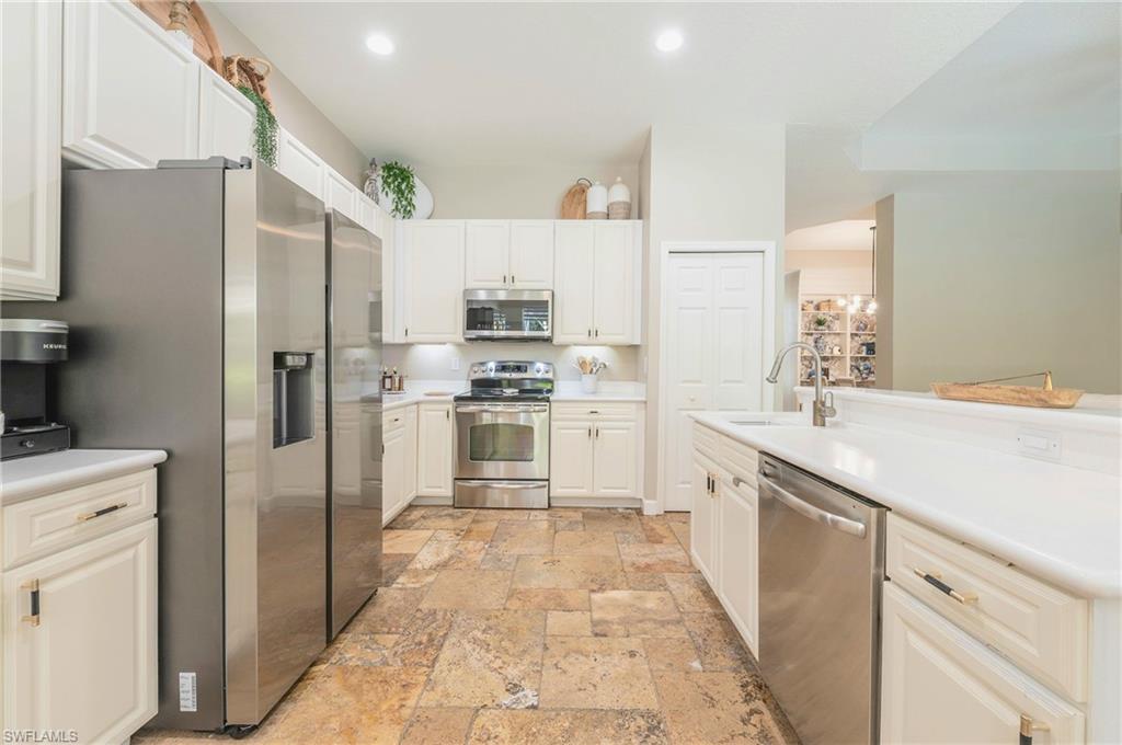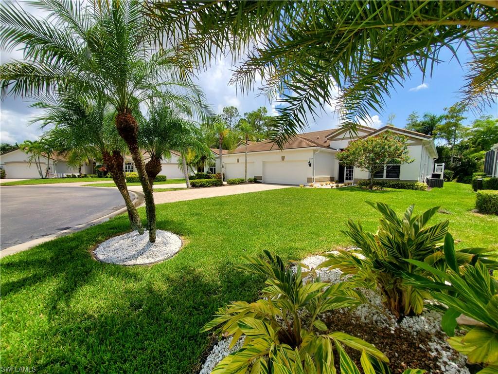 Live life Large in Naples, FL ! One of the most stunning, this updated 3 Bedroom villa Pool home is a largest floor plan at 1857 sqft under AC, set on a cul-de-sac with preferred Southern exposure and no flood insurance required. Here you embrace a lifestyle of Clubhouse amenities designed for relaxation, recreation, and connection. Screened entry leads into a foyer with soaring high ceilings. Imagine spending your days relaxing and sunning at your pool -- notably larger, with rare 12 foot deep end, in an oversized lanai, with lush plantings and private serene setting. New pool pump just installed. Extended under-roof area is ideal for Florida indoor-outdoor living and entertaining. Collapsing sliders lead to the eat-in kitchen with stainless steel appliances, large windows with pool views and island open to the living areas. Extra spacious primary bedroom has sliders pool access. Stunning main bathroom features new two-sink vanity, step-in shower, soaking tub, and separate water closet. Two super large walk-in closets have custom built-in shelving for your clothes and shoes. A split bedroom floor plan features another 2 bedrooms and bathroom up front that uniquely closes off with a door for an en-suite with ultimate privacy for you and your guests. All designer $39k travertine tile floors throughout and custom blinds on large windows for lots of natural light. The long paver driveway has ample parking for you and guests - and yard for fur babies in this pet friendly community. Storm shutters and Electric upgraded for generator Plug -in used for whole-house Standby power. Maintenance free living with lawn, mulch, trimming, painting, pest control all done for you. Enjoy rich amenities that come with your social membership in this gated community with lower costs and cable and internet included. No need to pay the extra golf fees but play iMay to Nov. Head to Clubhouse for dining, bar, golf similator, har-tru lit tennis courts, ping pong, billiards, library, card rooms, fire pit, events and much more. The Divot features a full fitness center, bocci, breakfast, lunch, bar, music and events. All conveniences are minutes out the front or back gates. Located just 4 miles from downtown Naples, beaches, shopping, and dining. Strong rental potential. Schedule showing or request Matterport virtual tour