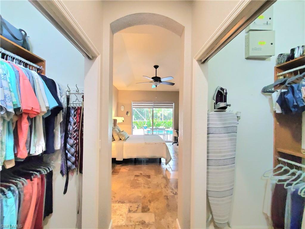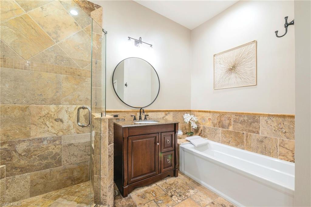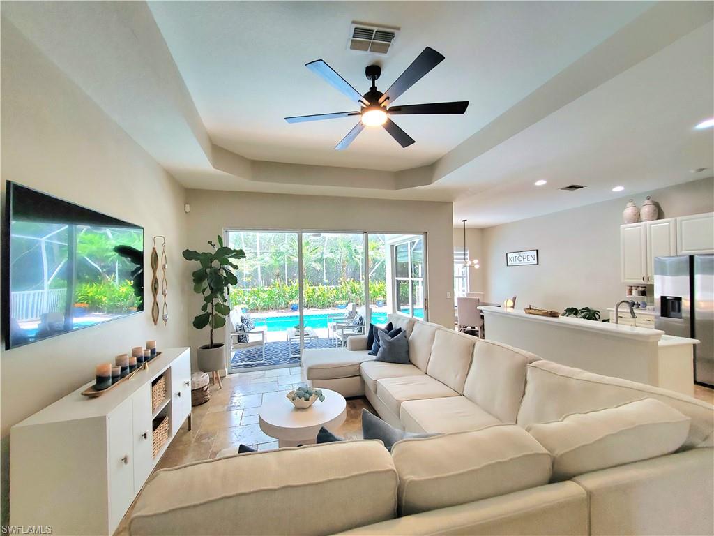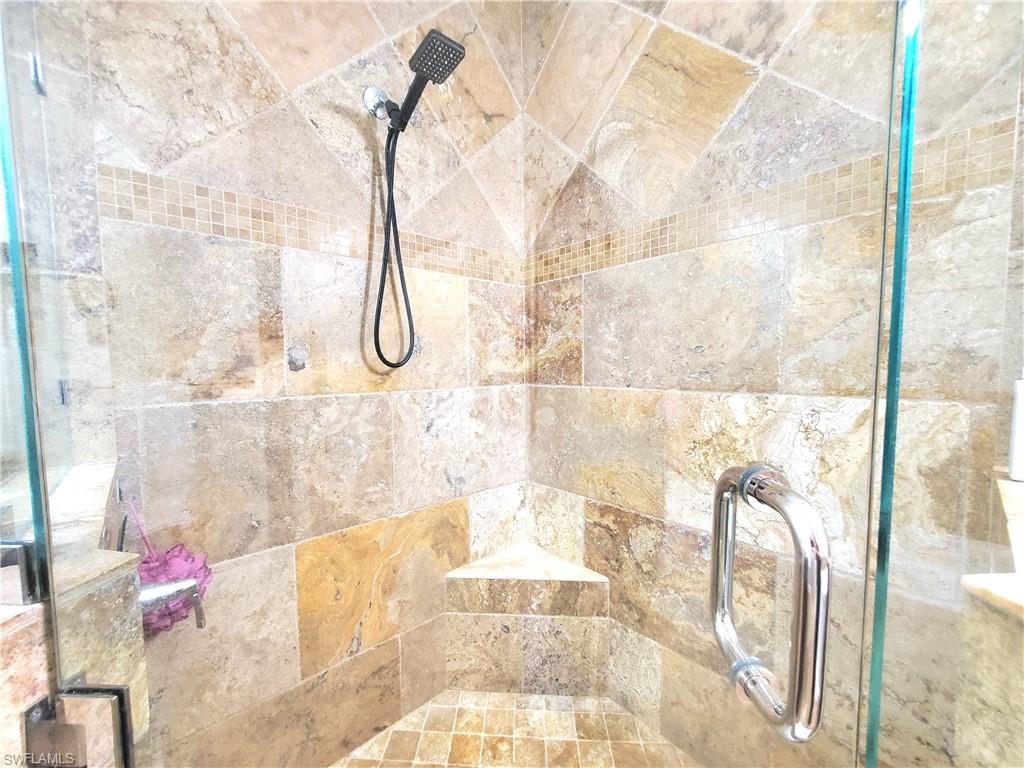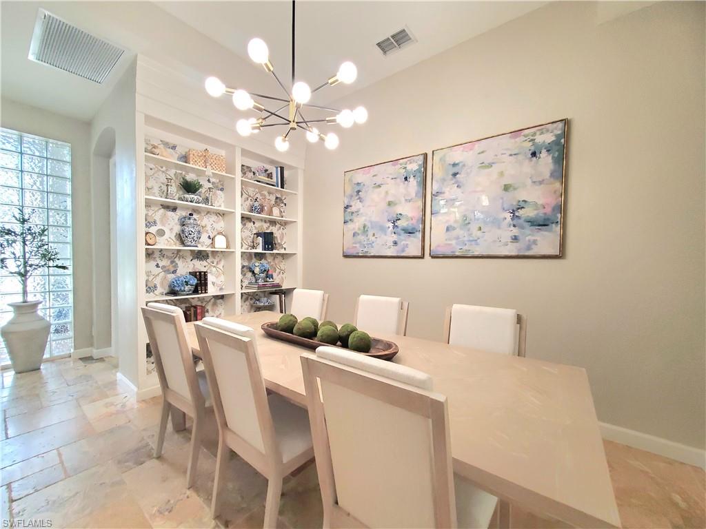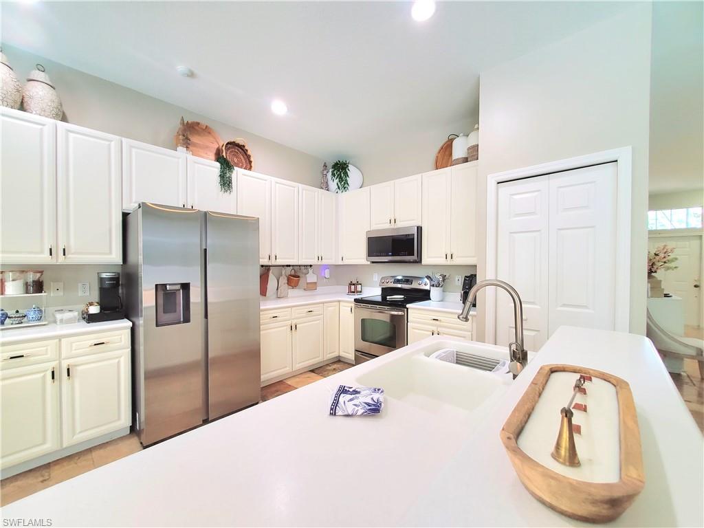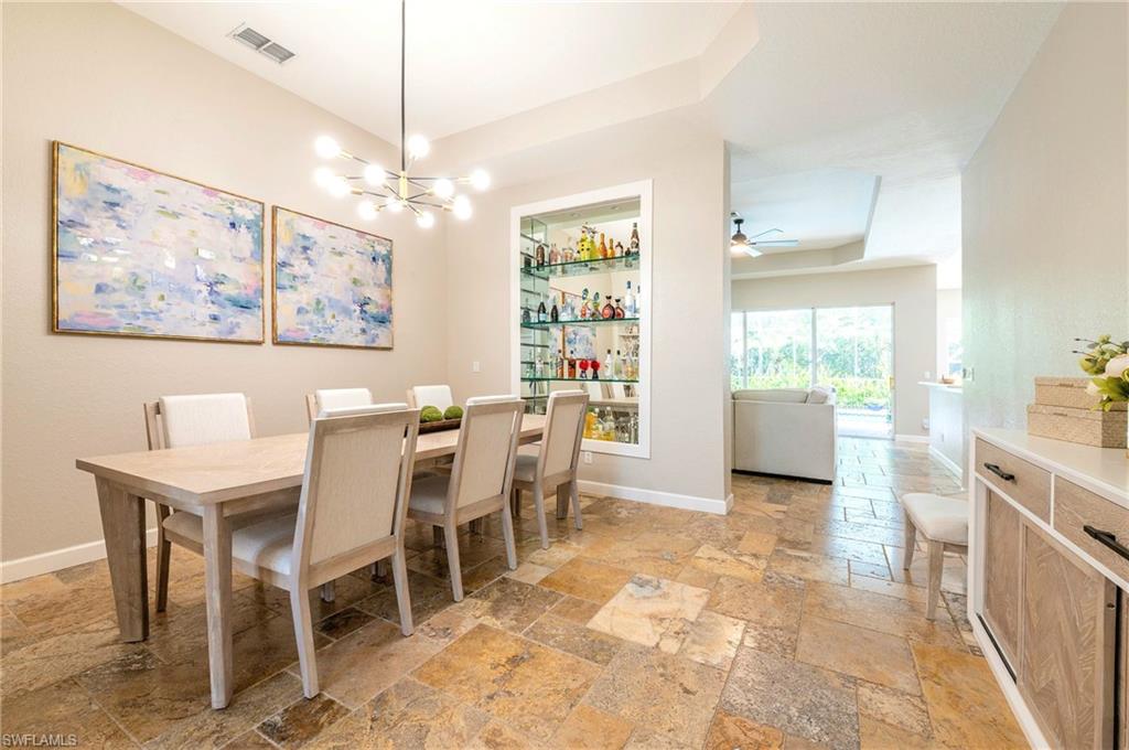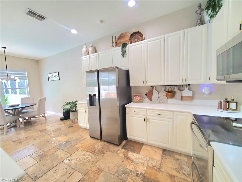Live life Large in Naples, FL ! One of the most stunning, this updated 3 Bedroom villa Pool home is a largest floor plan at 1857 sqft under AC, set on a cul-de-sac with preferred Southern exposure and no flood insurance required. Here you embrace a lifestyle of Clubhouse amenities designed for relaxation, recreation, and connection. Screened entry leads into a foyer with soaring high ceilings. Imagine spending your days relaxing and sunning at your pool -- notably larger, with rare 12 foot deep end, in an oversized lanai, with lush plantings and private serene setting. New pool pump just installed. Extended under-roof area is ideal for Florida indoor-outdoor living and entertaining. Collapsing sliders lead to the eat-in kitchen with stainless steel appliances, large windows with pool views and island open to the living areas. Extra spacious primary bedroom has sliders pool access. Stunning main bathroom features new two-sink vanity, step-in shower, soaking tub, and separate water closet. Two super large walk-in closets have custom built-in shelving for your clothes and shoes. A split bedroom floor plan features another 2 bedrooms and bathroom up front that uniquely closes off with a door for an en-suite with ultimate privacy for you and your guests. All designer $39k travertine tile floors throughout and custom blinds on large windows for lots of natural light. The long paver driveway has ample parking for you and guests - and yard for fur babies in this pet friendly community. Storm shutters and Electric upgraded for generator Plug -in used for whole-house Standby power. Maintenance free living with lawn, mulch, trimming, painting, pest control all done for you. Enjoy rich amenities that come with your social membership in this gated community with lower costs and cable and internet included. No need to pay the extra golf fees but play iMay to Nov. Head to Clubhouse for dining, bar, golf similator, har-tru lit tennis courts, ping pong, billiards, library, card rooms, fire pit, events and much more. The Divot features a full fitness center, bocci, breakfast, lunch, bar, music and events. All conveniences are minutes out the front or back gates. Located just 4 miles from downtown Naples, beaches, shopping, and dining. Strong rental potential. Schedule showing or request Matterport virtual tour