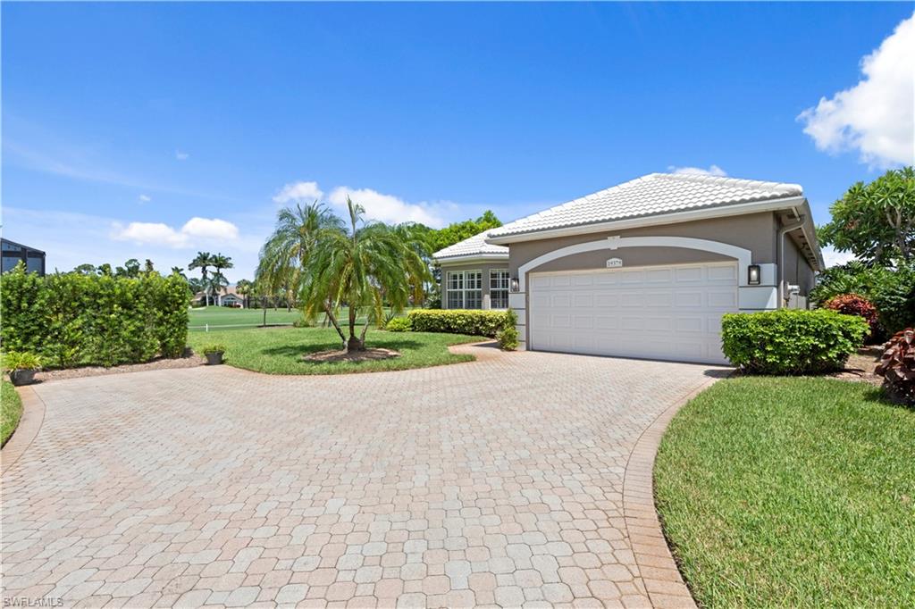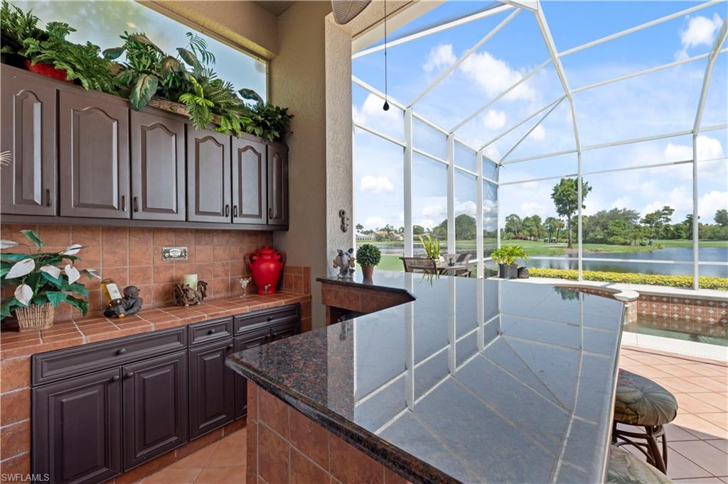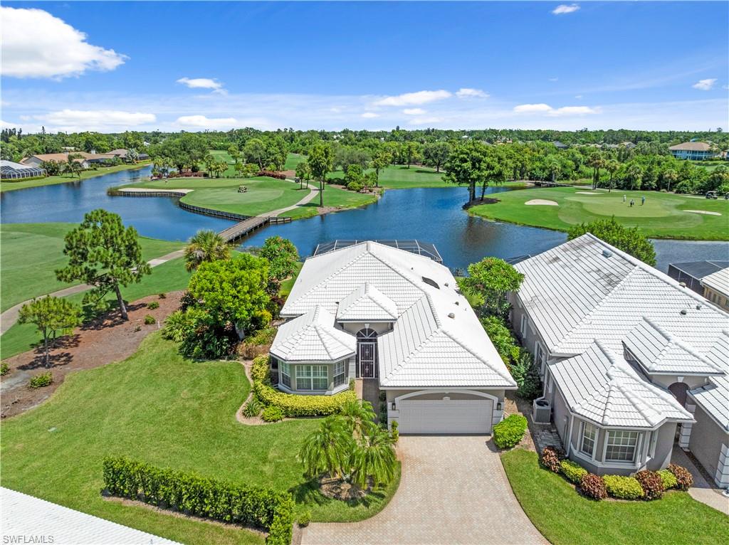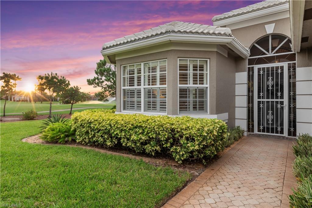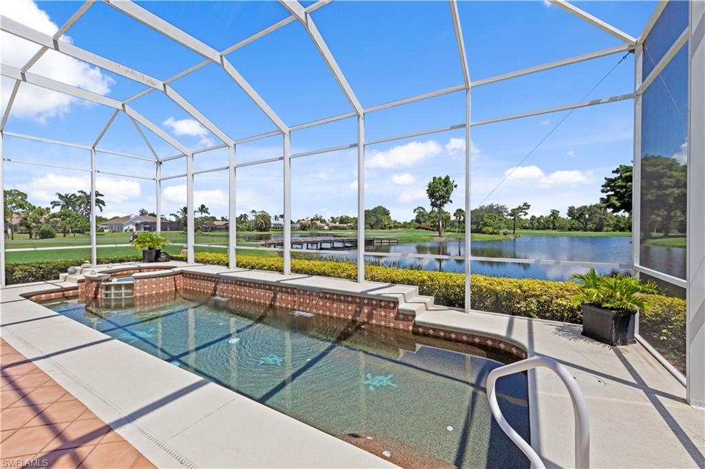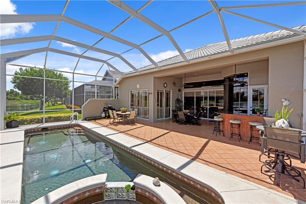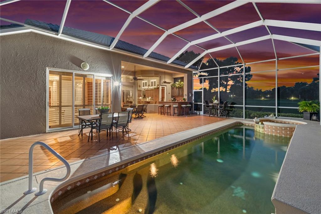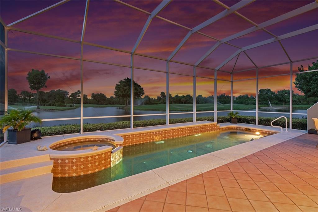 Nestled on one of the most sought-after lots in The Vines, this beautifully maintained home offers the best view in the community. Perfectly positioned on an oversized corner lot, it captures sweeping northern vistas of the golf course and serene lake—providing a stunning backdrop for everyday living. Step outside to your own private oasis, complete with a sparkling pool and spa, an expansive screened lanai, and a built-in dry bar—ideal for entertaining. A long paver driveway provides ample parking, while the screened front entry and impact-resistant windows with an electric roll-down at the entry offer style and peace of mind. Inside, the spacious layout features 2 bedrooms plus a large office, a generous family room with sliding glass doors that open seamlessly to the lanai, and 24” tile flooring throughout the main living areas and guest room. The primary suite boasts warm wood flooring, dual sinks with an additional seated vanity, and a walk-in closet. The kitchen offers upgraded cabinetry, granite countertops, tile backsplash, stainless steel appliances, and both a cozy breakfast nook and a formal dining space. Custom built-in cabinetry adds function and charm throughout. Living in The Vines at Estero Country Club means enjoying a vibrant, gated community known for its friendly atmosphere, beautifully manicured grounds, and no wait list for golf memberships. Amenities include a championship 18-hole golf course, active tennis and pickleball programs, bocce courts, a fitness center, and a lively clubhouse hosting year-round events and dining. This exceptional property combines elegant living spaces, enviable views, and a premier location just minutes from world-class shopping, dining, beaches, and RSW Airport.