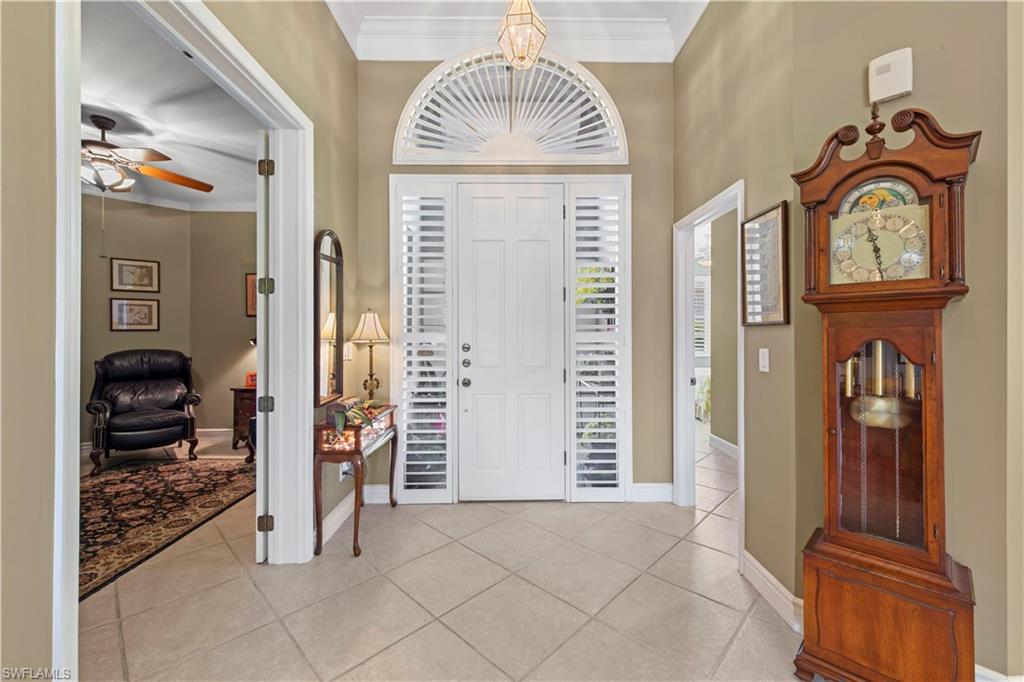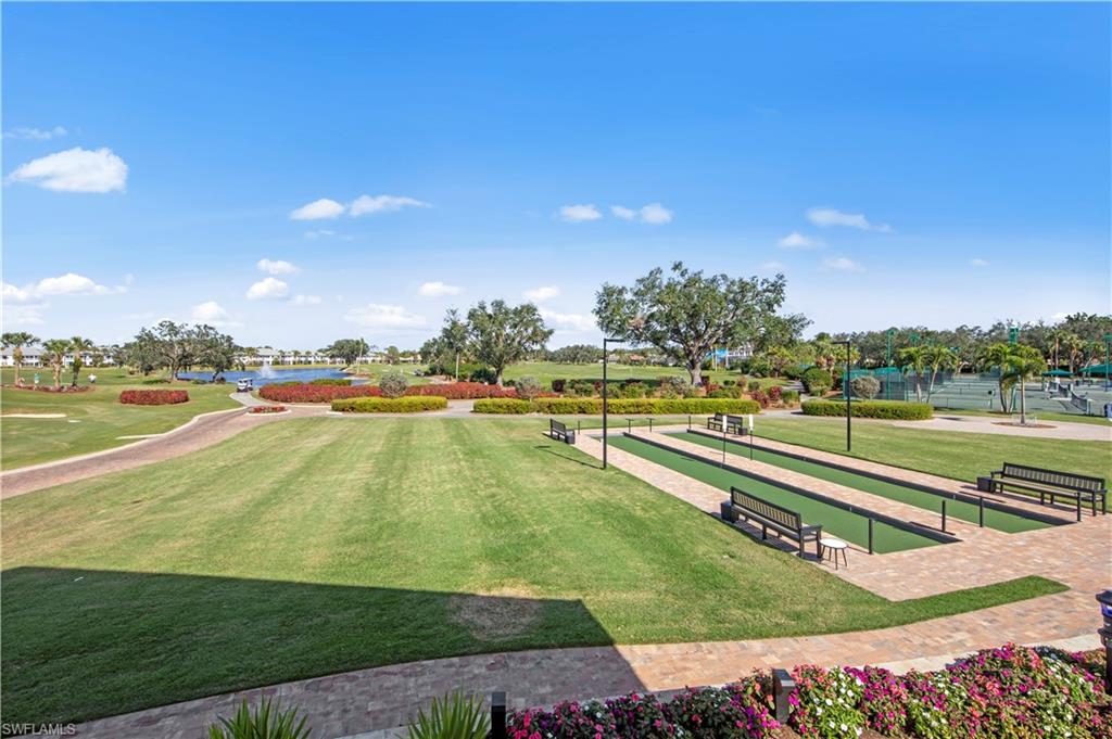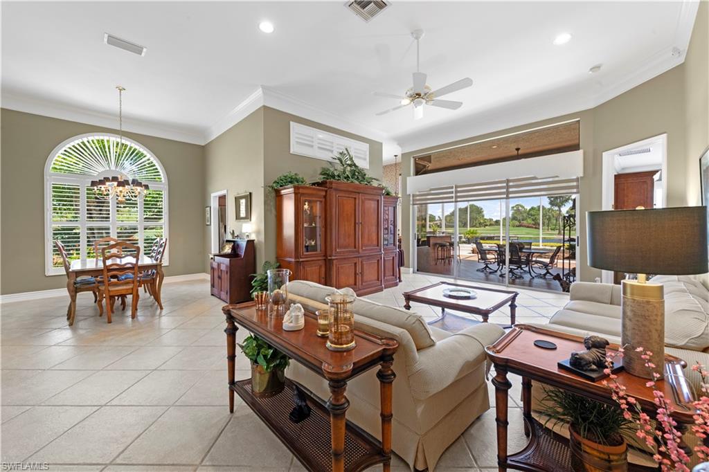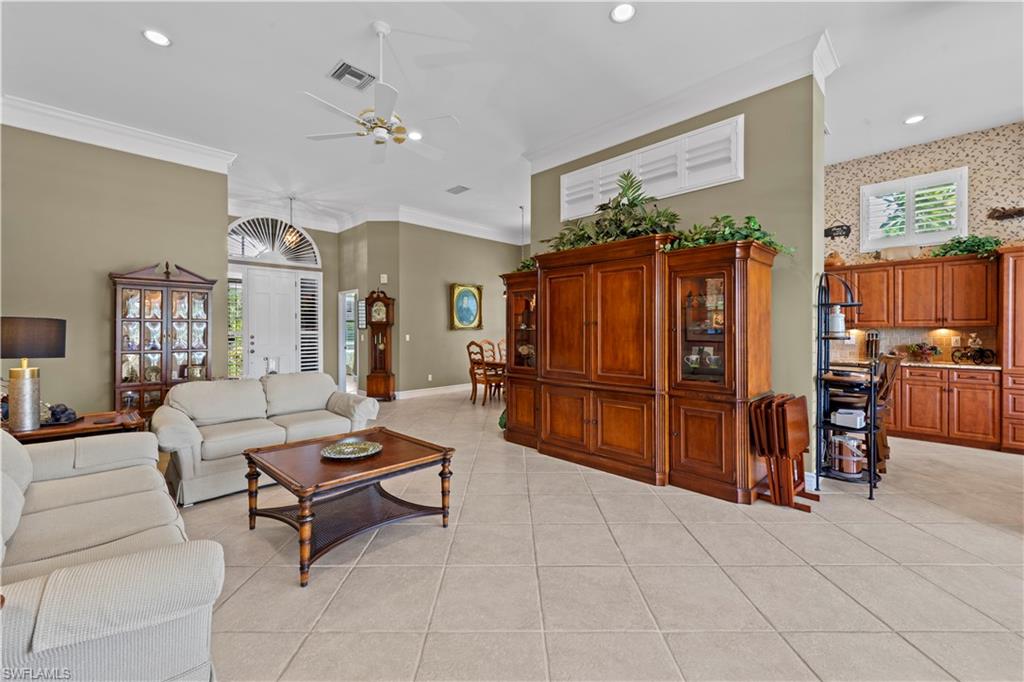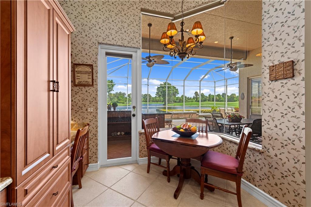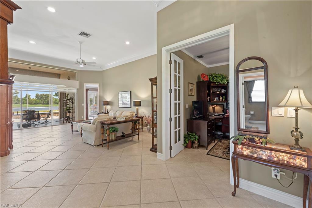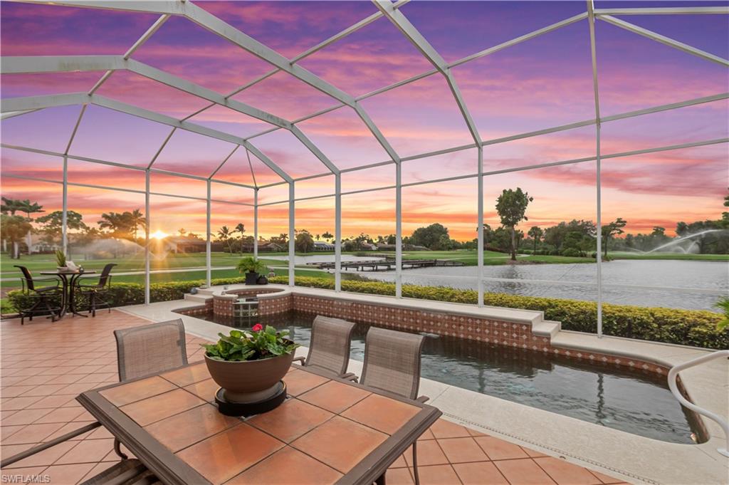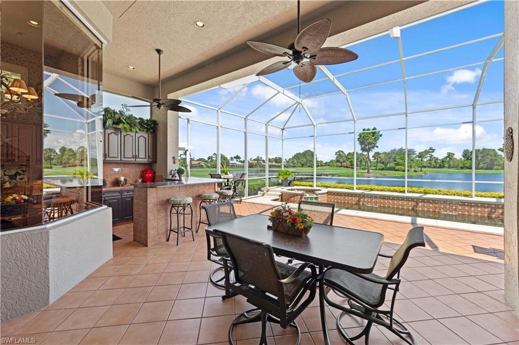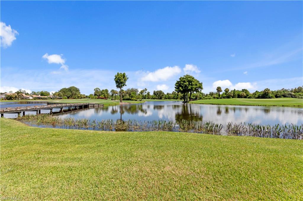 Nestled on one of the most sought-after lots in The Vines, this beautifully maintained home offers the best view in the community. Perfectly positioned on an oversized corner lot, it captures sweeping northern vistas of the golf course and serene lake—providing a stunning backdrop for everyday living. Step outside to your own private oasis, complete with a sparkling pool and spa, an expansive screened lanai, and a built-in dry bar—ideal for entertaining. A long paver driveway provides ample parking, while the screened front entry and impact-resistant windows with an electric roll-down at the entry offer style and peace of mind. Inside, the spacious layout features 2 bedrooms plus a large office, a generous family room with sliding glass doors that open seamlessly to the lanai, and 24” tile flooring throughout the main living areas and guest room. The primary suite boasts warm wood flooring, dual sinks with an additional seated vanity, and a walk-in closet. The kitchen offers upgraded cabinetry, granite countertops, tile backsplash, stainless steel appliances, and both a cozy breakfast nook and a formal dining space. Custom built-in cabinetry adds function and charm throughout. Living in The Vines at Estero Country Club means enjoying a vibrant, gated community known for its friendly atmosphere, beautifully manicured grounds, and no wait list for golf memberships. Amenities include a championship 18-hole golf course, active tennis and pickleball programs, bocce courts, a fitness center, and a lively clubhouse hosting year-round events and dining. This exceptional property combines elegant living spaces, enviable views, and a premier location just minutes from world-class shopping, dining, beaches, and RSW Airport.