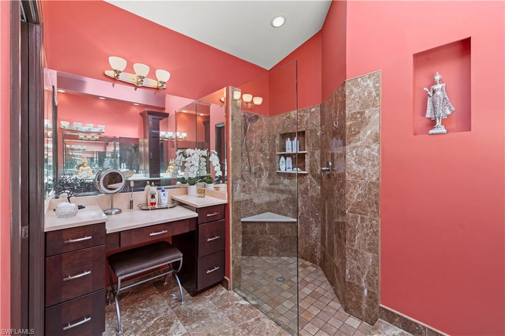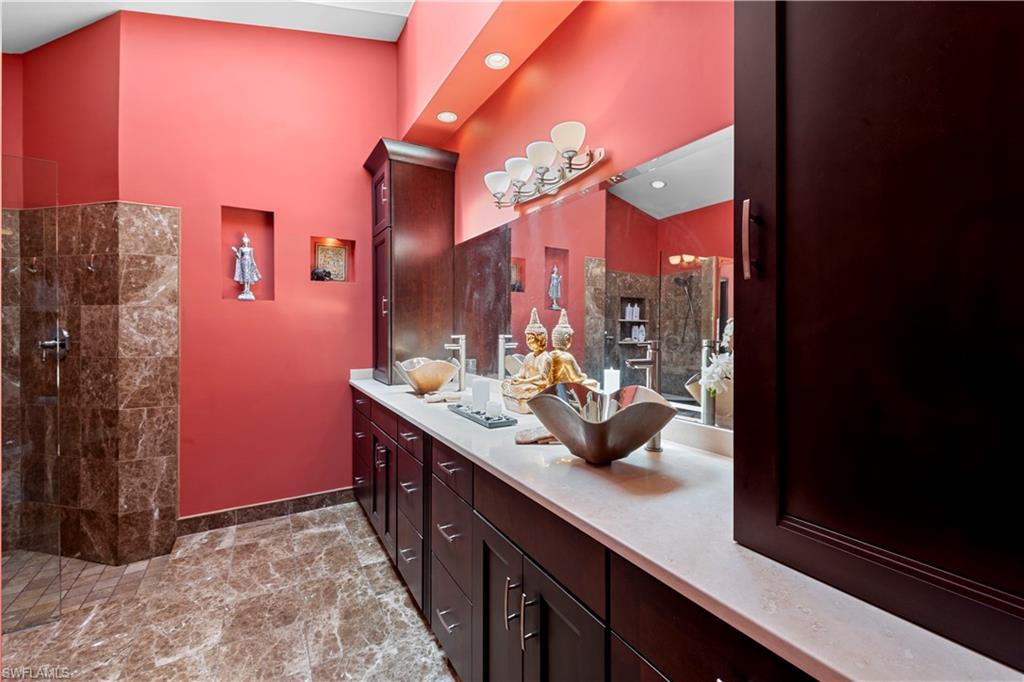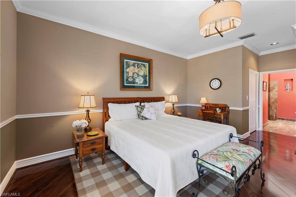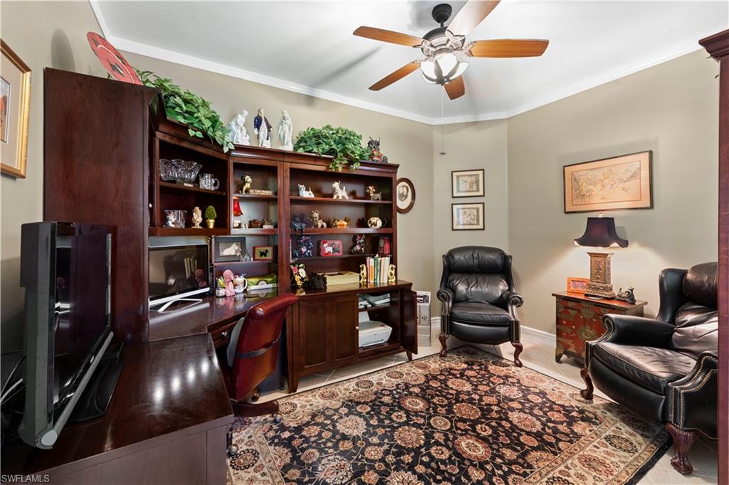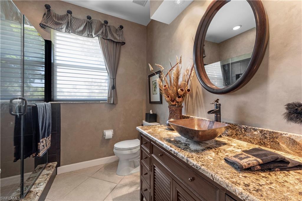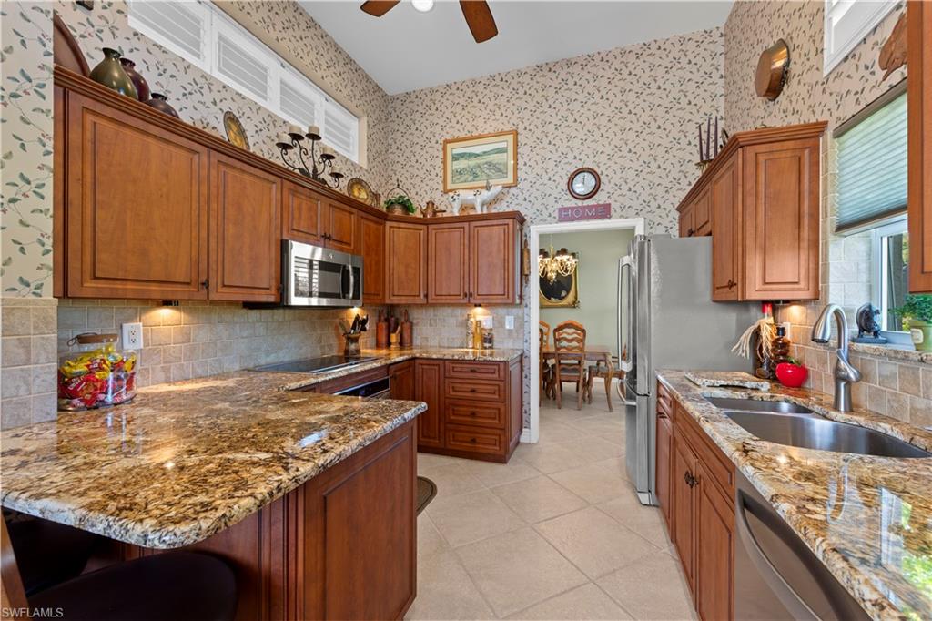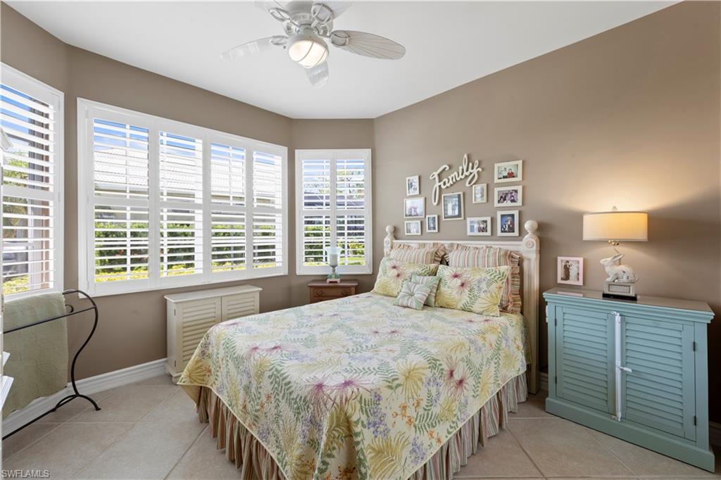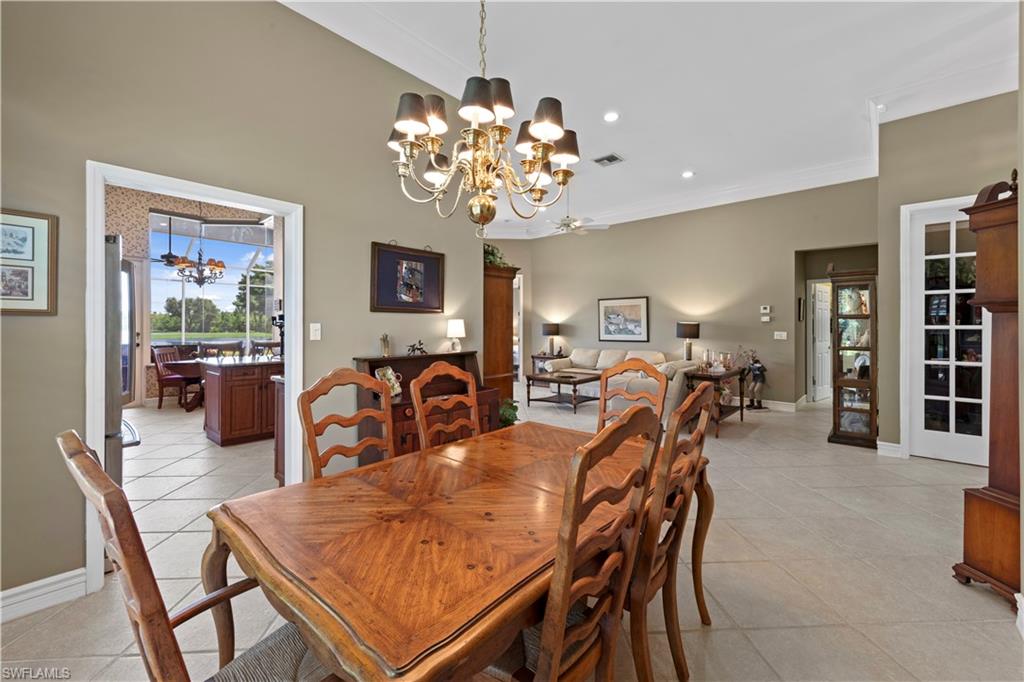 Nestled on one of the most sought-after lots in The Vines, this beautifully maintained home offers the best view in the community. Perfectly positioned on an oversized corner lot, it captures sweeping northern vistas of the golf course and serene lake—providing a stunning backdrop for everyday living. Step outside to your own private oasis, complete with a sparkling pool and spa, an expansive screened lanai, and a built-in dry bar—ideal for entertaining. A long paver driveway provides ample parking, while the screened front entry and impact-resistant windows with an electric roll-down at the entry offer style and peace of mind. Inside, the spacious layout features 2 bedrooms plus a large office, a generous family room with sliding glass doors that open seamlessly to the lanai, and 24” tile flooring throughout the main living areas and guest room. The primary suite boasts warm wood flooring, dual sinks with an additional seated vanity, and a walk-in closet. The kitchen offers upgraded cabinetry, granite countertops, tile backsplash, stainless steel appliances, and both a cozy breakfast nook and a formal dining space. Custom built-in cabinetry adds function and charm throughout. Living in The Vines at Estero Country Club means enjoying a vibrant, gated community known for its friendly atmosphere, beautifully manicured grounds, and no wait list for golf memberships. Amenities include a championship 18-hole golf course, active tennis and pickleball programs, bocce courts, a fitness center, and a lively clubhouse hosting year-round events and dining. This exceptional property combines elegant living spaces, enviable views, and a premier location just minutes from world-class shopping, dining, beaches, and RSW Airport.