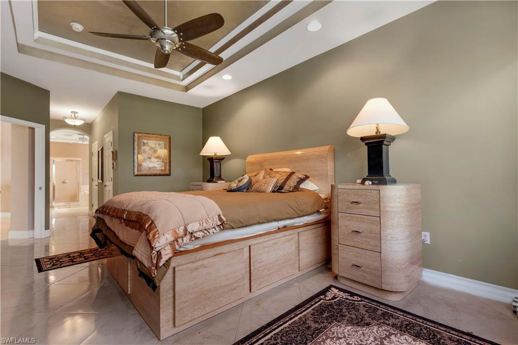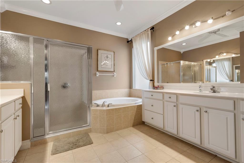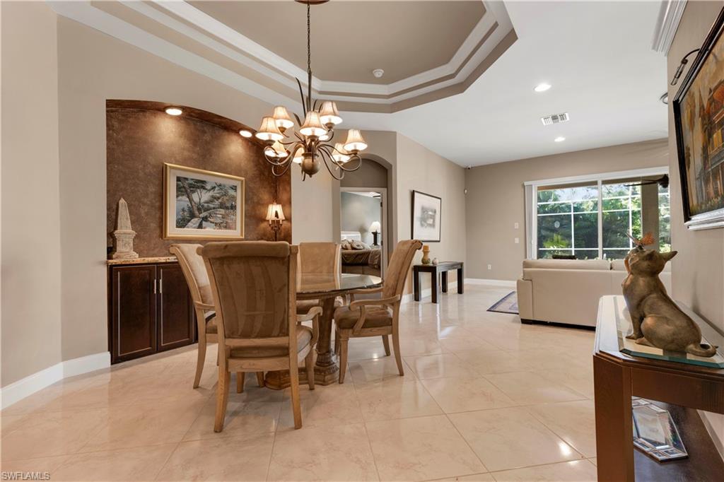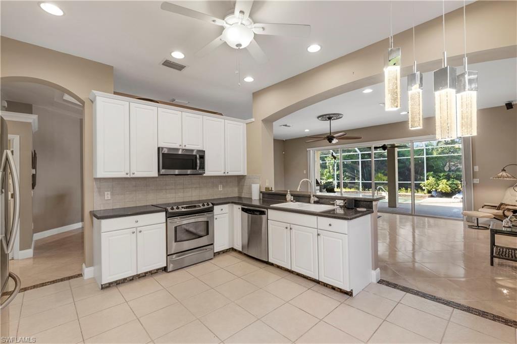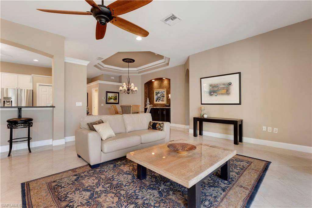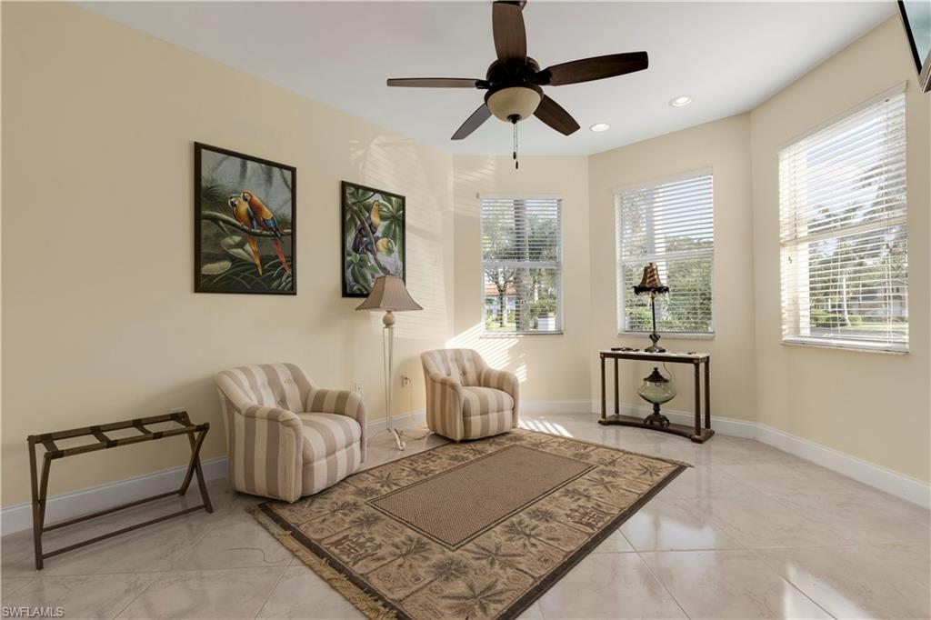 Experience resort-style living in this stunning two-bedroom + den/third bedroom, two-bath pool home with golf course views, located in the highly sought-after, guard-gated community of Spanish Wells. This residence showcases an elegant open-concept layout, filled with natural light and finished to perfection—featuring soaring ceilings, refined crown molding, stylish tile flooring throughout, and dazzling decorative iridescent accents. The gourmet eat-in kitchen offers exceptional cabinet and counter space, ideal for both cooking and entertaining. The expansive primary suite is a serene retreat with dual walk-in closets and spa-inspired comforts. Additional highlights include an oversized two-car garage with sleek epoxy floors and convenient pull-down attic storage. Perfectly situated just minutes from world-class shopping, dining, entertainment, and the pristine white sand beaches of Southwest Florida—not to mention close proximity to the airport—this home offers everything you need, right behind the gates. Enjoy access to Spanish Wells' extensive amenities and embrace the ultimate Florida lifestyle in this exceptional home.