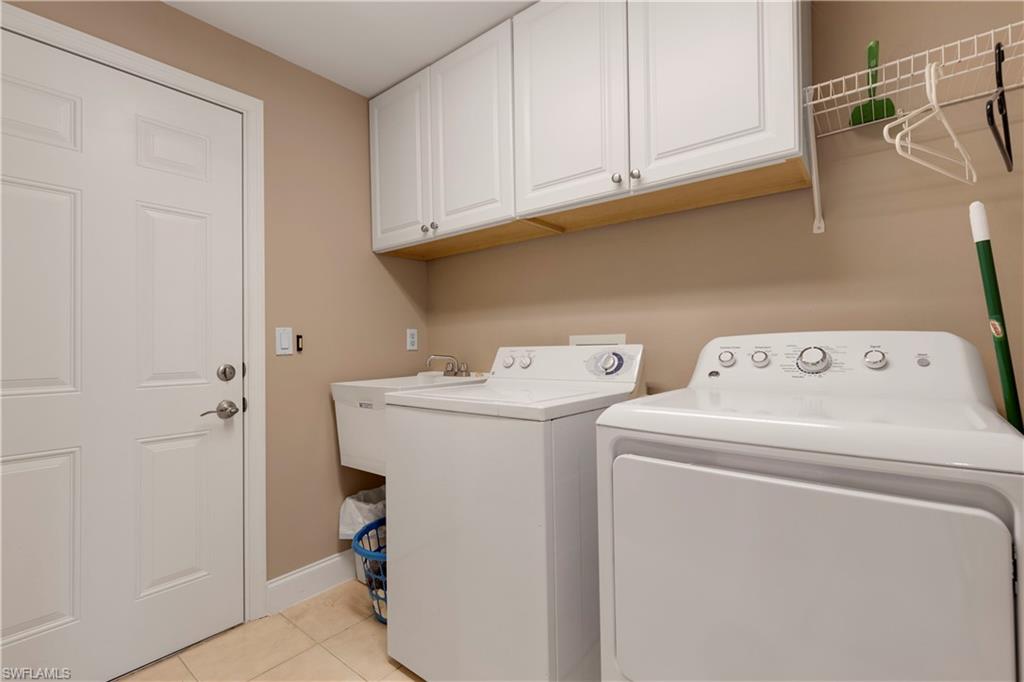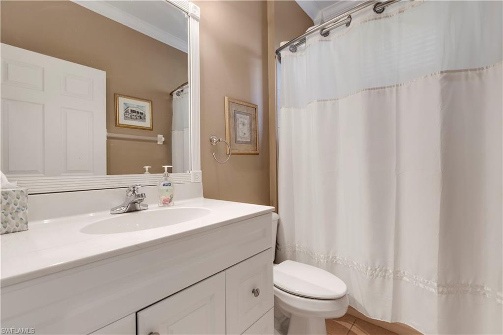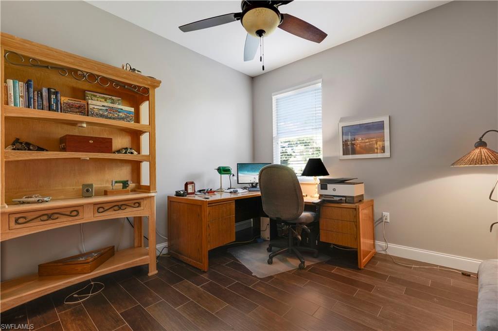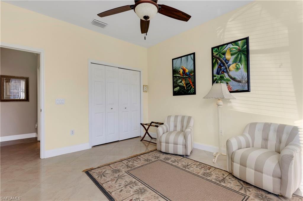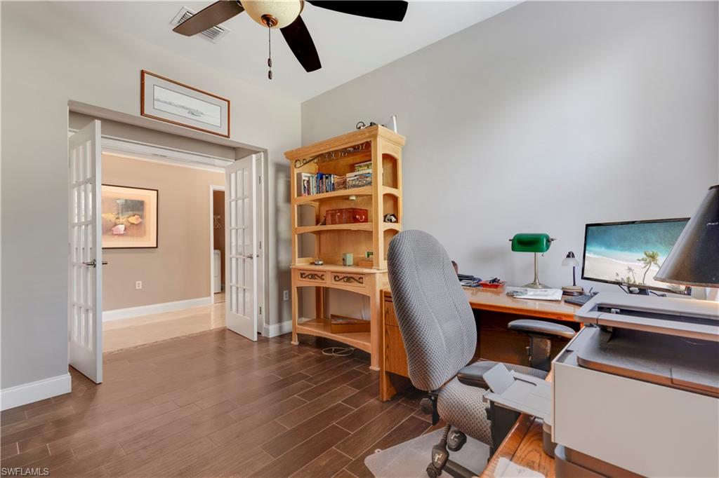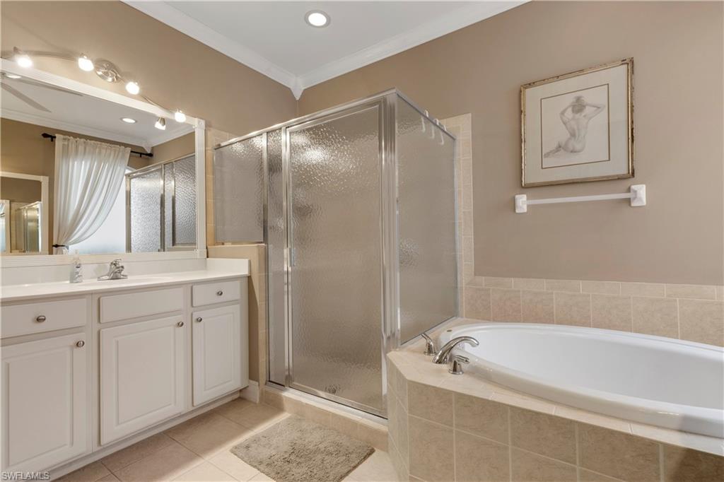 Experience resort-style living in this stunning two-bedroom + den/third bedroom, two-bath pool home with golf course views, located in the highly sought-after, guard-gated community of Spanish Wells. This residence showcases an elegant open-concept layout, filled with natural light and finished to perfection—featuring soaring ceilings, refined crown molding, stylish tile flooring throughout, and dazzling decorative iridescent accents. The gourmet eat-in kitchen offers exceptional cabinet and counter space, ideal for both cooking and entertaining. The expansive primary suite is a serene retreat with dual walk-in closets and spa-inspired comforts. Additional highlights include an oversized two-car garage with sleek epoxy floors and convenient pull-down attic storage. Perfectly situated just minutes from world-class shopping, dining, entertainment, and the pristine white sand beaches of Southwest Florida—not to mention close proximity to the airport—this home offers everything you need, right behind the gates. Enjoy access to Spanish Wells' extensive amenities and embrace the ultimate Florida lifestyle in this exceptional home.