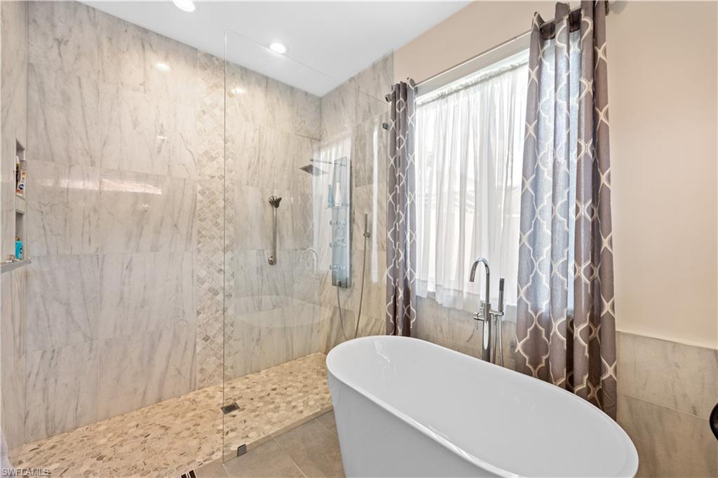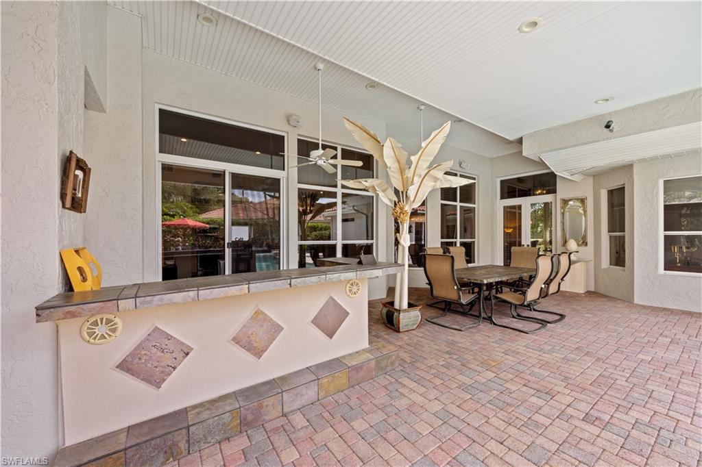 Experience the perfect blend of elegance, privacy, and Florida lifestyle at 222 Monterey Dr, a distinctive courtyard single-family home with private casita in the prestigious Vineyards Country Club. The main residence boasts a split-bedroom layout with 2 bedrooms, formal dining, and 2 bathrooms, including a remodeled primary suite bathroom featuring dual sinks, a separate shower, and a luxurious stand-alone soaking tub. The kitchen offers a bar, sleek stainless-steel appliances, soft-close cabinetry, a walk-in pantry, and an inviting eat-in space with a great view of the courtyard. Big windows throughout the home flood the space with natural light, highlighting the formal dining area and the airy ambiance created by soaring 14-ft ceilings and crown molding. The floors in the main house are a warm wood-tone plank laminate for a stylish and modern finish. The separate casita features a bedroom, bath, and kitchenette—perfect for hosting guests, accommodating in-laws, or creating a private home office. At the heart of the property, the expansive brick-paver courtyard features a sparkling pool and raised spa with southern exposure—perfect for basking in all-day sunlight. A covered area in the courtyard elevates outdoor living with a bar featuring lights at night, a mini fridge, and a cozy sitting area, ideal for relaxing or entertaining. Lush landscaping surrounds the property, including a serene, landscaped backyard behind the main house. A two-car garage with a paved circular driveway provides convenience and spacious parking. Optional membership of The Vineyards Country Club unlocks a world of luxury amenities, including 36 holes of championship golf, 12 Har-Tru tennis courts, 8 pickleball courts, a new Wellness Center & Spa, and a newly renovated clubhouse. Ideally located in north Naples with easy access to I-75, and just minutes away from pristine beaches, shopping at Waterside Shops, and the vibrant dining and cultural scene of Mercato and downtown Naples.