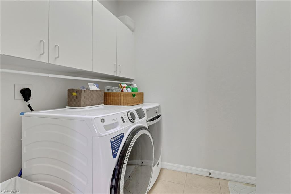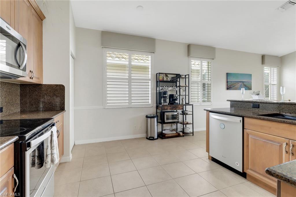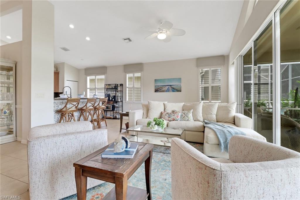 New roof December 2024, brand new AC, newer water heater and plenty of updates await you in this Montego floor plan, with 2 bedrooms plus den, 2 bathrooms and a 2 car garage. Be wowed by the high ceilings and the semi open floor plan this home has to offer. Updated kitchen with stainless steel appliances, newer cabinets and granite counters and backsplash. Lots of natural lights with triple slider doors to enjoy the screened in outdoor patio with tiled floor and well maintained landscaping. Main bedroom has laminate wood flooring and plantation shutters. The main bathroom ensuite offers a separate tub and walk-in shower and double vanity. Plantation shutters and tile throughout main living areas and Den. Upgraded washer and dryer. Cascades at Estero is a gated active 55+ community with a 26K SF clubhouse oversized indoor/outdoor pools, ballroom, card, arts & crafts rooms, billiards, fitness, sauna, 4 pickle ball, bocce, 5 HAR-Tru tennis courts, low HOA fees. Convenient location with shops, restaurants, medical and close to airport. Pet friendly