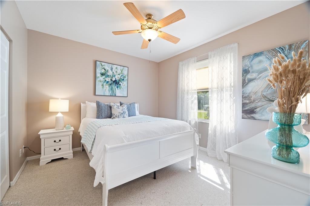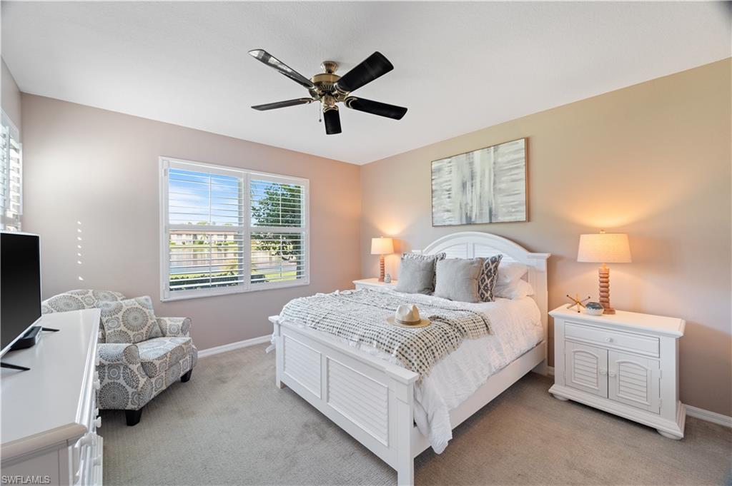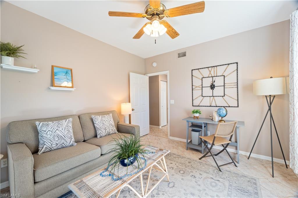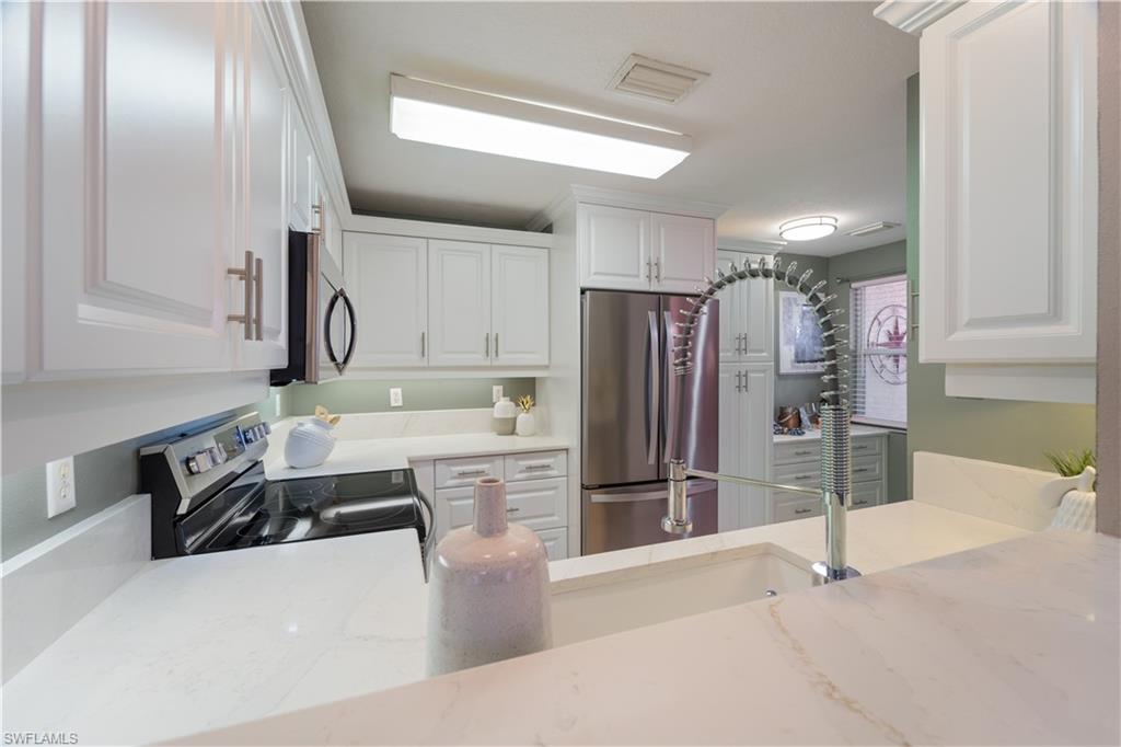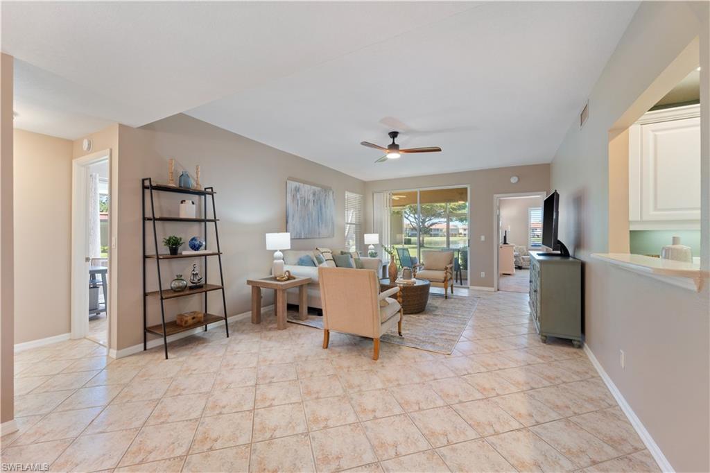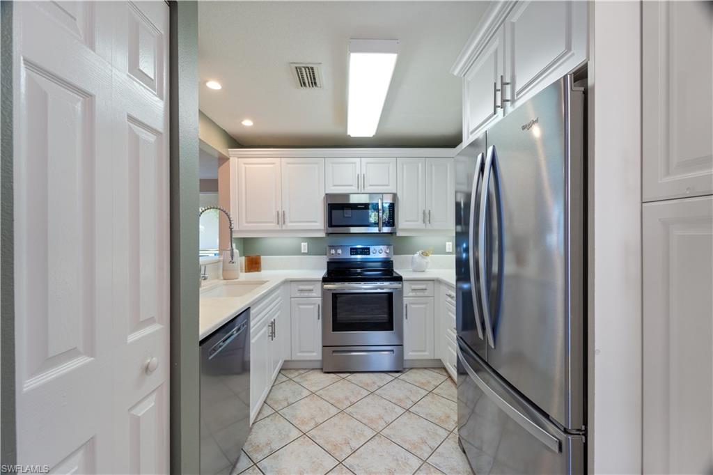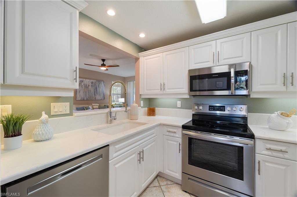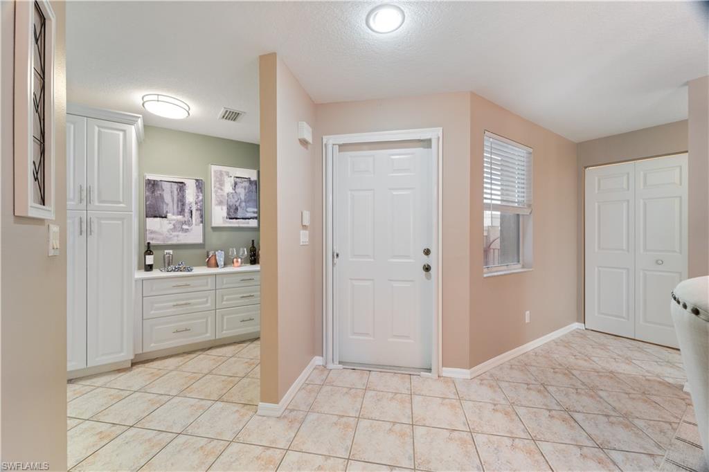 Welcome to your turnkey retreat in Huntington Lakes! This beautifully furnished first-floor condo with attached garage offers 2 bedrooms + den, 2 full baths, and a bright open floor plan. The kitchen has been updated with stainless steel appliances, solid maple white cabinetry, custom pantry storage, and a convenient dry bar with added cabinetry. The spacious living areas feature tile flooring throughout, with carpet in the bedrooms, and open seamlessly to a screened lanai where you’ll enjoy tranquil lake and fountain views. A rare oversized side yard provides additional privacy with no lanais in view. The split-bedroom design ensures comfort and privacy, with the primary suite offering a walk-in closet, second closet, and expanded bath storage. Additional highlights include a long driveway with extra parking, 2019 washer & dryer, upgraded lighting and fixtures, new living room ceiling fan, pocket screen front door, and a new roof in 2019 (no assessment) and NO FLOOD ZONE X! Huntington Lakes is a vibrant, amenity-rich community featuring 3 resort-style pools, hot tub, fitness center with brand-new equipment, tennis, bocce, and a full-time activities director. With beautifully landscaped grounds, low HOA fees, and an unbeatable North Naples location close to I-75, shopping, dining, golf, and just 10 miles from the beach, this home offers the best of Florida living