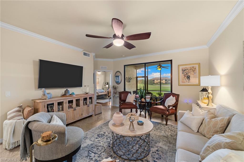 Step into this sought after ground floor, "Arabella" floor plan offering 2 bedrooms plus a den, 2 bathrooms, and a 1 car garage in the resort style community of Bonita National. As an end unit, this veranda home has additional windows and is bathed in natural light, enhancing its open and airy feel. The spacious living area flows seamlessly to a screened lanai with sweeping views of the lush golf course, perfect for enjoying morning coffee or evening sunsets. Thoughtfully upgraded, this home features no carpet for easy maintenance, crown molding, and is being sold partially furnished. Owners may golf unlimited from May - October. Bonita National offers world class amenities, including championship golf, tennis, fitness center, resort pool, multiple dining options and pickleball and bocce are being added soon! All just minutes from the beaches, shopping, dining and airport!
