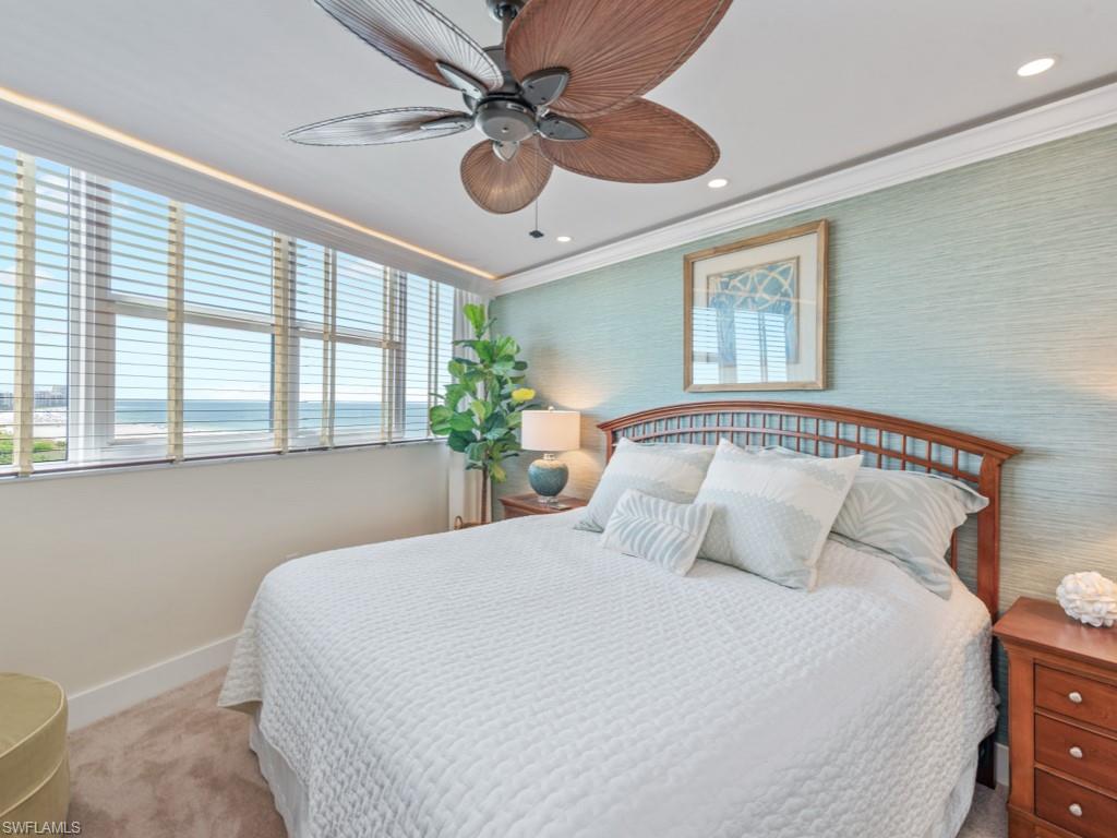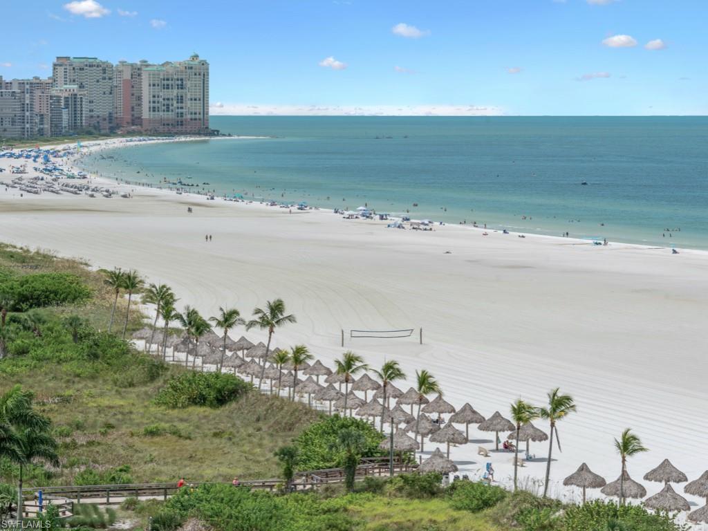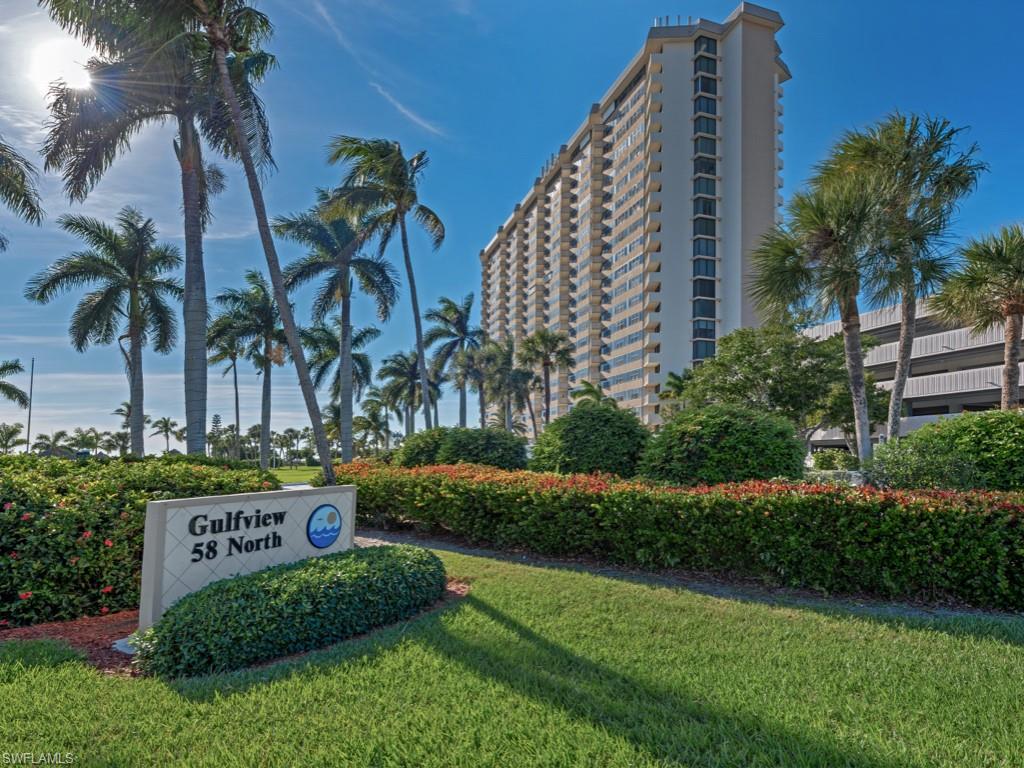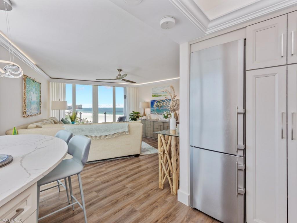 Welcome to this exquisitely updated 2 bedroom and 2 bathroom beachfront condo on Marco Island’s crescent beach. One of only a handful of corner units in the building with an additional 51 sq feet of living space than the rest of the units, the sweeping SOUTHERN views of the beach and Gulf can be seen from the living room with its new glass balcony railing. All windows and sliders are impact glass. Evening twinkling lights of the island can be viewed from the floor to ceiling windows from the kitchen. The magnificently updated kitchen with a savvy breakfast bar, Wolf appliances, wine fridge and gorgeous cabinetry make meal prep a dream! Wood look luxury vinyl flooring, crown molding, enhanced lighting, solid wood doors and beautifully updated bathrooms with walk-in showers are evidence that no detail was overlooked. Gulfview has a large heated pool, sun deck area, tiki hut, grills, beach access, community room, exercise room, extra storage, multi-level covered parking garage, bicycle storage, tennis, pickleball, secured lobby, and on-site management. The location of this property is unmatched, situated next to Resident’s Beach, with easy access to Marco Island’s finest dining, shopping, and entertainment options. This condo is a true gem! Featuring upscale design, stylish furnishings, and an unbeatable location, this is a rare opportunity to own a piece of paradise on Marco Island. Your dream coastal lifestyle awaits.