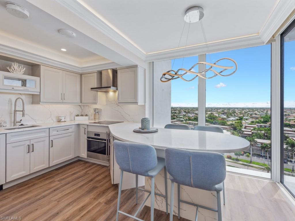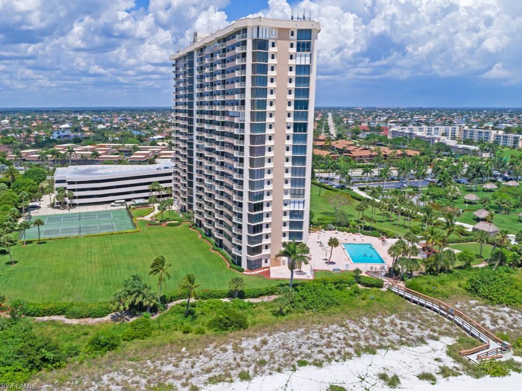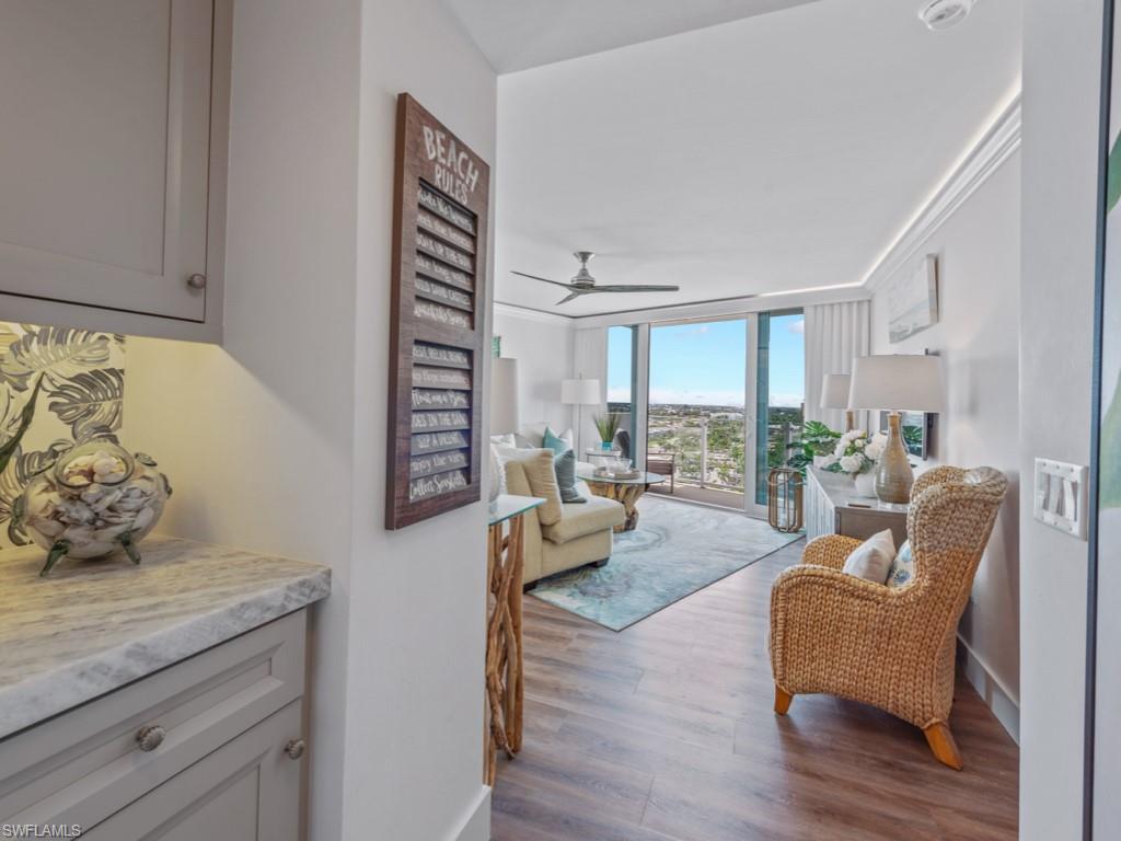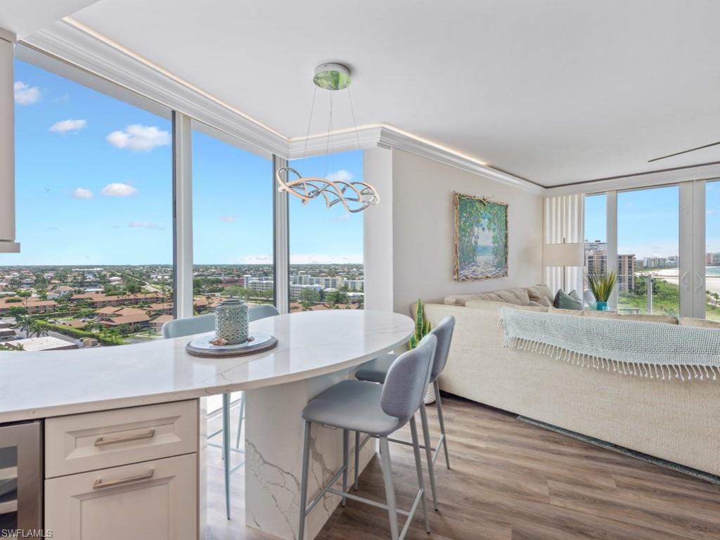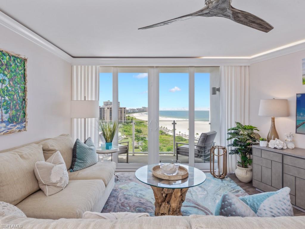 Welcome to this exquisitely updated 2 bedroom and 2 bathroom beachfront condo on Marco Island’s crescent beach. One of only a handful of corner units in the building with an additional 51 sq feet of living space than the rest of the units, the sweeping SOUTHERN views of the beach and Gulf can be seen from the living room with its new glass balcony railing. All windows and sliders are impact glass. Evening twinkling lights of the island can be viewed from the floor to ceiling windows from the kitchen. The magnificently updated kitchen with a savvy breakfast bar, Wolf appliances, wine fridge and gorgeous cabinetry make meal prep a dream! Wood look luxury vinyl flooring, crown molding, enhanced lighting, solid wood doors and beautifully updated bathrooms with walk-in showers are evidence that no detail was overlooked. Gulfview has a large heated pool, sun deck area, tiki hut, grills, beach access, community room, exercise room, extra storage, multi-level covered parking garage, bicycle storage, tennis, pickleball, secured lobby, and on-site management. The location of this property is unmatched, situated next to Resident’s Beach, with easy access to Marco Island’s finest dining, shopping, and entertainment options. This condo is a true gem! Featuring upscale design, stylish furnishings, and an unbeatable location, this is a rare opportunity to own a piece of paradise on Marco Island. Your dream coastal lifestyle awaits.