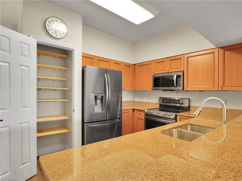 First floor condominium with 2 bedrooms, 2 full bathrooms and a garage. Outstanding features include luxury vinyl tile flooring, countertops in kitchen and bathrooms, updated and upgraded stainless steel appliances in kitchen. The bathrooms have updated light fixtures and accessories. There is a full size stacking washer and dryer in laundry along with an almost new hvac system. The community of Villagio offers resort-style living with tennis, pickleball, bocce, two community pools and a spa. This home is near the Community Town Center which features a fitness center , a library, a cafe that is open 7 days/week, and a 48-seat community cinema. These prime amenities along with cable, high speed internet, water and more. Villagio is conveniently located near I-75, the Southwest Florida International Airport, restaurants & shopping at the Miromar Outlets and Gulf Coast Town Center, Coconut Point and much more! Villagio's amenities rival those of much more expensive developments. Priced right!