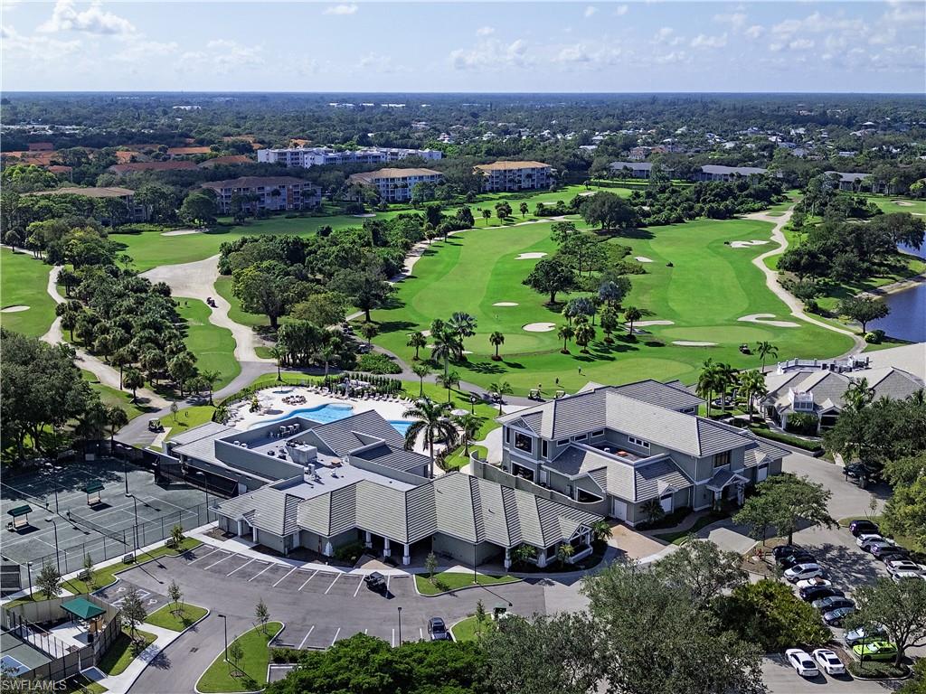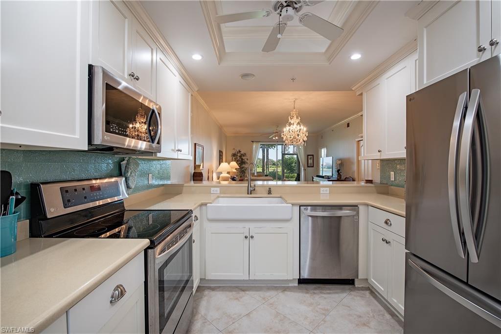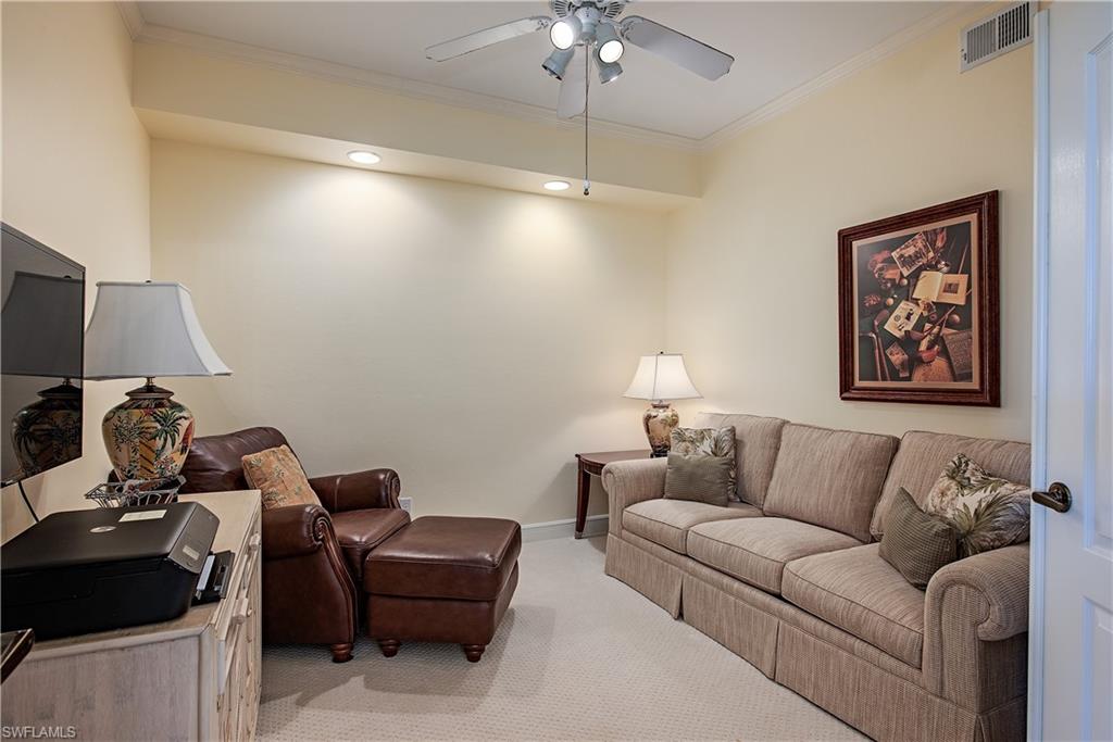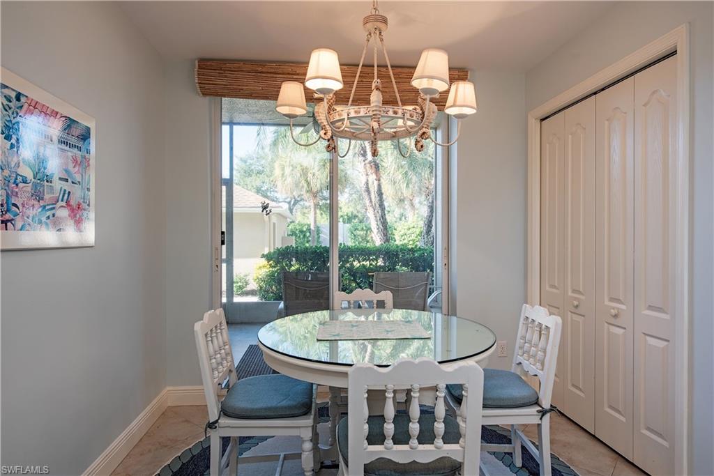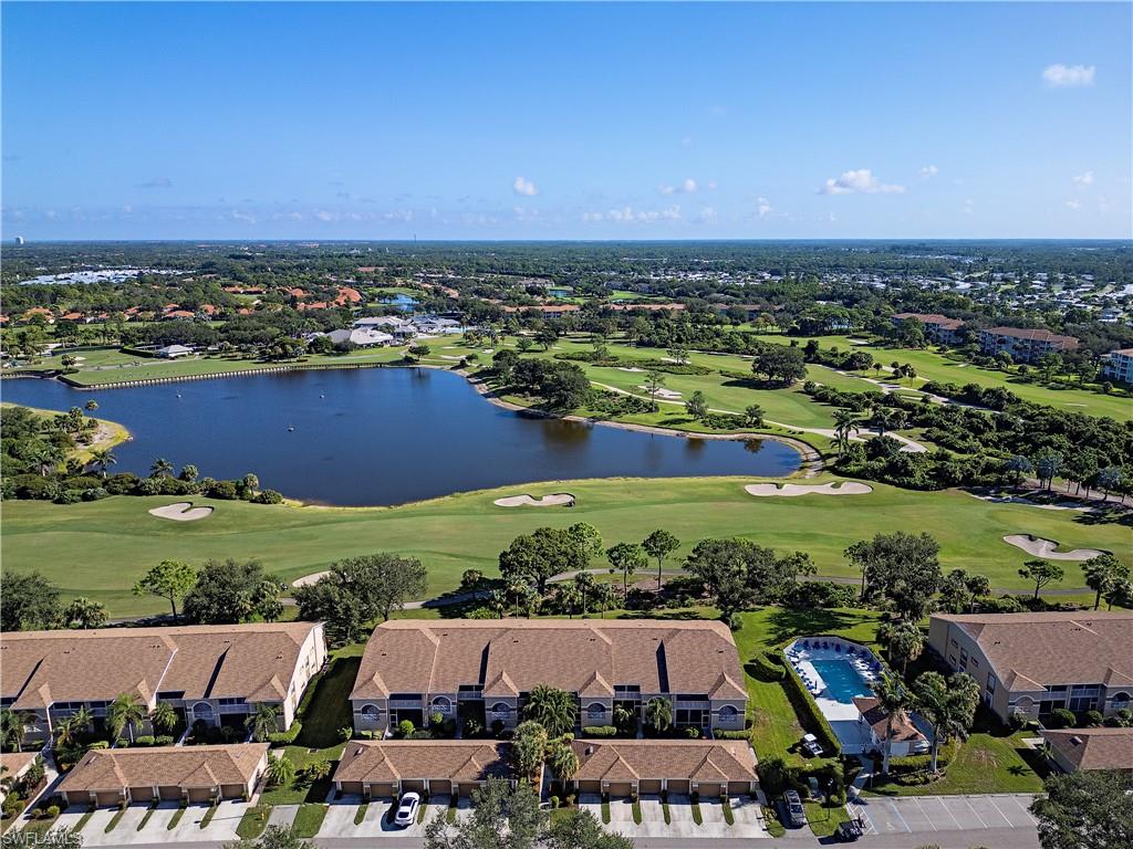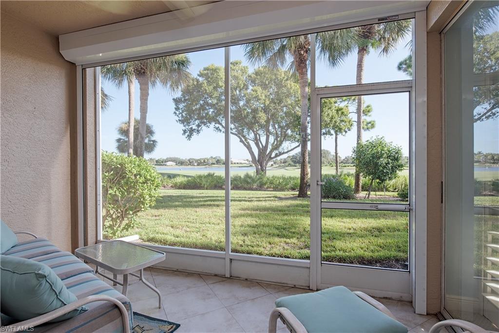 Your paradise awaits when you arrive at this meticulously maintained 2 bedrooms plus den with detached garage in the St Andrews Verandas! Not only is there the most relaxing and incredible view from your private lanai this unit boasts tile and carpet floorings and new kitchen with tray ceilings and farmhouse large sink and subway tile. Soft alluring color palate throughout. The breakfast area touts a remote Hunter Doulas Shade for your easy shading desires. The high-end Lexington and Tommy Bahama furniture stays. Owners have added an electric hurricane shutter to protect the lanai and hurricane rated windows in the primary suite. AC and water heater new 2022-2023. To add to your relaxing experience Highland Woods boasts a resort style pool with cabana, a state-of-the-art fitness center, tennis courts, bocce courts and pickle ball! the Clubhouse has been beautifully redone and has Grille Room and Dining to treat yourself, family and friends! All of this and close to Coconut Point, and Promenade and a short drive to the gulf!