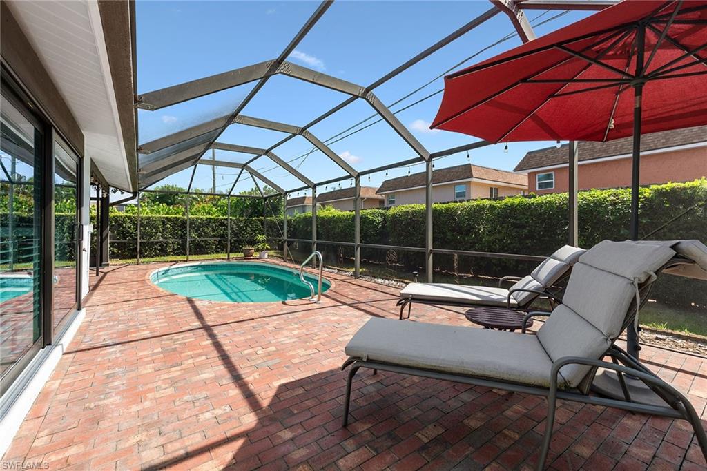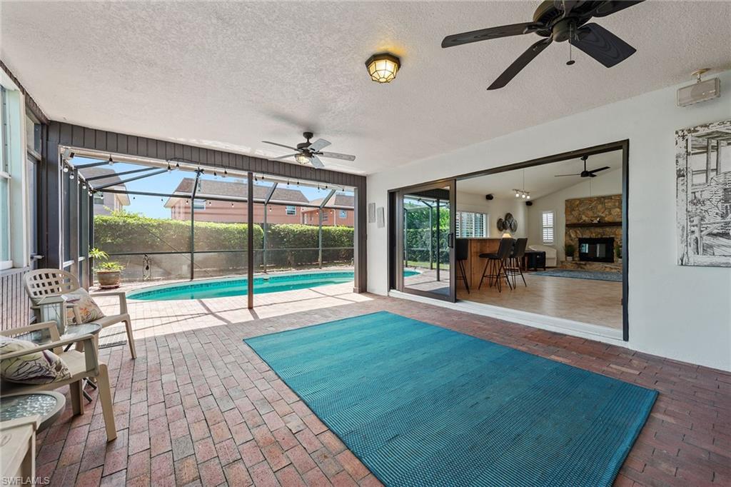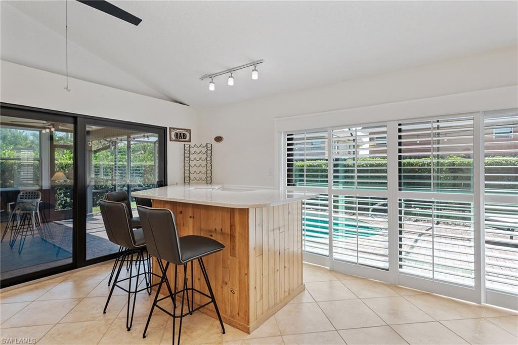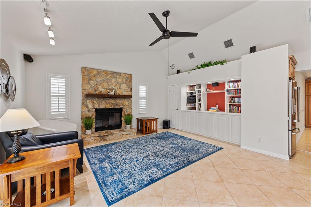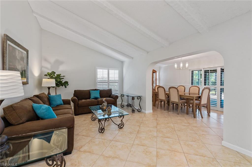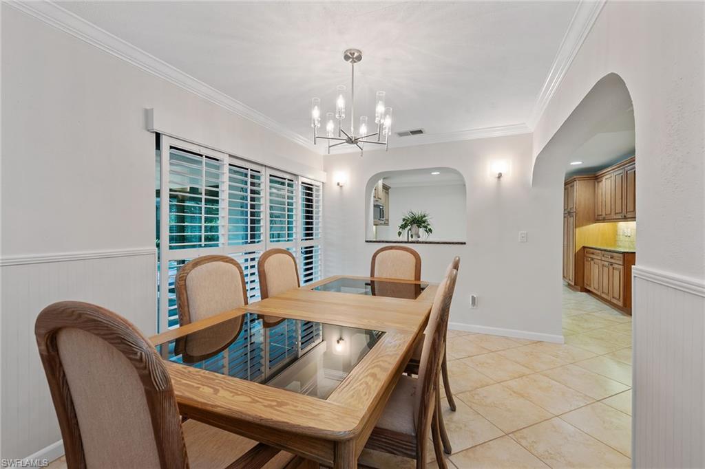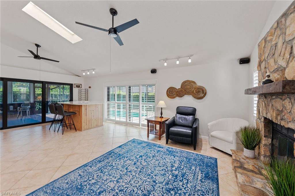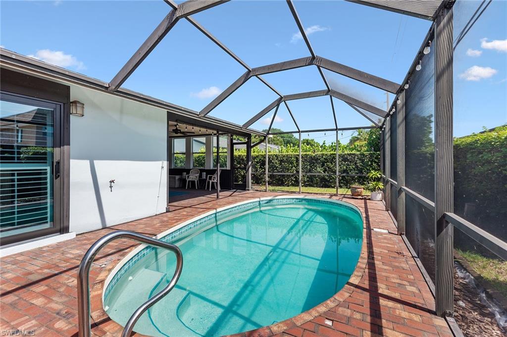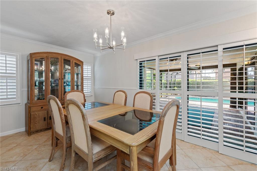 In a sought-after location just minutes from Naples’ pristine beaches, Waterside Shops, Venetian Village, and a short drive to Mercato, Fifth Avenue and Third Street, this single-family pool home offers a blend of convenience, comfort and investment potential—with no HOA fees. Ideal for investors, snowbirds and year-round residents, this property combines timeless charm with modern updates, creating a private oasis close to everything. Featuring three bedrooms, three baths, and a two-car garage with a newer garage door (2021), the home is designed for relaxed Florida living. Eastern exposure fills the living spaces with natural light, enhanced by impact doors and windows, high-volume ceilings, crown molding and white plantation shutters. Diagonal tile flooring runs through the main living areas, while the spacious kitchen impresses with quality cabinetry, a cabinet-style pantry with pullout drawers, granite countertops, tumbled marble backsplash, under-cabinet lighting and stainless steel appliances, including a KitchenAid dishwasher, microwave and smooth-top range (2020) plus a Maytag French door refrigerator. A skylight, recessed lighting, and ceiling fan complete the space. The formal dining room offers crown molding, wall trim, and a pass-through window to the kitchen, while the living room flows seamlessly to the screened lanai through new hurricane-resistant sliding glass doors installed in 2023. The inviting family room boasts a built-in entertainment area, wood-burning fireplace, built-in bar with quartz countertop, skylight, plantation shutters over sliders to the pool, and two ceiling fans. The owner’s suite features vinyl plank flooring, a mirrored wall, walk-in closet, and a renovated en-suite bath with a skylight, white vanity, and frameless glass walk-in shower. Two guest bedrooms with laminate flooring and crown molding share an updated bath with a shower/tub combo. Go outside to your private garden and enjoy a screened lanai with covered outdoor living, ceiling fan, and a paver pool deck surrounding the sparkling pool, ideal for entertaining or relaxing. With a new roof (2023), hurricane-resistant sliders (2023) and HVAC from 2018, this home is move-in ready in one of Naples best locations.