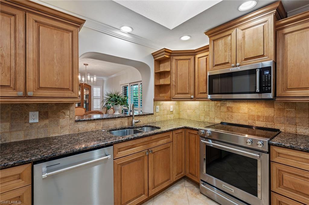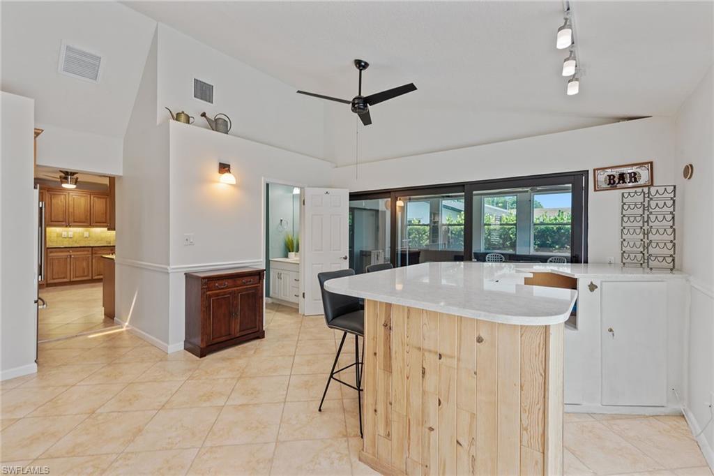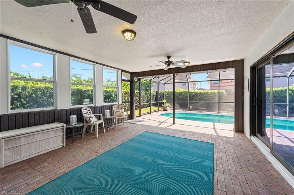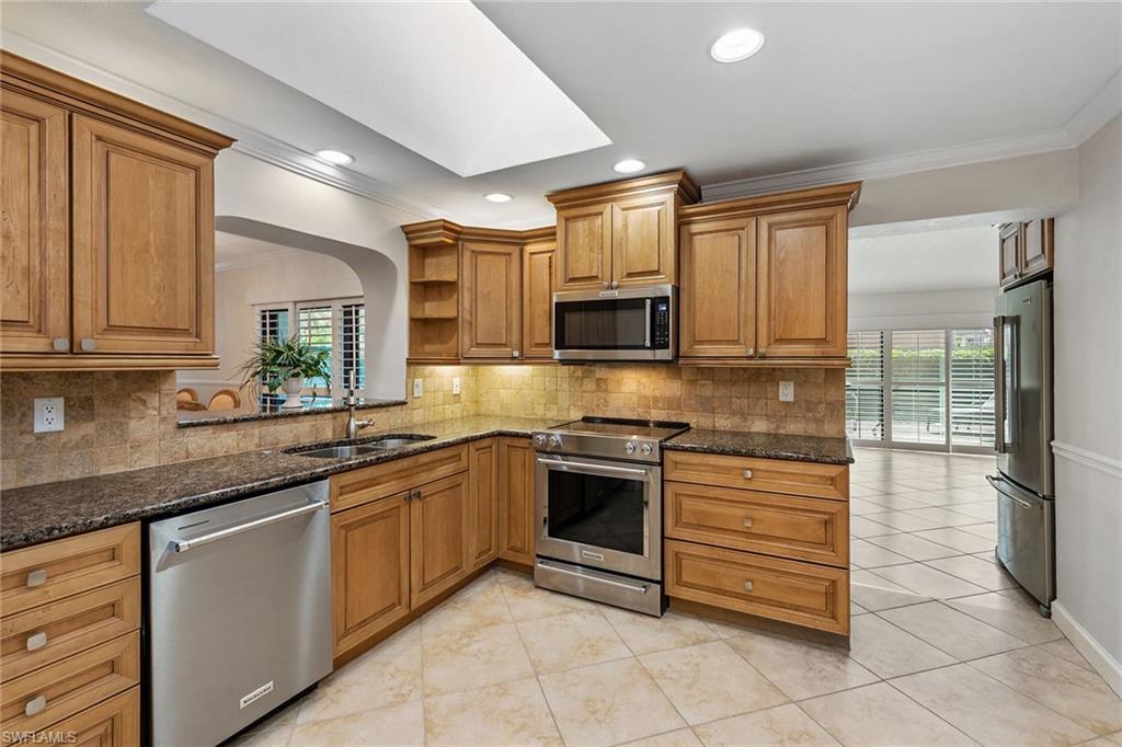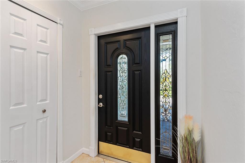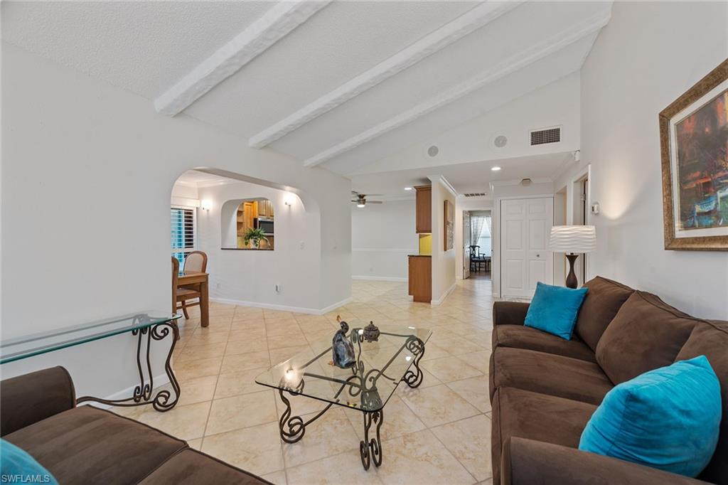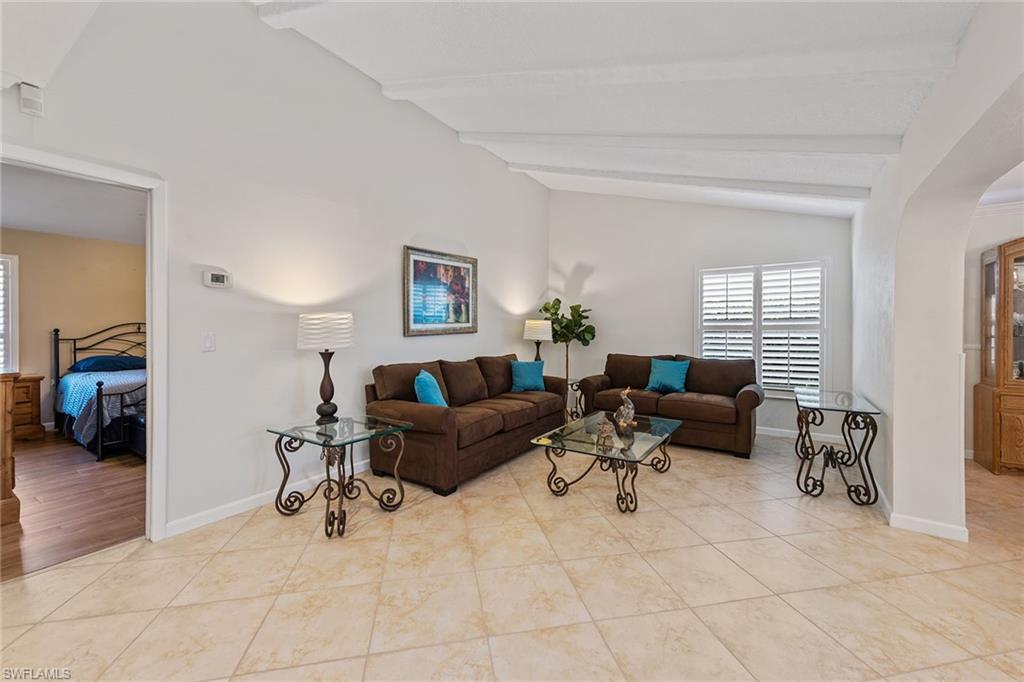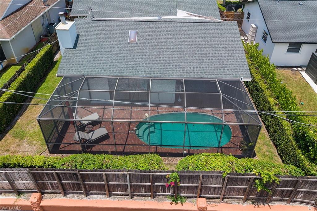 In a sought-after location just minutes from Naples’ pristine beaches, Waterside Shops, Venetian Village, and a short drive to Mercato, Fifth Avenue and Third Street, this single-family pool home offers a blend of convenience, comfort and investment potential—with no HOA fees. Ideal for investors, snowbirds and year-round residents, this property combines timeless charm with modern updates, creating a private oasis close to everything. Featuring three bedrooms, three baths, and a two-car garage with a newer garage door (2021), the home is designed for relaxed Florida living. Eastern exposure fills the living spaces with natural light, enhanced by impact doors and windows, high-volume ceilings, crown molding and white plantation shutters. Diagonal tile flooring runs through the main living areas, while the spacious kitchen impresses with quality cabinetry, a cabinet-style pantry with pullout drawers, granite countertops, tumbled marble backsplash, under-cabinet lighting and stainless steel appliances, including a KitchenAid dishwasher, microwave and smooth-top range (2020) plus a Maytag French door refrigerator. A skylight, recessed lighting, and ceiling fan complete the space. The formal dining room offers crown molding, wall trim, and a pass-through window to the kitchen, while the living room flows seamlessly to the screened lanai through new hurricane-resistant sliding glass doors installed in 2023. The inviting family room boasts a built-in entertainment area, wood-burning fireplace, built-in bar with quartz countertop, skylight, plantation shutters over sliders to the pool, and two ceiling fans. The owner’s suite features vinyl plank flooring, a mirrored wall, walk-in closet, and a renovated en-suite bath with a skylight, white vanity, and frameless glass walk-in shower. Two guest bedrooms with laminate flooring and crown molding share an updated bath with a shower/tub combo. Go outside to your private garden and enjoy a screened lanai with covered outdoor living, ceiling fan, and a paver pool deck surrounding the sparkling pool, ideal for entertaining or relaxing. With a new roof (2023), hurricane-resistant sliders (2023) and HVAC from 2018, this home is move-in ready in one of Naples best locations.