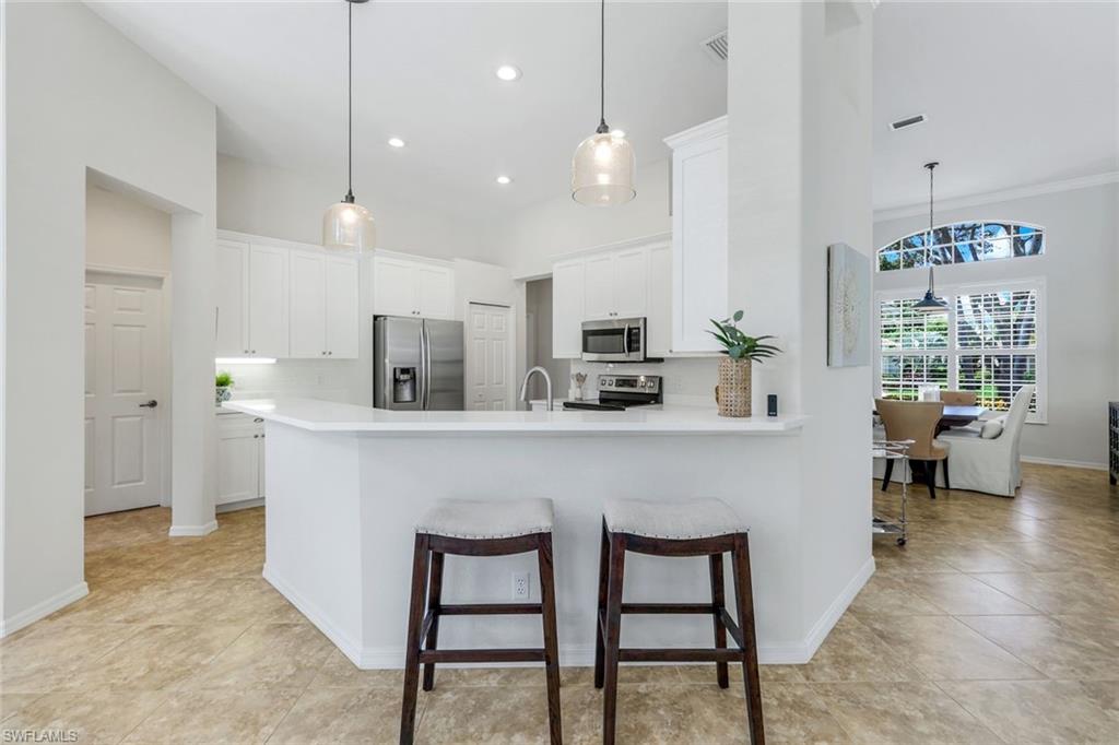 Discover the perfect blend of luxury, leisure, and location in this beautifully updated 3-bedroom home on a quiet cul-de-sac in the prestigious Stonebridge Country Club. Here, every homeowner enjoys a golf membership—no waiting lists, just year-round access to championship play, tennis, fitness, and a lively social scene. Step inside to a light-filled open floor plan with tile in the main living areas, plush carpet in the bedrooms, and elegant plantation shutters throughout. The remodeled kitchen is a chef’s delight with fresh countertops, a stylish sink, and statement pendant lighting. Your primary suite offers a spa-inspired retreat with a soaking tub, walk-in shower, and modern fixtures. Unwind in your private screened spa overlooking a lush backyard framed by mature hedges for ultimate privacy—plus, there’s room to add a pool if you wish. Recent improvements include a new driveway (2024), roof (2022), and AC (2025), giving you peace of mind and more time to enjoy the lifestyle. From your front door, it’s a short walk or ride to the fairways and the newly renovated, multi-million-dollar clubhouse, where friends gather for fine dining, cocktails, and events. As a gated, bundled golf community, Stonebridge covers cable, internet, lawn care, and more—making it as worry-free as it is vibrant. Located just minutes from Naples’ sugar-sand beaches, upscale shopping, and world-class dining, this home offers the ultimate Florida country club lifestyle. Furnishings are negotiable—just bring your clubs and your flip-flops.