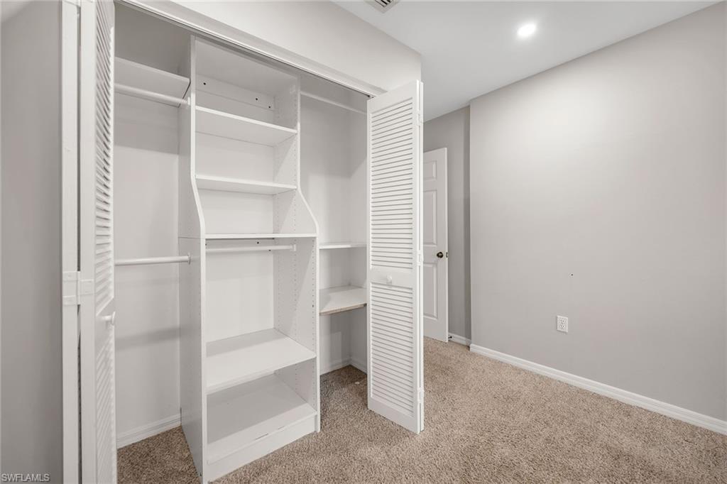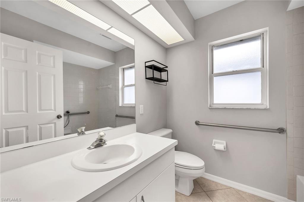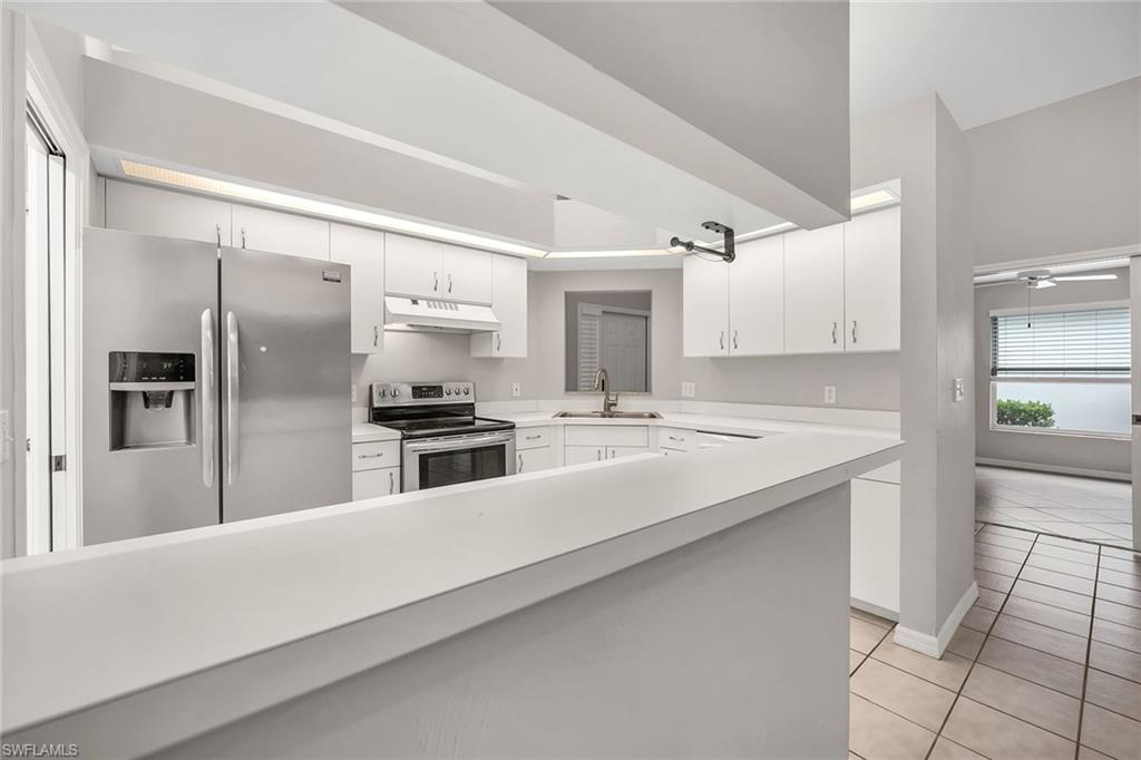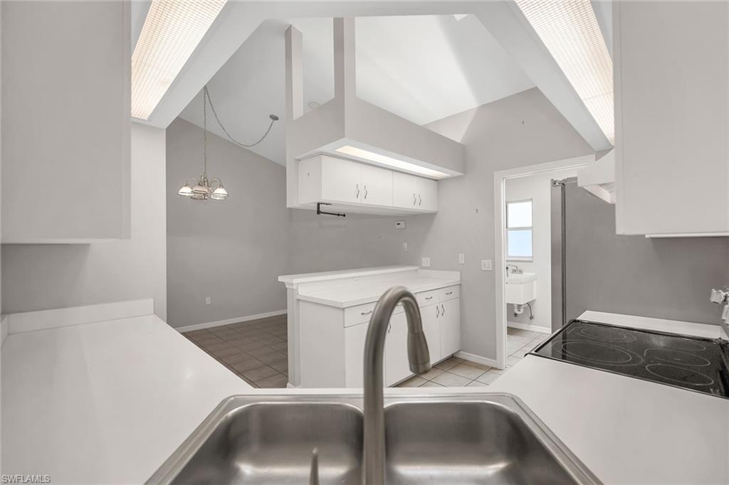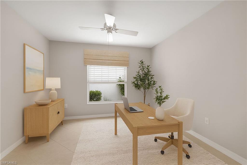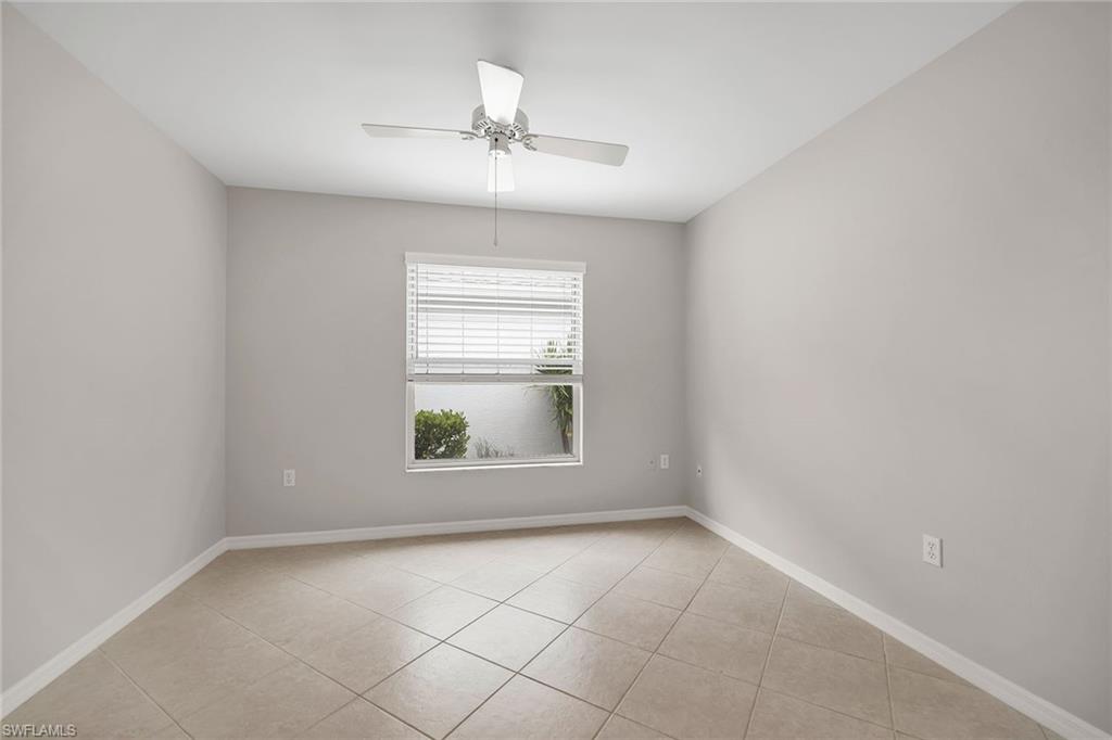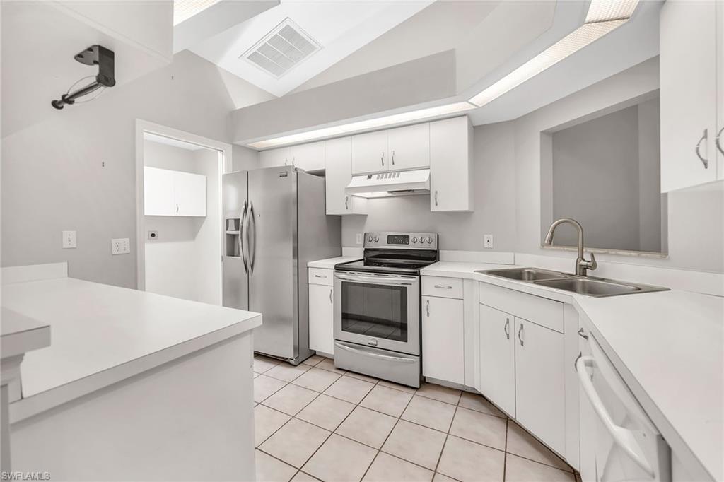 Tucked within the quiet, tropical surroundings of Fairway Dunes, this beautifully maintained single-family home offers two bedrooms plus a den, two baths and a two-car garage—blending privacy, comfort and a convenient Bonita Springs location. Enjoy serene garden views from the screened lanai, complete with tile flooring, recessed lighting and covered outdoor living. Storm protection includes electric and manual shutters, and lush tropical landscaping enhances the private setting. Inside, the open layout features tile flooring throughout the main living areas, crown molding and recessed lighting. A glass slider in the living room opens to the lanai, filling the home with natural light. The kitchen offers white cabinetry, a skylight, a pass-through window over the sink, and a bar-height counter for casual seating. Frigidaire stainless steel appliances include a range and refrigerator with icemaker, while an adjacent dining area completes the space. The spacious owner’s suite overlooks the garden and includes private lanai access, a walk-in closet with built-ins, and an en-suite bath with dual white vanities, a full-width mirror, and a glass-enclosed walk-in shower. The guest bedroom enjoys peaceful lake views and is conveniently next to a full bath with a tub/shower combo. A versatile den with pocket doors and ceiling fan offers space for a home office or study. Additional features include a laundry room with washer/dryer hookups, a utility sink, overhead cabinetry, epoxy garage flooring, and updated high-top lighting. The electrical panel (Square D) was replaced two years ago, and the air conditioner, water heater, and roof were all updated around 2019–2020. The home is in an X flood zone and there are no current assessments. Fairway Dunes is a peaceful, centrally located community featuring a pool with baths, clubhouse, tennis and pickleball courts, a barbecue area, and scenic paths that wind around the lake. Ideally just minutes from Coconut Point, the Promenade, downtown Bonita Springs, RSW Airport, Interstate 75, FGCU, golf courses, parks, boat ramps, and white sand beaches of Southwest Florida, this home offers a balance of relaxed living and everyday convenience.