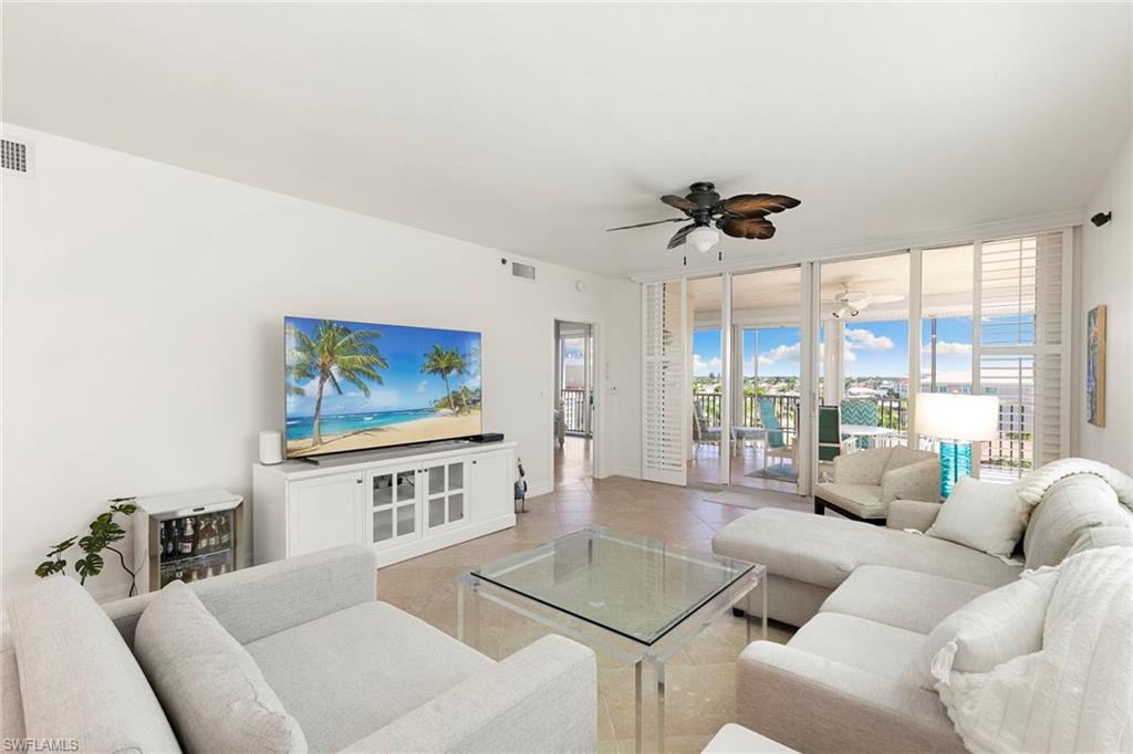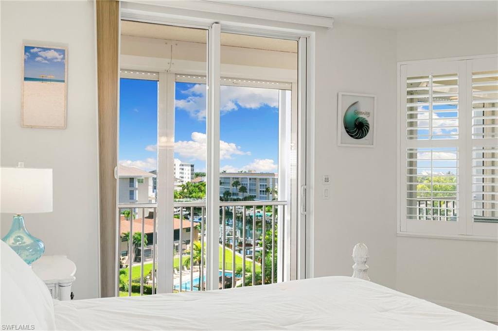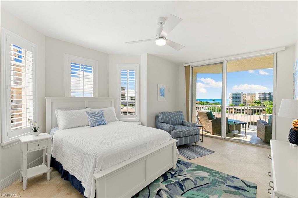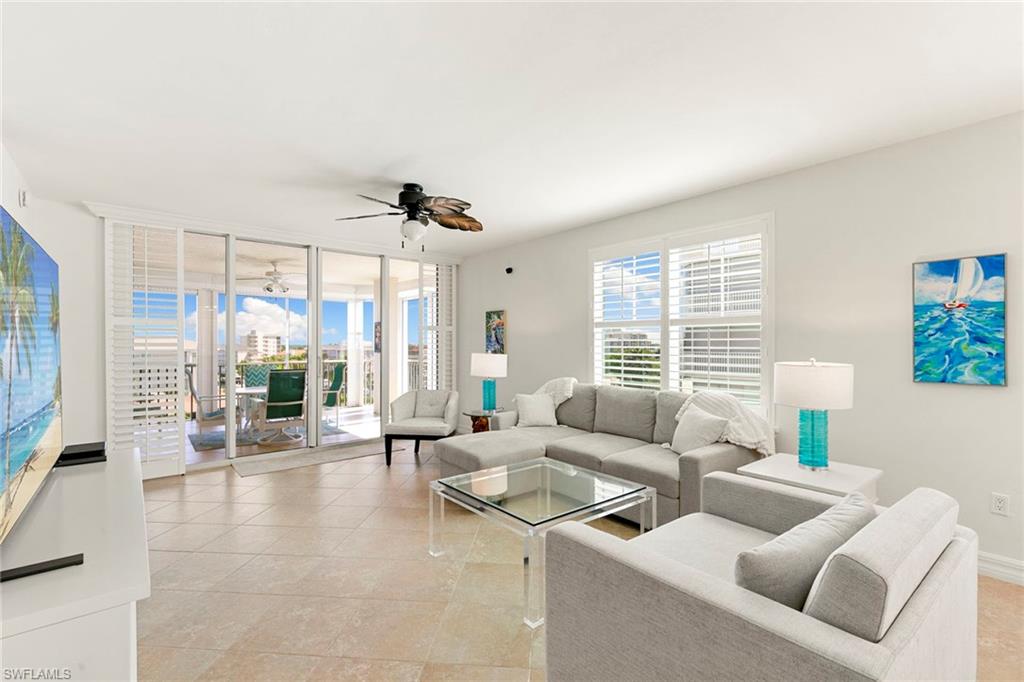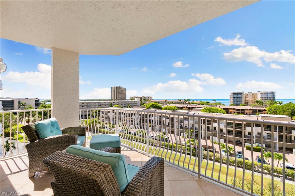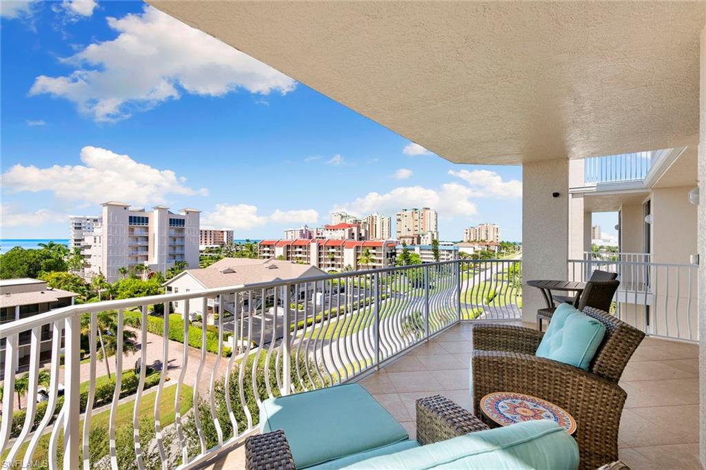 Steps from the sand, with sweeping water views—welcome to your Marco Island retreat. Built in 2001, this spacious and impeccably maintained sixth-floor residence offers the rare combination of newer-construction peace of mind and a prime South End location just a short walk to the beach. A private foyer entry creates a warm, home-like welcome before opening into an airy, open-concept living area where natural light and views take center stage. The screened lanai, shared by the primary suite and family room, overlooks the pool with long waterway views by day and the twinkling Marco Island skyline by night. A second balcony, accessed from both guest bedrooms, captures beautiful Gulf views. The updated, light-filled kitchen features Café appliances, and flows seamlessly into the dining and living areas. Custom plantation shutters enhance the abundant natural sunlight. Additional features include a private one-car garage, electric shutters on the main lanai, and an in-unit washer and dryer. Residents enjoy a heated pool, clubhouse with fitness center and the option to lease a boat slip via lottery. Offered furnished, this condominium blends location, views and comfort in one exceptional Marco Island address.