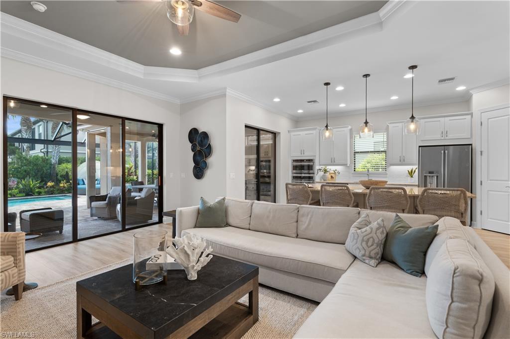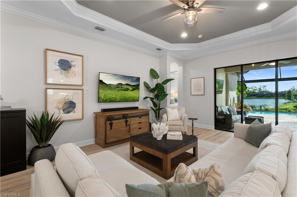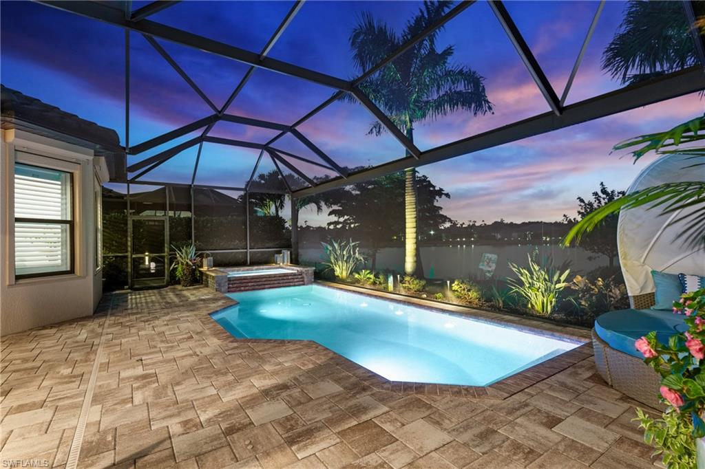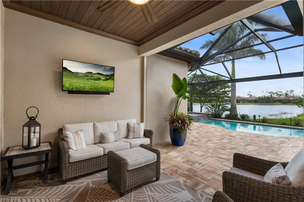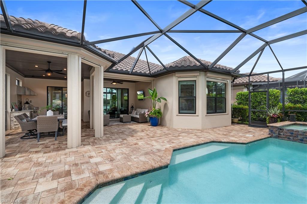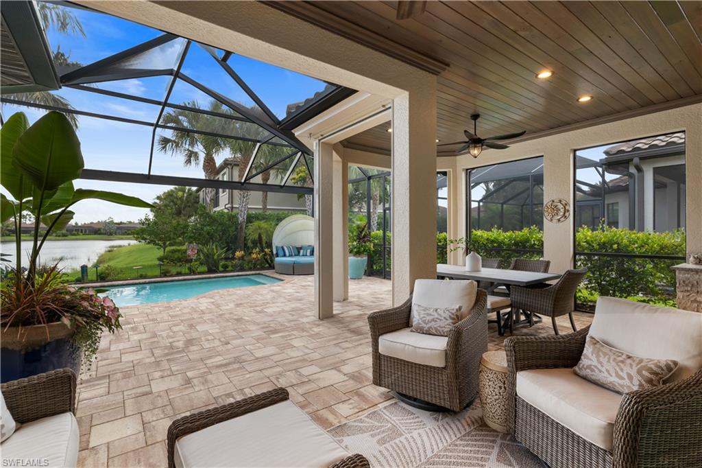 LIVE A VACATION LIFESTYLE IN ESPLANADE! FULL GOLF MEMBERSHIP INCLUDED! This immaculate and well appointed “Lazio” features expansive views overlooking the lake and over $175k IN RECENT UPGRADES! Inside, you will find 3 bedrooms, den, 3 full baths, and just over 2300 sq ft of open concept living space. From the moment you walk in the door, you are greeted with wood floors throughout the common areas & den and two sets of sliding glass doors to the extended lanai complete with custom outdoor kitchen, GAS heated pool with raised spa, picture window screen, motorized roll down hurricane shutters, stained cypress wood ceiling, and lush landscaping. The kitchen is the heart of the home and features shaker style cabinetry, Cambria quartz countertops, pantry with custom shelving, and GE Cafe appliances including a GAS cooktop & wall oven. This home is totally storm ready with a WHOLE HOUSE GENERATOR and complete hurricane protection. Other fine appointments include: BRAND NEW HVAC; BRAND NEW GAS POOL HEATER; plantation shutters on all windows; expanded primary & front guest bedrooms with bay windows; primary suite walk in closet with custom shelving/drawers; hurricane impact front door with matching sidelights; air conditioned extended garage with motorized ceiling storage racks & epoxy floor; freshly painted interior and exterior; spacious Laundry Room with cabinetry; rescreened pool cage (roof/2024); extensive crown molding; updated bathroom light fixtures; tankless GAS hot water heater; 8' doors/10' ceilings; extensive professionally enhanced landscaping with professional landscaping lighting; updated & upgraded bedroom carpet/padding; and more! Esplanade Golf & Country Club of North Naples offers a true “Lifestyle Community” with world-class amenities, including a resort pool with cabanas and the popular “Bahama Bar,” tennis, pickleball, bocce, a 14-mile network of bike/walking trails, and an 18-hole private golf course. The impressive 15,000 Sq Ft clubhouse features a restaurant, bar, wine-tasting room, wine lockers, and a Starbucks-style café. Best of all, the property’s landscaping, irrigation, golf membership, and all community amenities are covered under a quarterly fee of just $3,412—no additional fees or memberships required! Don't miss your opportunity to own this exceptional home in one of Naples’ most sought-after communities. Schedule your tour of this stunning home and Esplanade Golf & Country Club today! COMING SOON TO ESPLANADE (2026): Fully renovated and expanded poolside Bahama Bar; expanded outdoor bar at the Barrel House; expanded golf practice range; and an AIR CONDITIONED INDOOR PICKLEBALL COMPLEX with four indoor courts.
